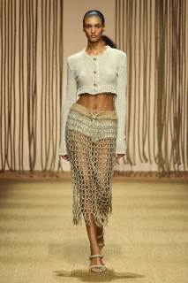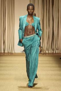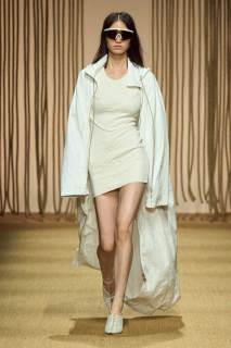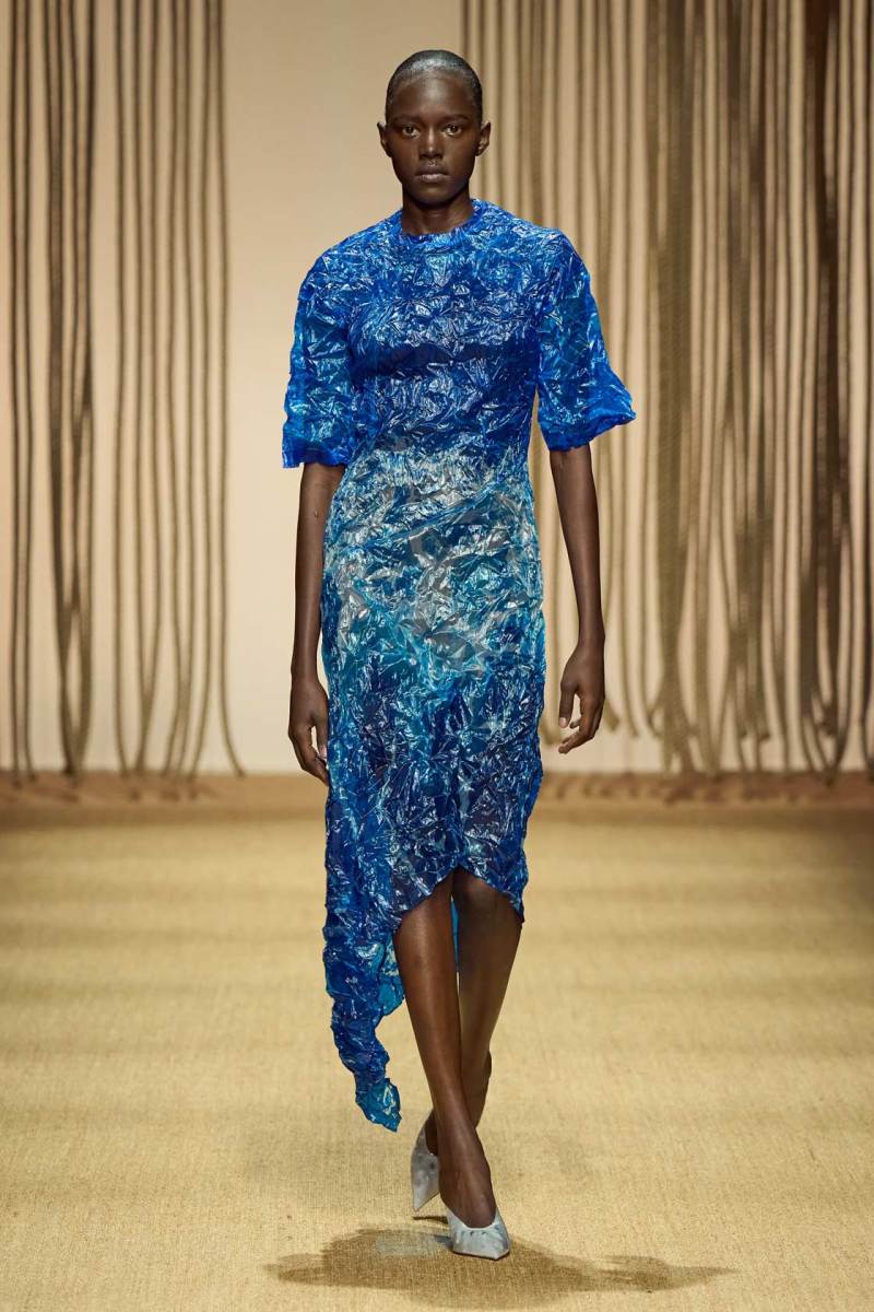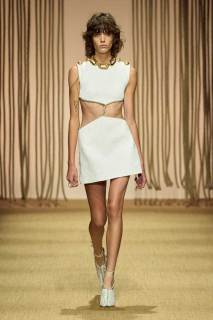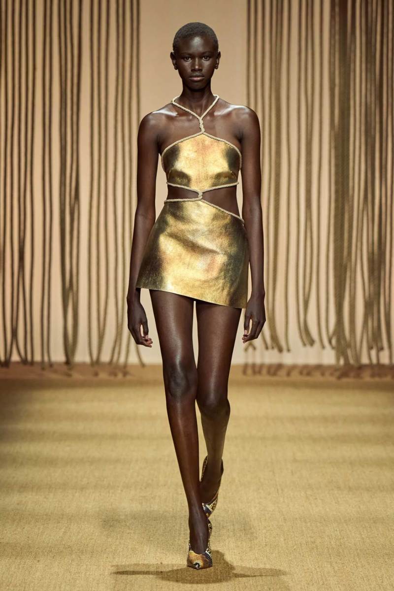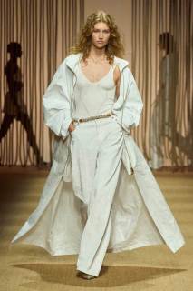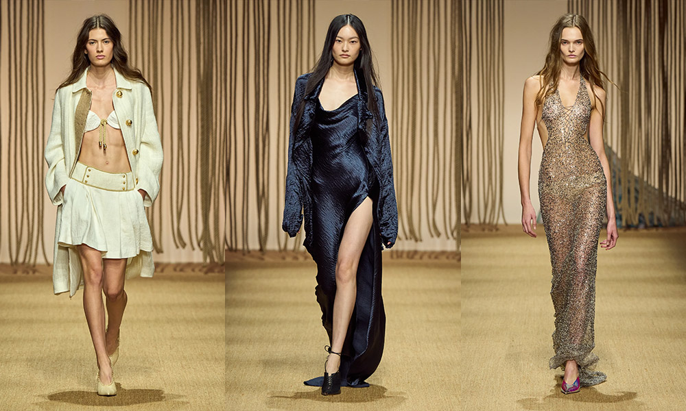 Gli outfit che sfilano in questa collezione rappresentano, quindi, il tema del mare. Il primo look ci viene presentato con un ensemble bianco, legato da un gioiello in argento sul davanti, con una collana grande ad anelli. Così, capiamo subito come il bianco faccia da sfondo alla prima parte della sfilata, richiamando inevitabilmente la spuma delle onde del mare. La collezione verte su abiti asimmetrici, top e pantaloni abbinati con trench, gioielli in oro (in abbondanza) uniti, poi, a corpi sensuali; i quali risultano essere i veri protagonisti di questa sfilata a porte chiuse.