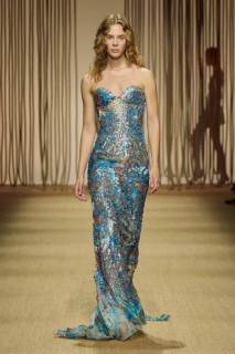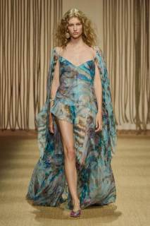 I vestiti sono trasparenti, a retina, sensuali ma eleganti, rispettando così i valori del brand a 360 gradi. Le modelle emergono dalla passerella come sirene in movimento, ammalianti e accattivanti pronte a sedurre l’audience, come se questa si trovasse a bordo di una nave. Gli altri toni invece, introdotti man mano, riprendono le nuances dell’oro e del marrone, sempre richiamando lo stile animalier del suo stilista. Ma, improvvisamente, ecco comparire dei vestiti che si accendono come tramonti all’orizzonte, intervallati da sprazzi di colore come nel caso degli abiti fucsia e di quelli multicolore. Anche in questo caso non mancano gli abiti di seta scivolati, scuri e di color nero petrolio. Infine, compare anche la palette del blu, dell’azzurro e dell’acquamarina, insieme alle gemme e alle altre preziosità del mare che vengono destinate ad un effetto sorpresa.