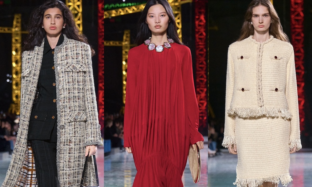 Il tweed, da sempre simbolo Chanel, torna protagonista ma con proporzioni e lavorazioni nuove.