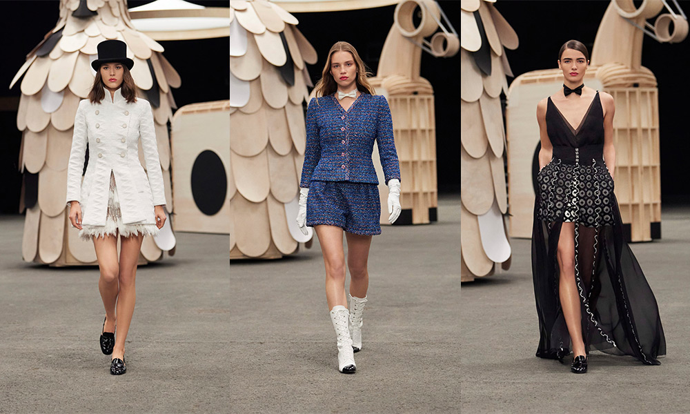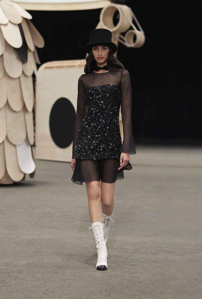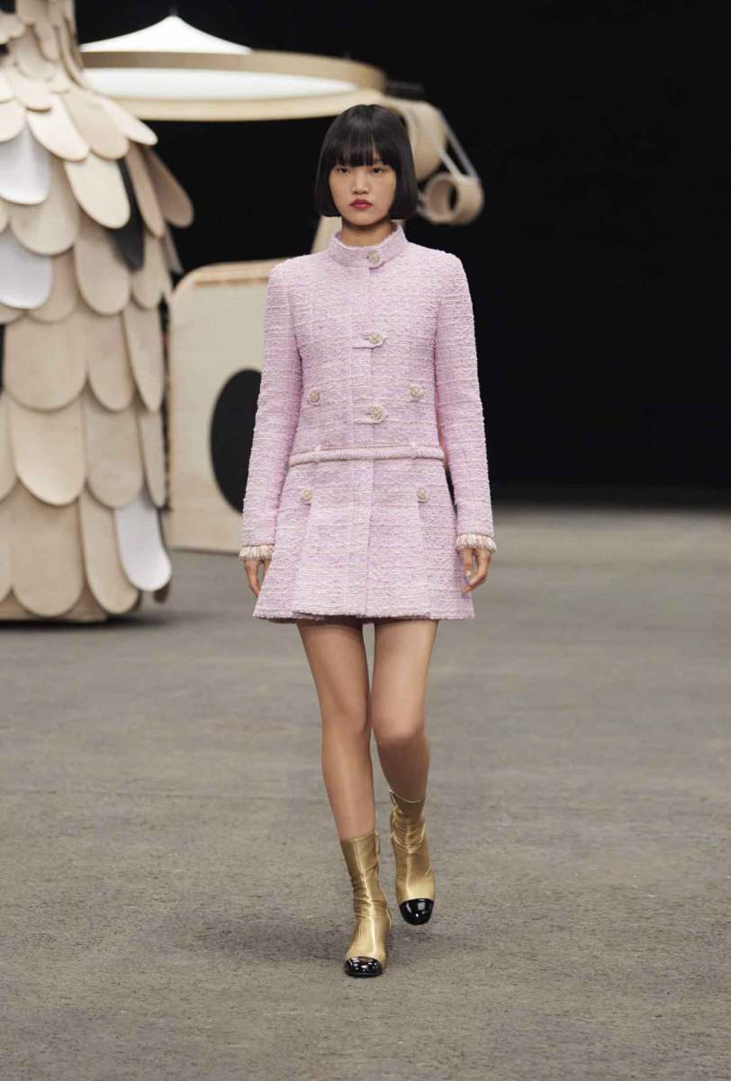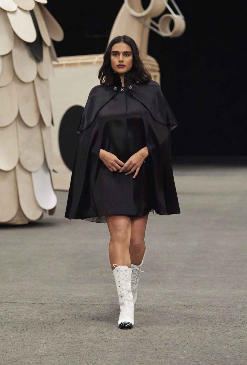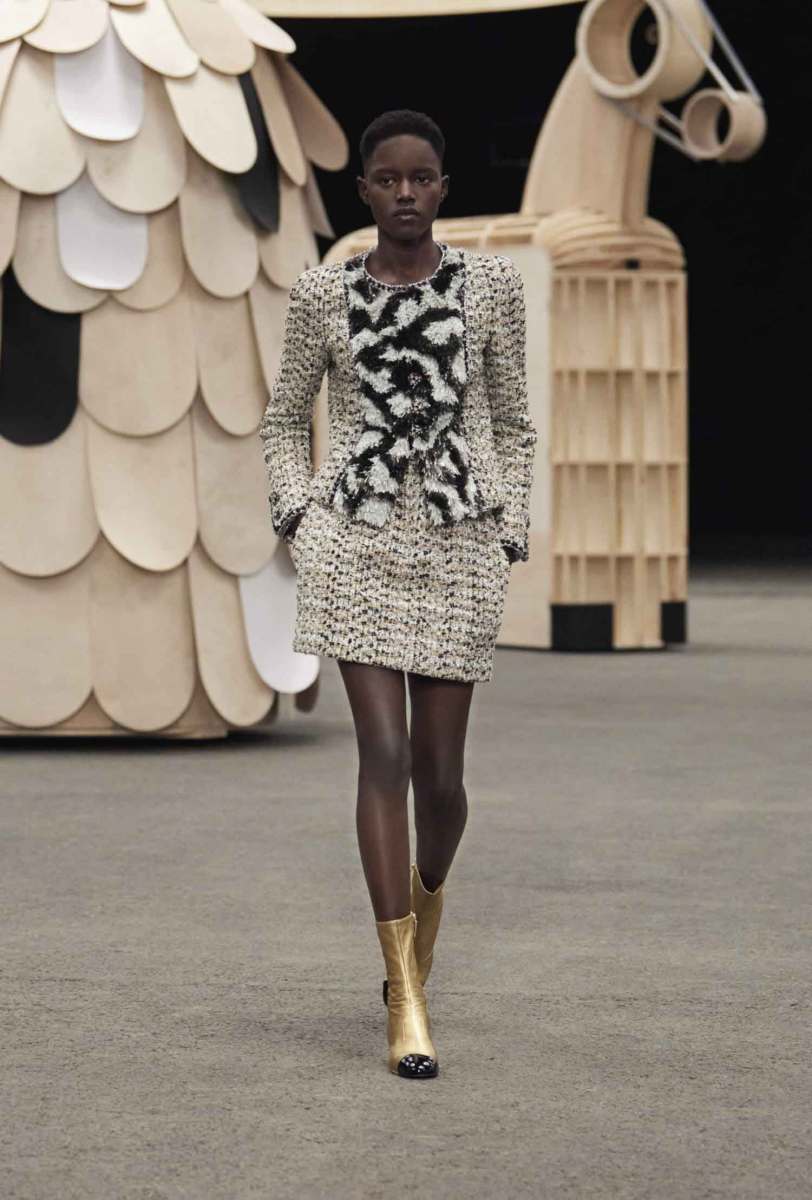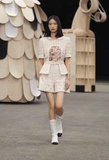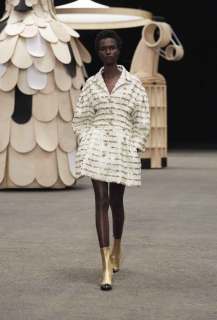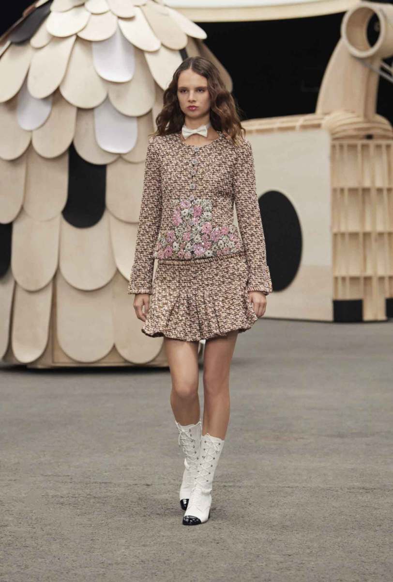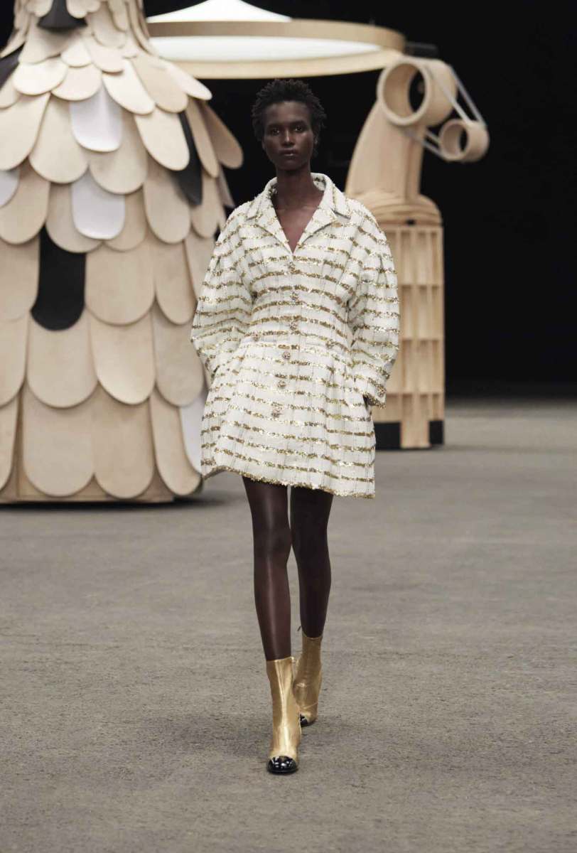 I completi proposti da Chanel per la sua nuova collezione Primavera/Estate 2023 riprendono le uniformi femminili utilizzate negli spettacoli e nelle parate. Cappelli, cravatte, guanti bianchi, stivali con lacci, mantelli di raso, gonne plissettate, cappotti a doppio petto, camicie smoking, inserti in paillettes e sottovesti. L’ispirazione di questa nuova linea Haute Couture arriva anche dalla poesia delle majorettes.
