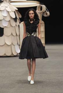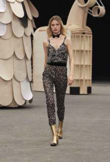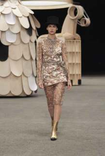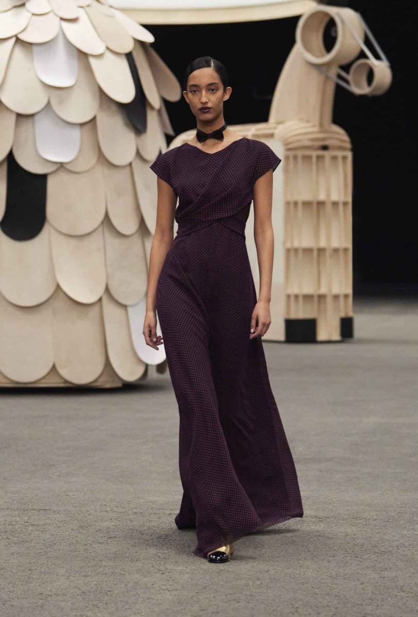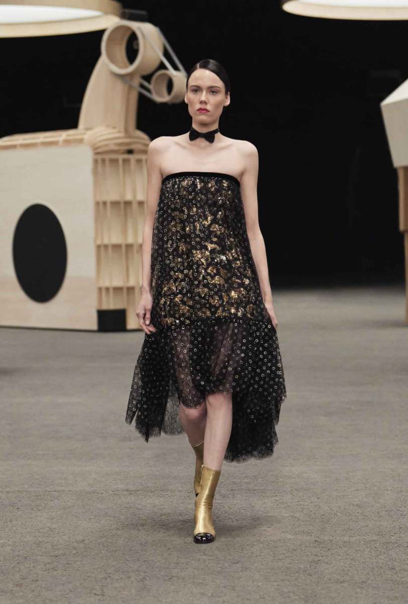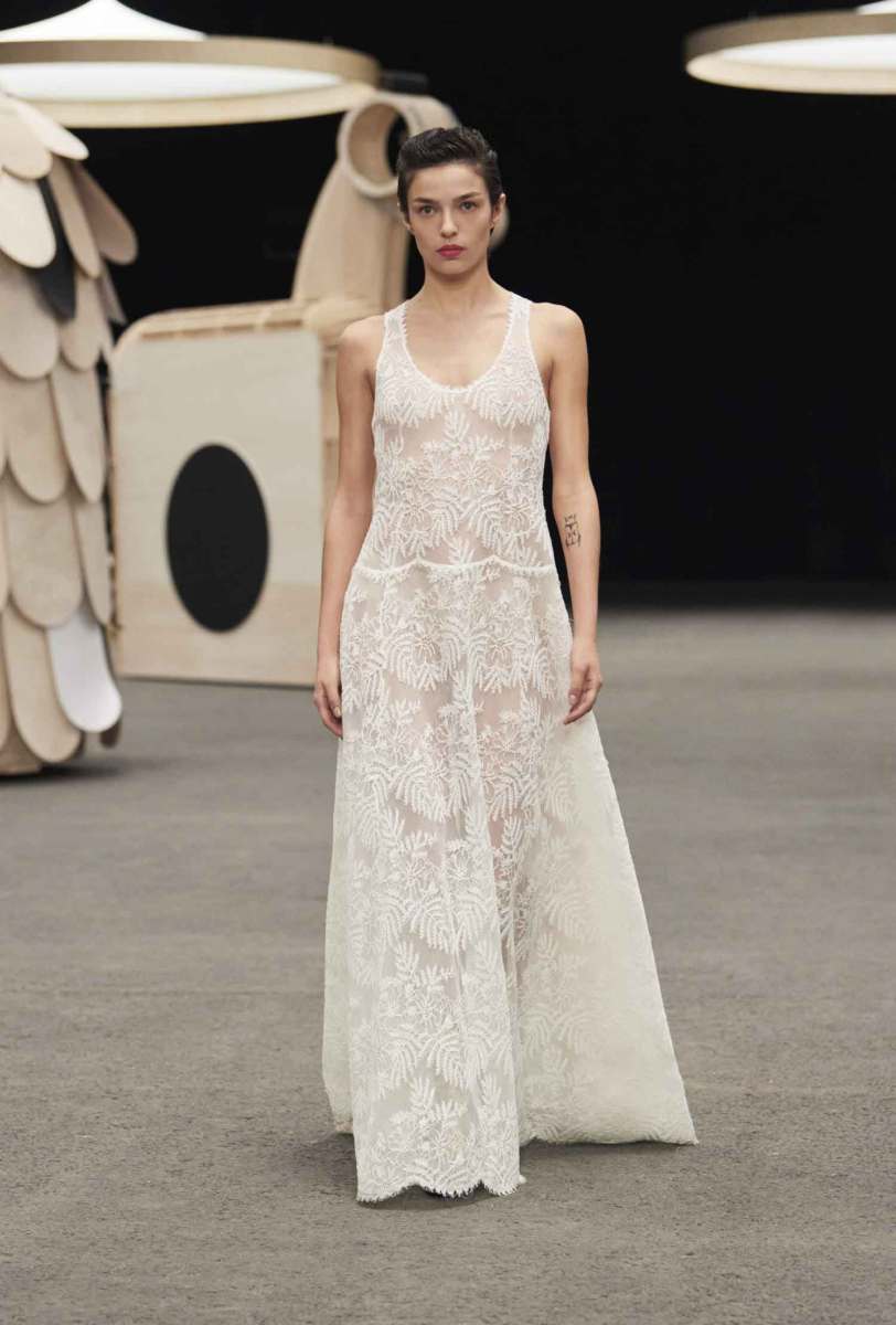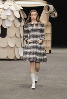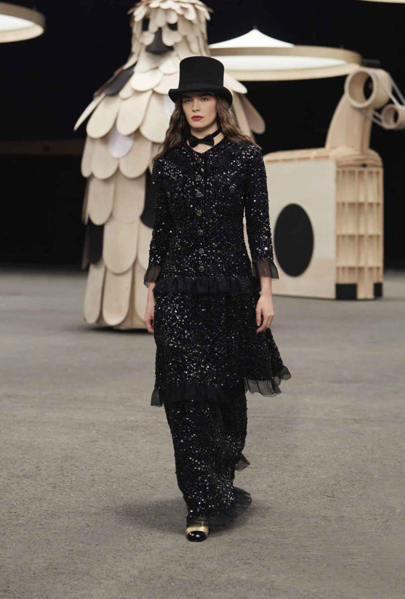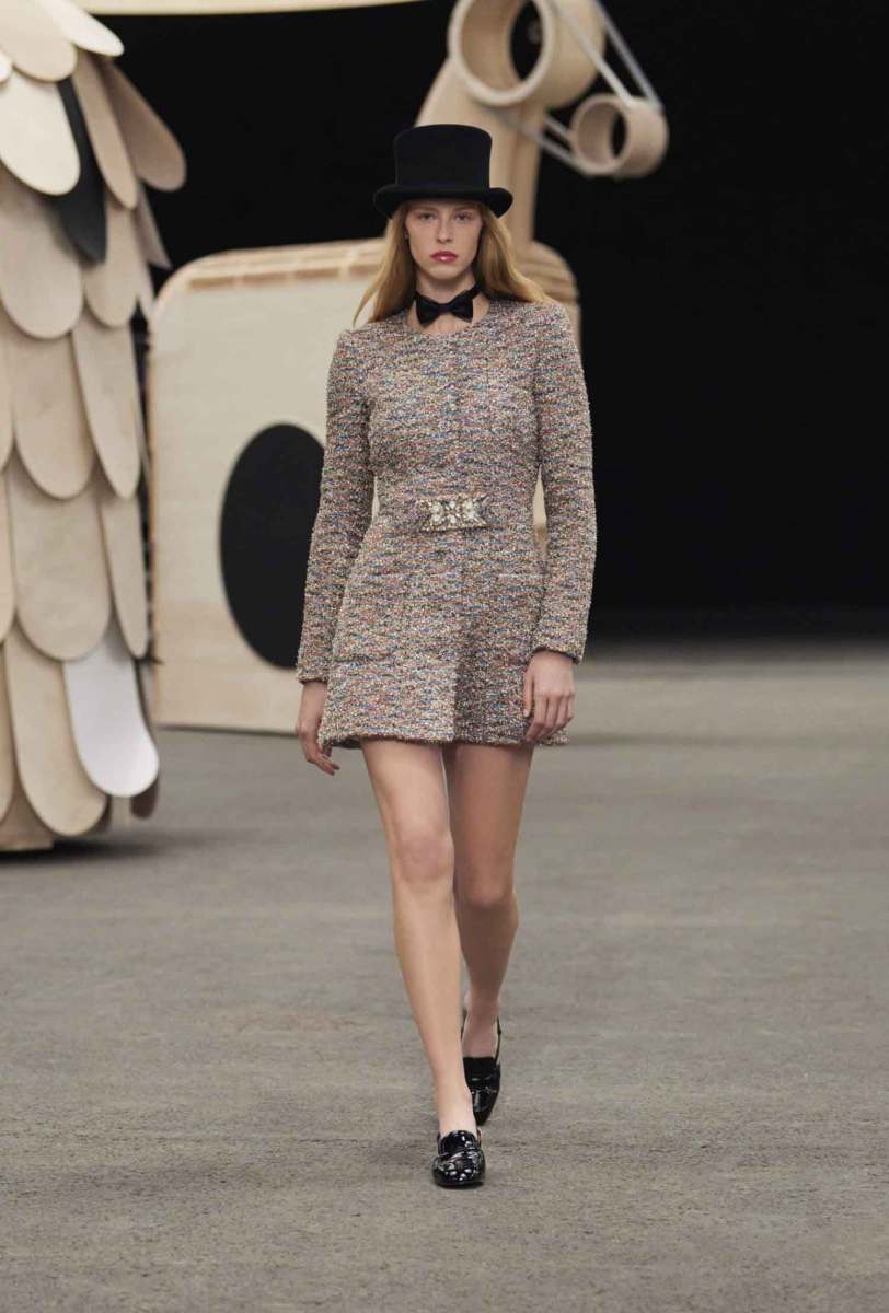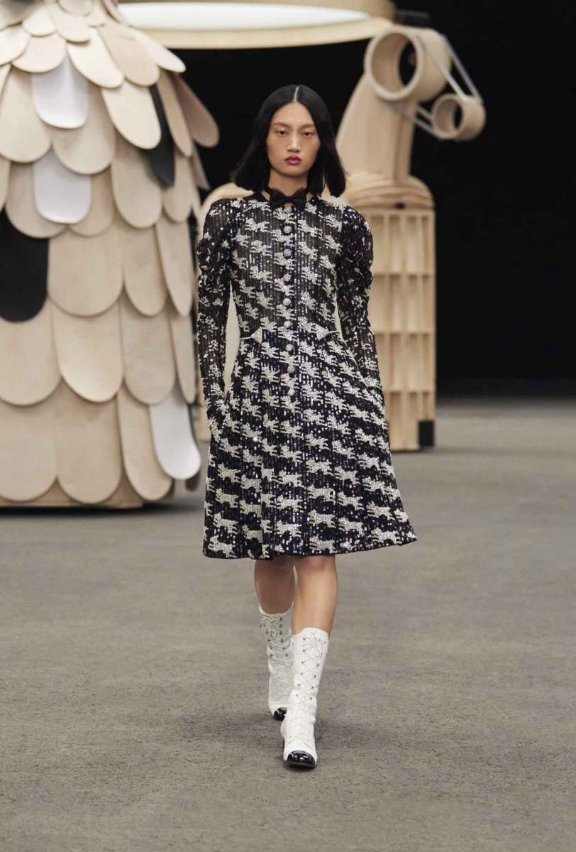 I completi proposti da Chanel per la sua nuova collezione Primavera/Estate 2023 riprendono le uniformi femminili utilizzate negli spettacoli e nelle parate. Cappelli, cravatte, guanti bianchi, stivali con lacci, mantelli di raso, gonne plissettate, cappotti a doppio petto, camicie smoking, inserti in paillettes e sottovesti. L’ispirazione di questa nuova linea Haute Couture arriva anche dalla poesia delle majorettes.