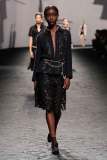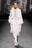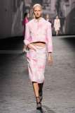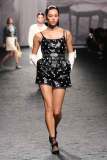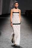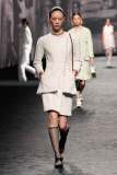 La SS23 di Chanel è una collezione leggera, sofisticata. Virginie ha qui unito tradizione a modernità in una serie di look attuali ma 100% Chanel. Sfilano tailleur a miniabito, giacche cropped, shorts in seta e coordinati a pois. L’elegante palette di colori pastello è arricchita talvolta da piume o strass. I gioielli sono un punto costante nella collezione: ogni look è ricco di vistosi orecchini, abbondanti giri di collane di perle o scultorei bracciali. Preziose micro-borse pendono alla spalla o sono portate a mano. Non mancano i delicati tailleur a pantalone in tweed o con gonna midi, perfetta per ogni occasione. Rarissime le stampe in questa collezione, ma una nuova trama a camelia compare su alcuni capi, come l’abito indossato dalla bellissima Irina Shayk. La collezione si conclude con lunghi abiti da sera semplici e scivolati, accompagnati – come tipico di Chanel – dalle classiche slingback: una costante in tutta la collezione.