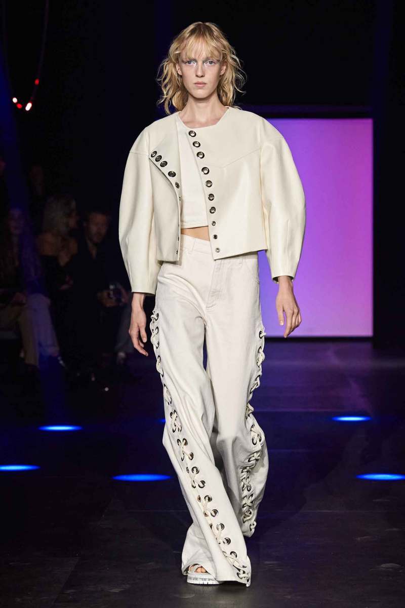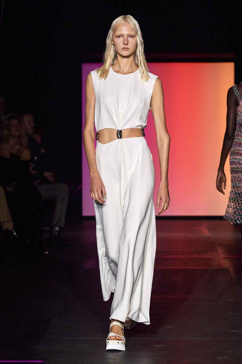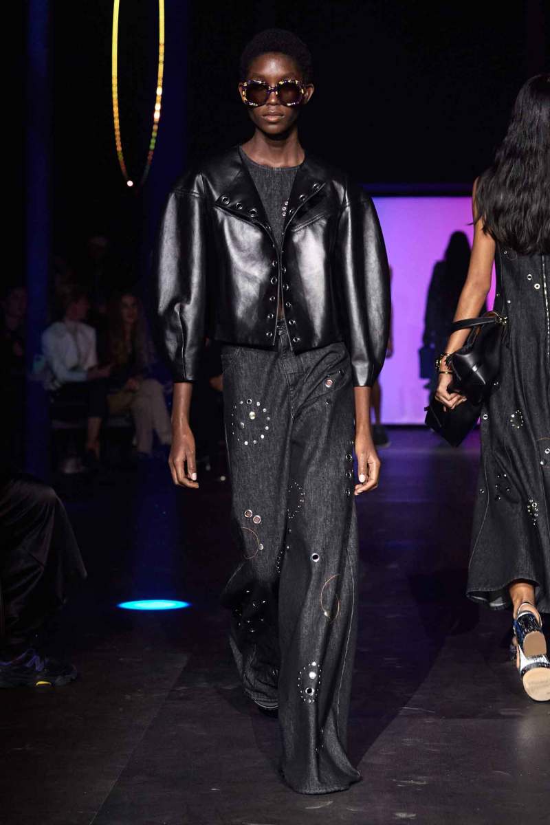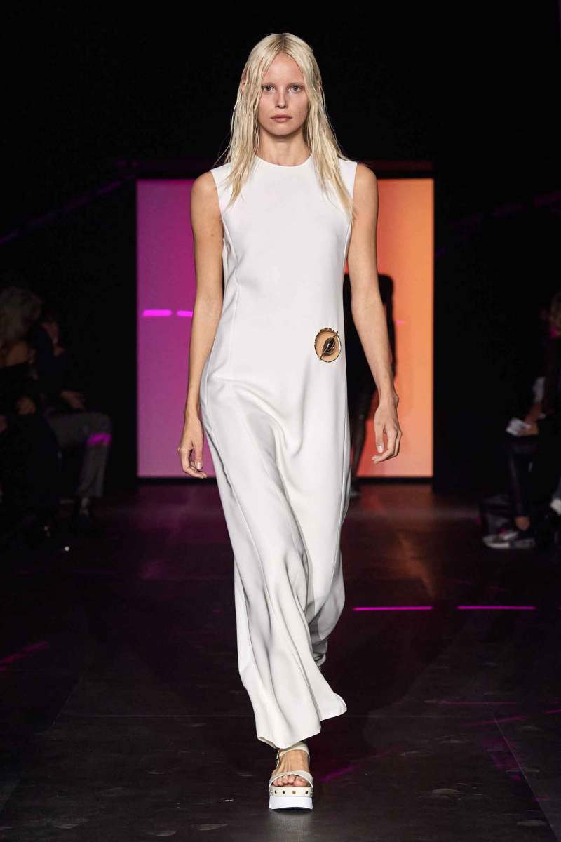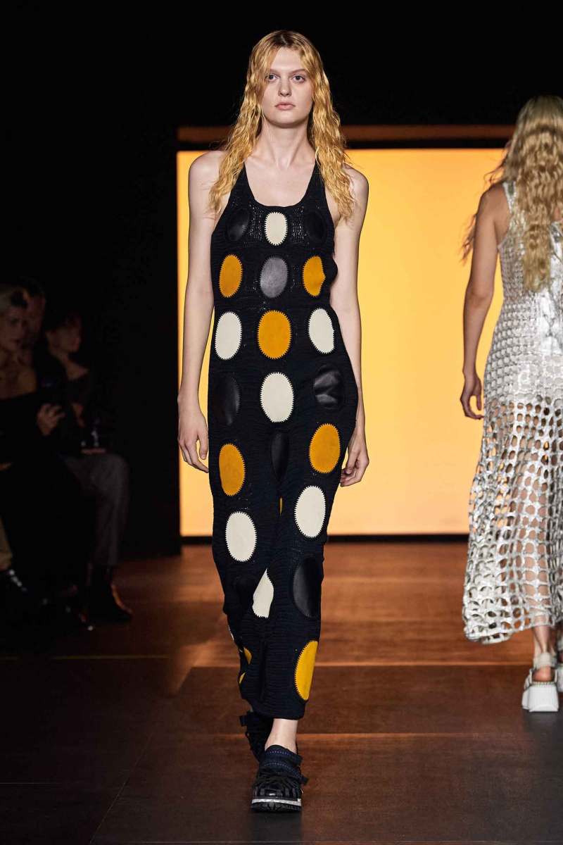 Giallo acceso, arancione, fucsia, nero e bianco hanno ispirato e colorato la nuova collezione Spring/Summer 2023 di Chloè. Si sono mischiate silhouettes circolari, pattern che ricordano planimetrie, vestitini in jersey, maglierie circolari e l’iconicissimo outfit casual femminile.
