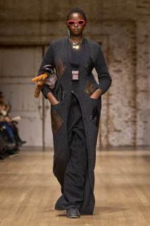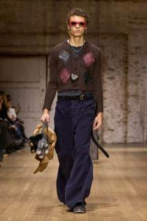 Il punto di forza della collezione è senza dubbio l’outerwear, con bomber rielaborati, trench in montone dall’effetto vissuto e cappotti in pelliccia sintetica leopardata che aggiungono profondità e carattere. Le lavorazioni artigianali emergono nei dettagli: motivi argyle, tessuti consumati e maglie in lurex evocano un fascino vintage, mentre felpe dal sapore vissuto e negligé elaborati introducono un tocco romantico.
