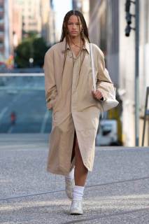 A portare ulteriore attenzione sulla sfilata è stata la presenza di Ella Emhoff, figliastra di Kamala Harris e figura molto amata dalla Gen Z per il suo stile poliedrico e la sua attenzione alla sostenibilità. Sul catwalk di Coach, ha indossato la t-shirt ‘I love NY’ abbinata a un blazer oversize in pelle e una miniskirt, completando il look con una borsa a forma di dinosauro e i suoi iconici occhiali da vista, perfettamente in sintonia con lo spirito della collezione.