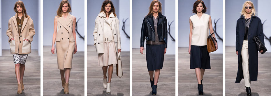 Forti contrasti tra abitini e dress in pelle e sovrapposizioni importanti di cappotti, blazer e giacche. Trussardi gioca sapientemente su lunghezze contrapposte, i cappotti nascondono gonne ad altezza ginocchio fungendo da abiti coprenti ,è in risalto la precisione sartoriale e l’esperienza stilistica più che affermata tra i ‘’big’’ dell’alta moda. I colori sono nero, blu, marrone, beige e bianco, come le vere upper-girl di una volta insegnano.