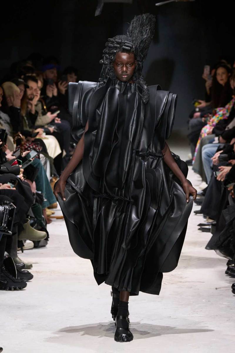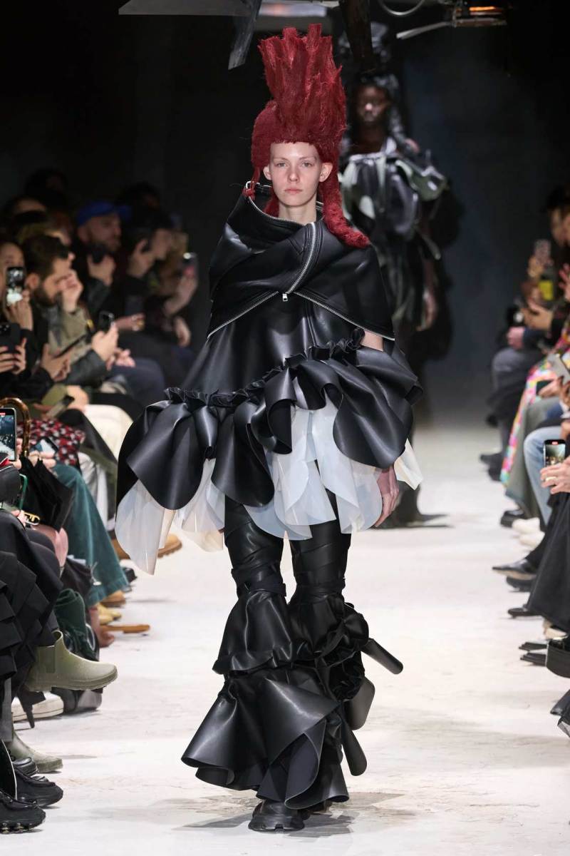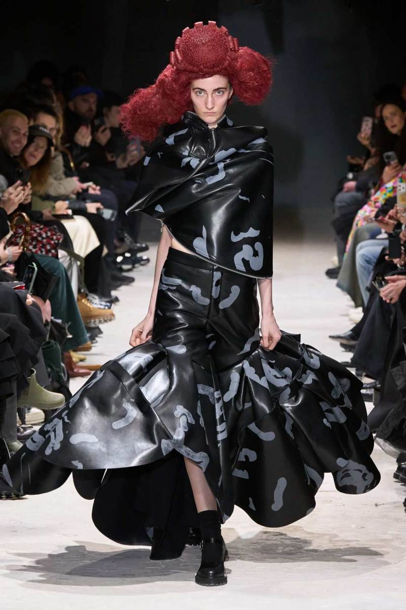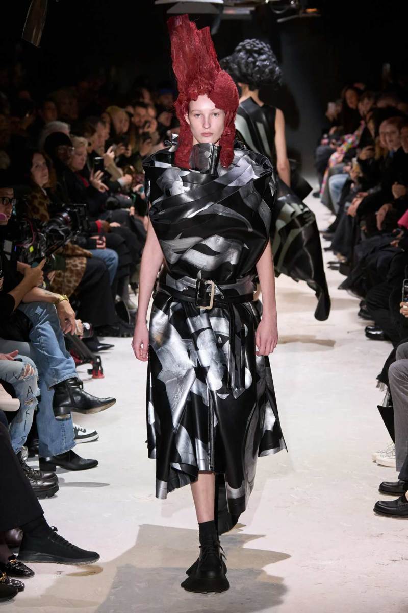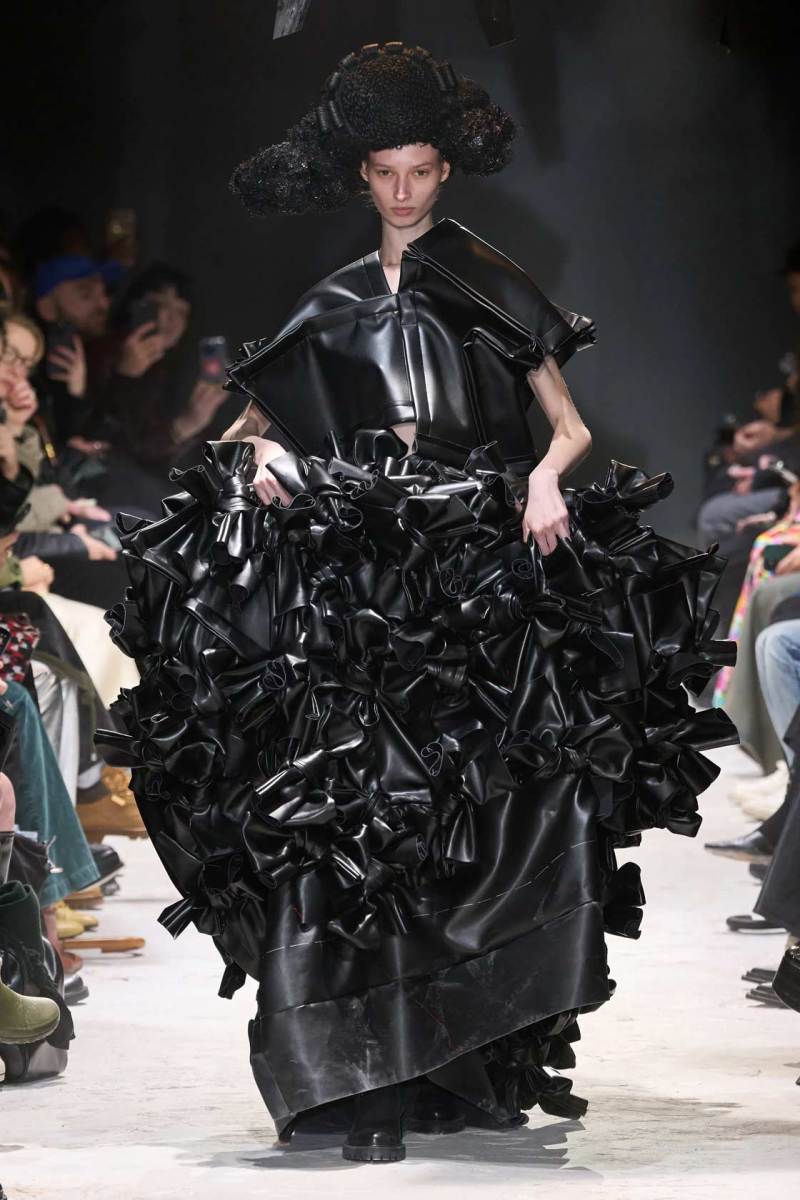 La protesta di Comme des garçons fa eco sugli abiti neri e solidi, scuri, molto seri, nei materiali resistenti e in elementi quali catene e filo spinato, mentre la poca speranza che rimane è sprigionata da un atteggiamento più romantico e da capi che provano a illuminare il presente. La moda di Comme des garçons non è passiva, non accetta la realtà del mondo così com’è. Una moda dall’animo arrabbiato, che vuole reagire.