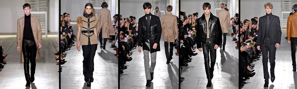 Tra i capispalla sfilano trench doppiopetto con bottoni automatici in acciaio, giacche corte doppiopetto o di ispirazione militare ricoperte di strass termo adesivati, spencer e frack con bottoni di acciaio, un lungo cappotto piumato, giacche e cappotti customizzati con tasche patch in suede o pelle.