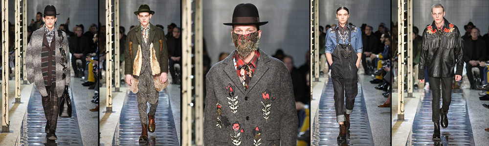 La sfilata per l’Autunno/Inverno 2016-17 si svolge attorno alla struttura stilizzata di un fienile illuminato da piccole luci, ed è accompagnata dalle note di “Personal Jesus” di Johnny Cash, cui seguirà un medley di cover dello stesso brano. Sfilano una schiera di cowboys metropolitani, vestiti con completi di tweed e velluto, kilt e pantaloni in tartan, ampi cardigan e maglioni melange decorati. Tra i capispalla spiccano cappotti con inserti in pelliccia, giacconi a quadri e giubbini da biker in pelle con frange o in stampa pitone. Pare di vederli uscire da un saloon, da un rodeo o solcare le strade polverose dell’ovest con la bandana a coprire il volto.