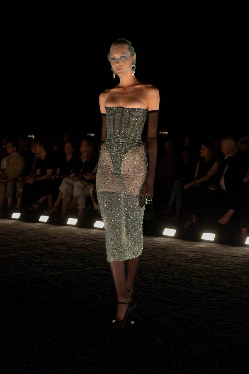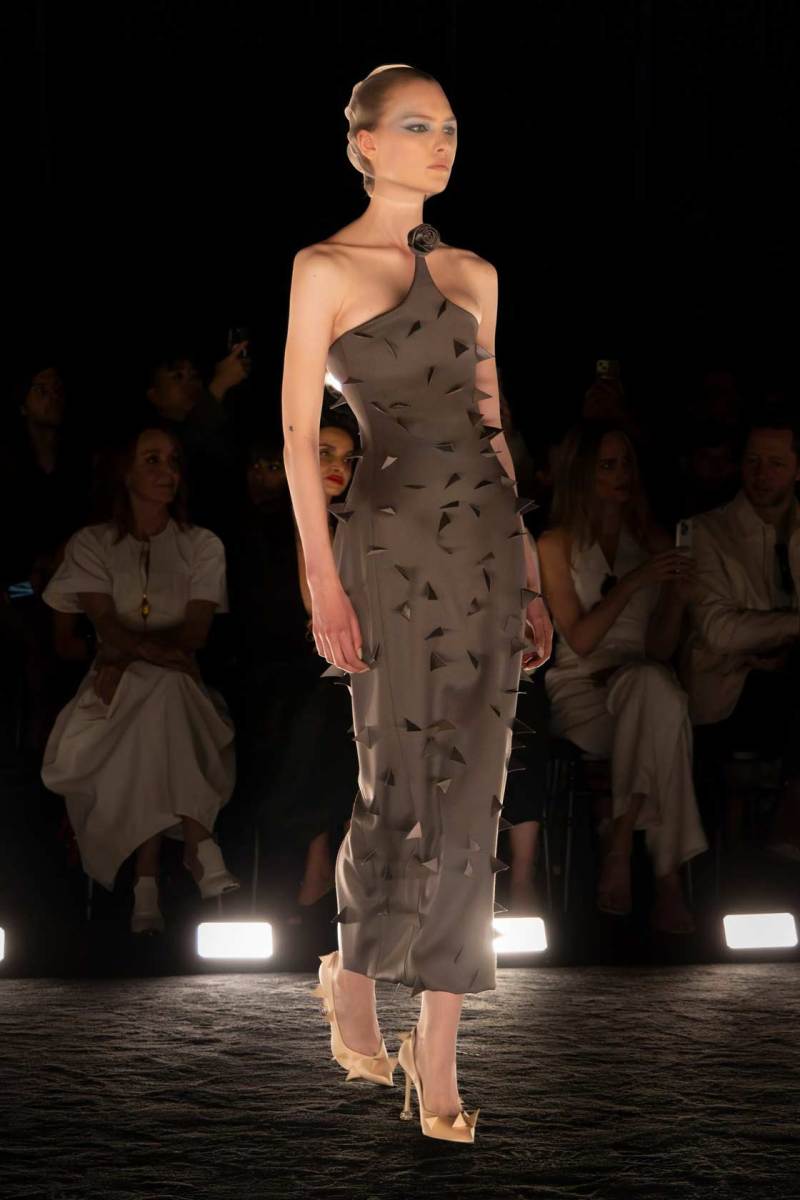 Tra i capi presentati, un abito robotico ricoperto di cristalli Swarovski e chip elettronici riciclati, ha suscitato particolare ammirazione. Questo capo, che sembra caduto dallo spazio, incarna perfettamente il tema cosmico della collezione. Altro pezzo straordinario è un abito ricoperto di paillettes, cristalli e strass, che ha chiuso la sfilata con un’esplosione di glamour e creatività: il riassunto perfetto di una serata frenetica con dettagli come sigarette sfuse, smalto per unghie rovesciato a formare la scritta – Schiaparelli – e gioielli sparsi su tutta la superficie.