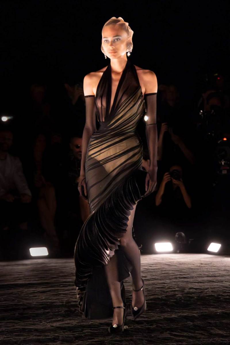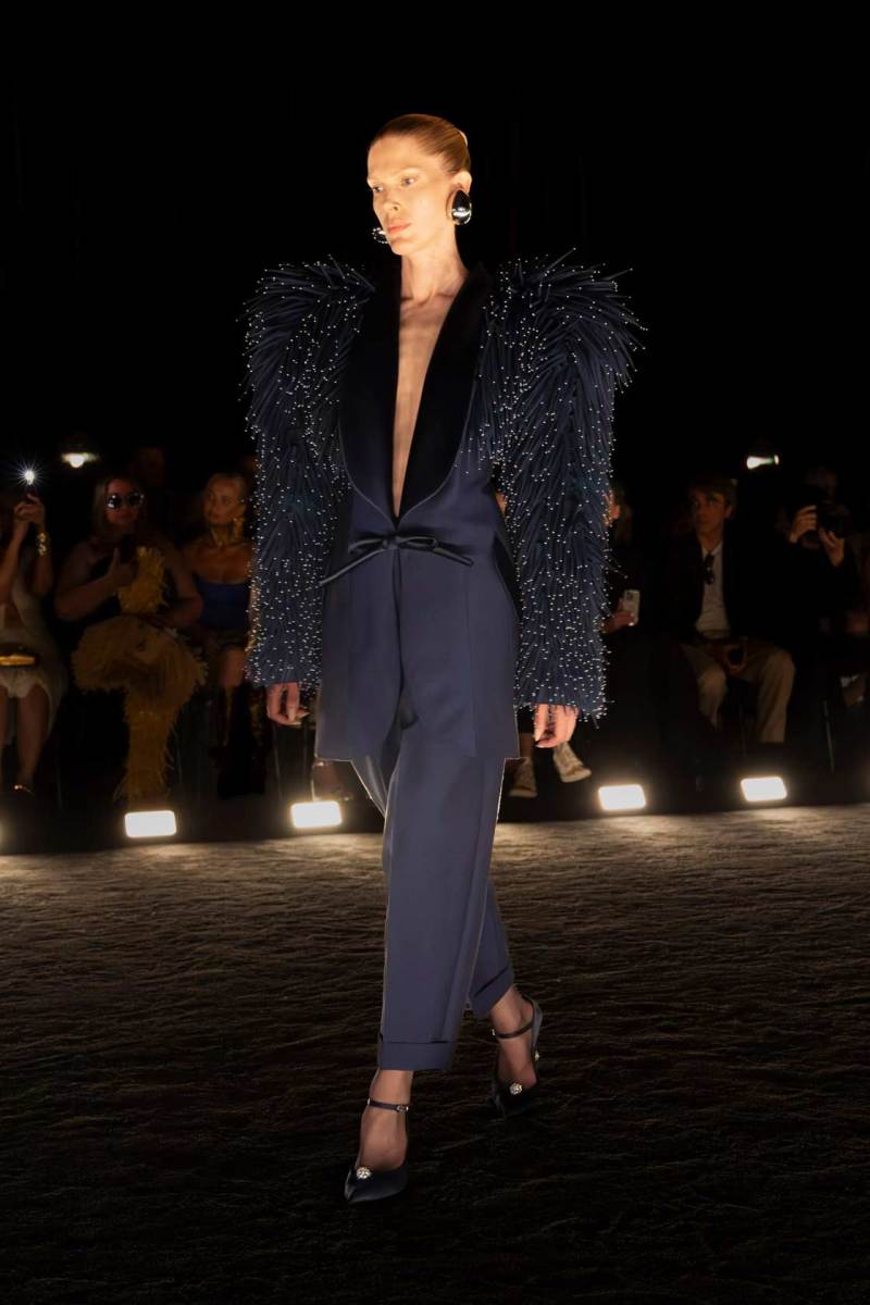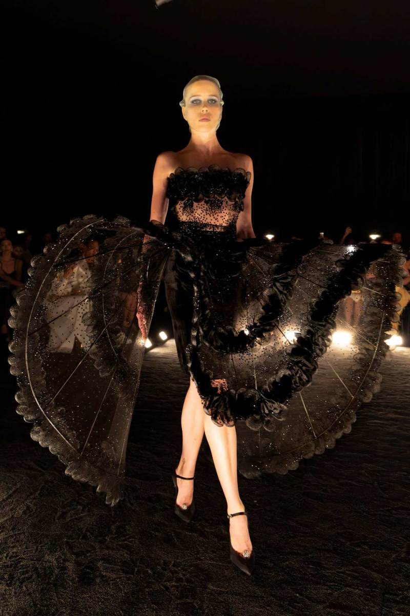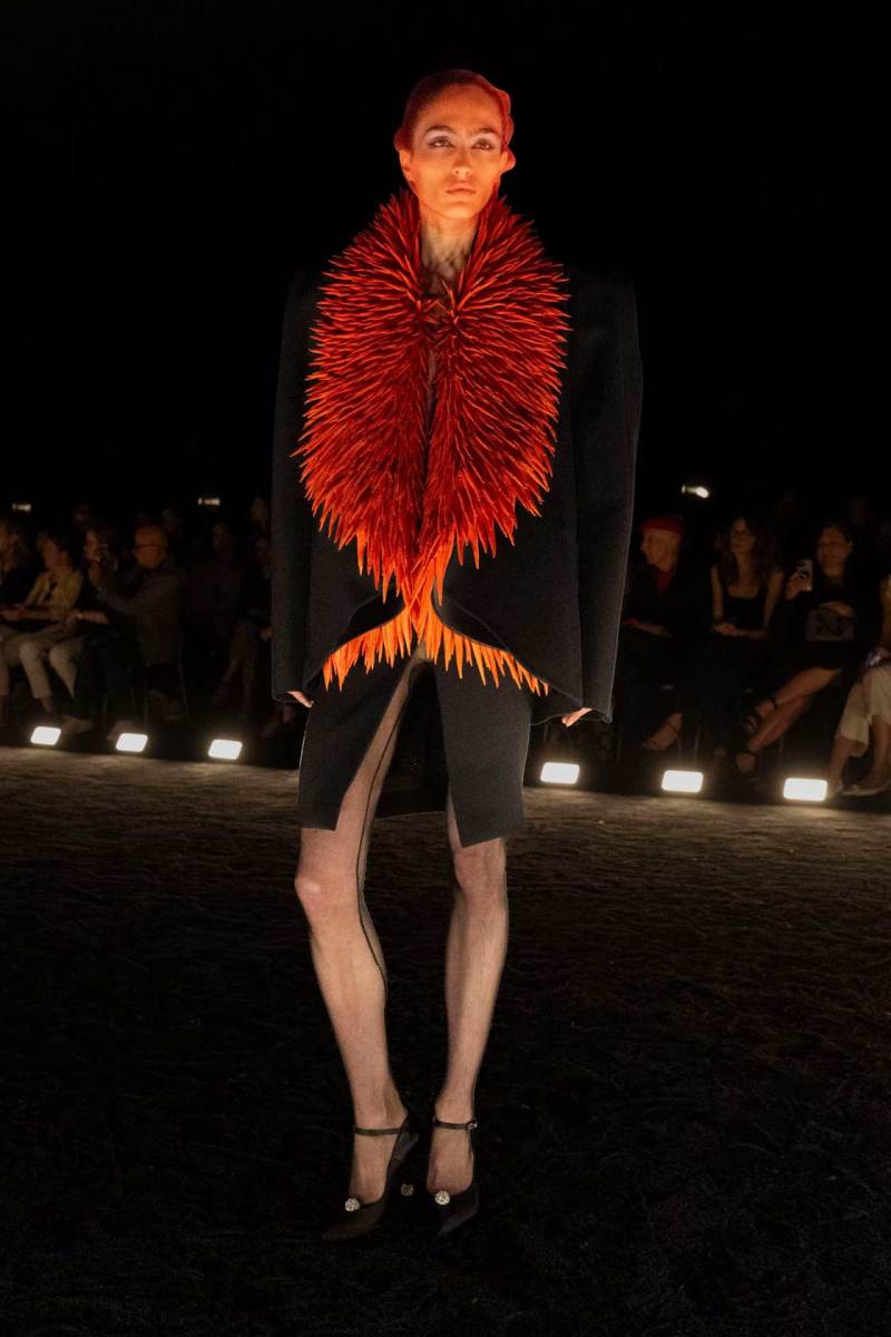 Uno dei momenti più emozionanti della sfilata è stato il ritorno dell’iconico abito scarpa e del motivo aragosta, un omaggio al celebre abito dipinto da Salvador Dalí per Elsa Schiaparelli. In questa nuova versione, Roseberry ha introdotto aragoste tridimensionali come elementi decorativi, utilizzando anche il colore arancione come filo conduttore della collezione. Questi elementi simbolici hanno catturato l’attenzione degli spettatori, rendendo omaggio alla storica collaborazione tra la Maison e l’artista surrealista.