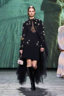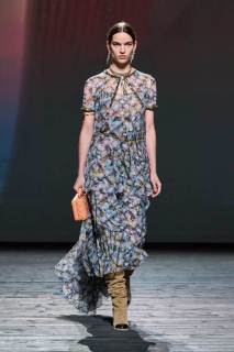La palette della collezione si è ispirata alle tonalità pastello della malva, dell’arancio e del blu pallido. Gli abiti-lingerie color avorio sono stati seguiti da abiti romantici in chiffon a balze, evocando il movimento delle onde e del vento.