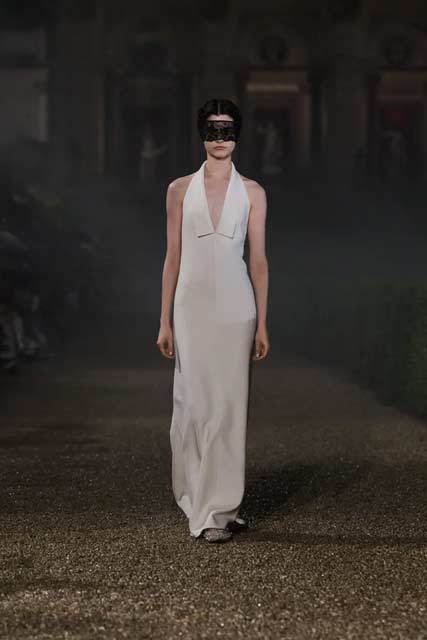 Il défilé si apre con una serie di abiti total white, omaggio a Le Bal Blanc, leggendario ballo mascherato organizzato dalla contessa Mimì Pecci Blunt. Socialite e mecenate, Blunt fu figura chiave nella Roma artistica del Novecento, così come nel Teatro della Cometa, oggi restaurato proprio da Dior. La collezione ne rievoca il fascino sofisticato e cosmopolita, alternando lingerie d’epoca, trench scomposti e giacche da smoking rivisitate.