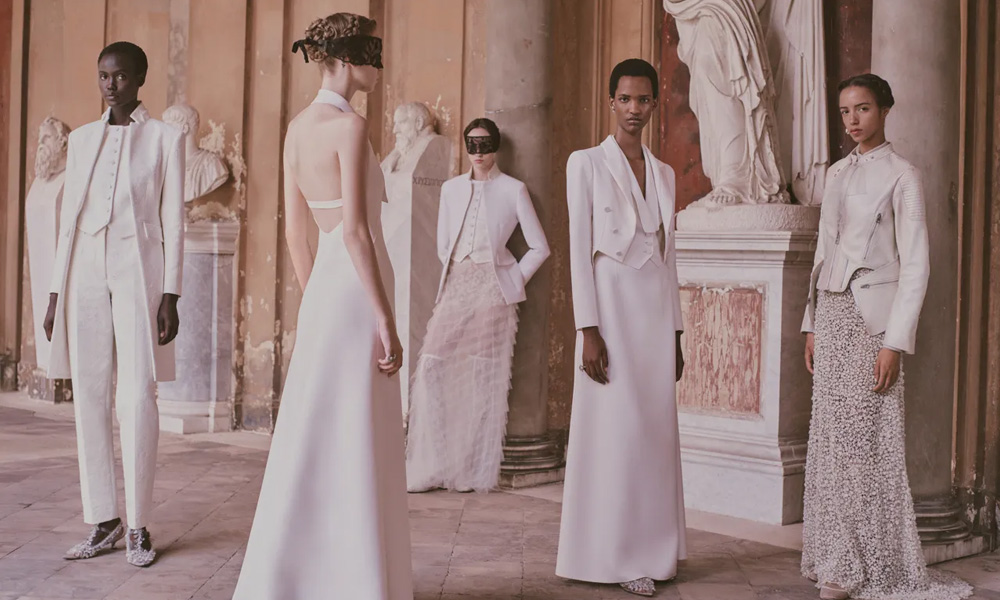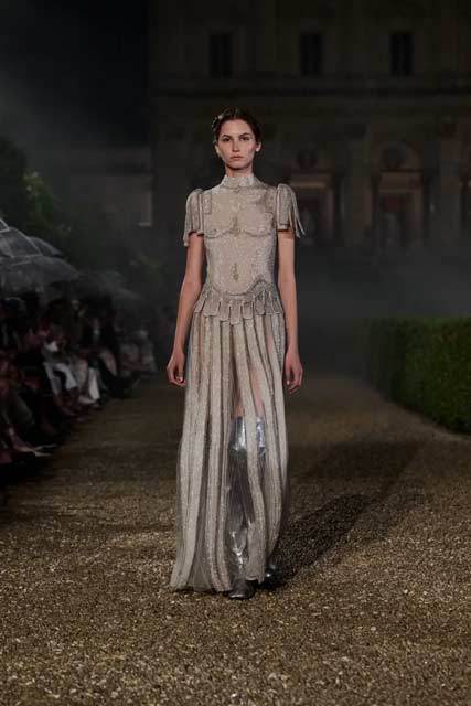 Dopo aver portato la maison Dior in giro per il mondo – dal Giappone al Messico, dalla Scozia all’India – la direttrice creativa sceglie un ritorno simbolico e personale: Roma, sua città natale, luogo dove le epoche si sfiorano e convivono. Qui prende vita una collezione che fonde haute couture e ready-to-wear in ottanta silhouette evocative, sospese tra Art Déco e Medioevo, tra tulle eterei e gilet perlati.