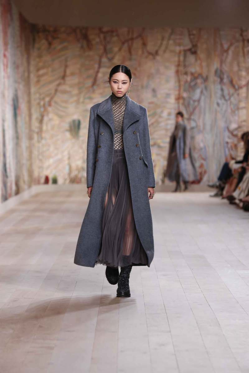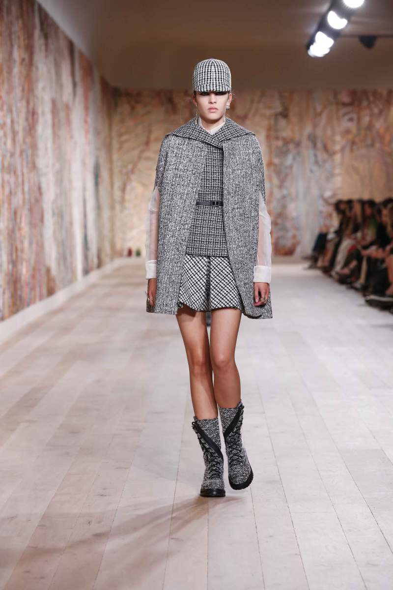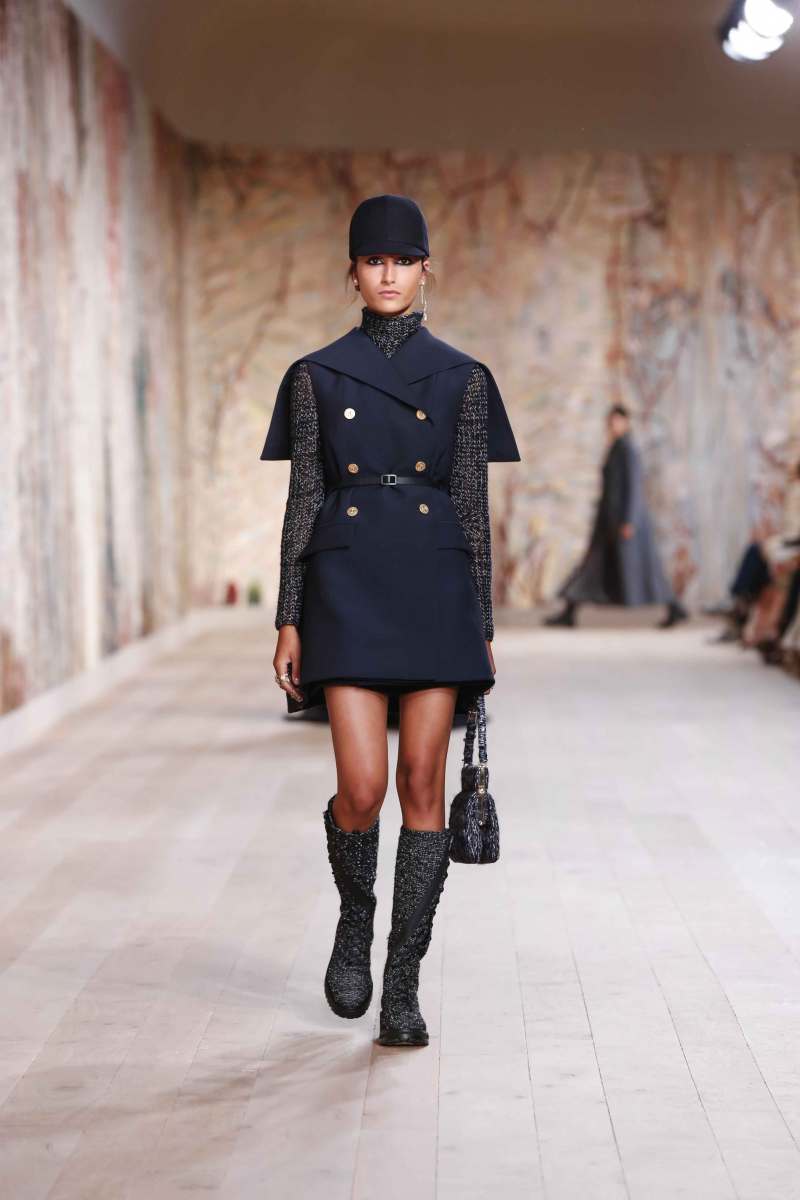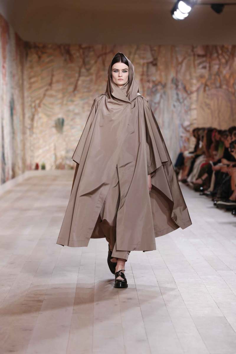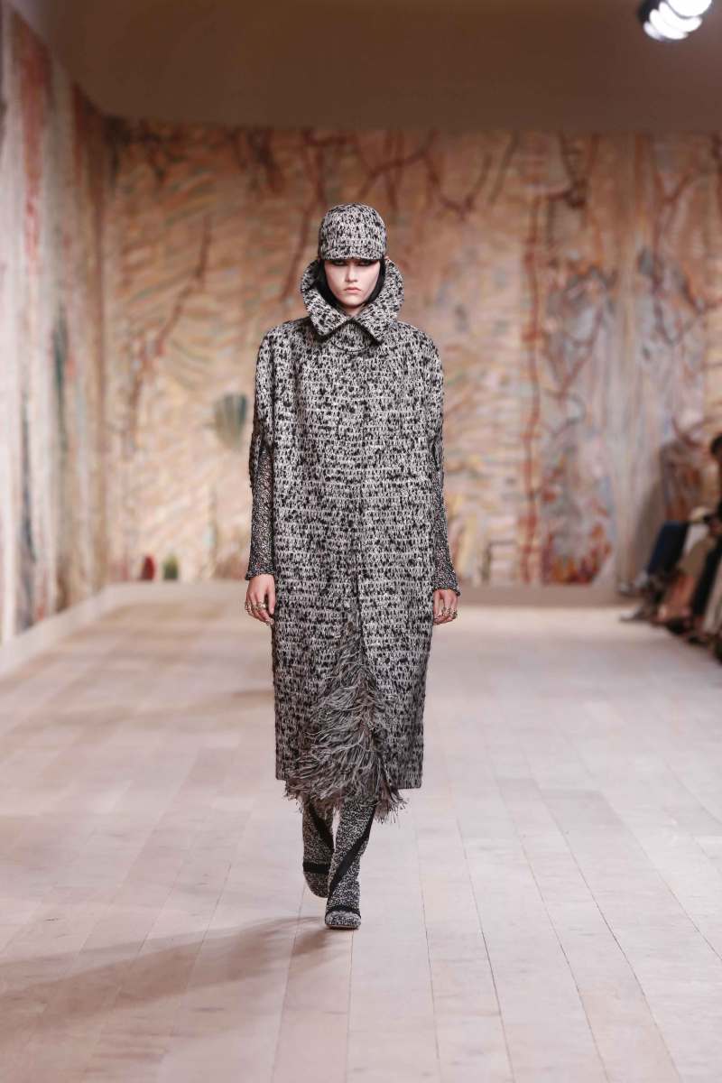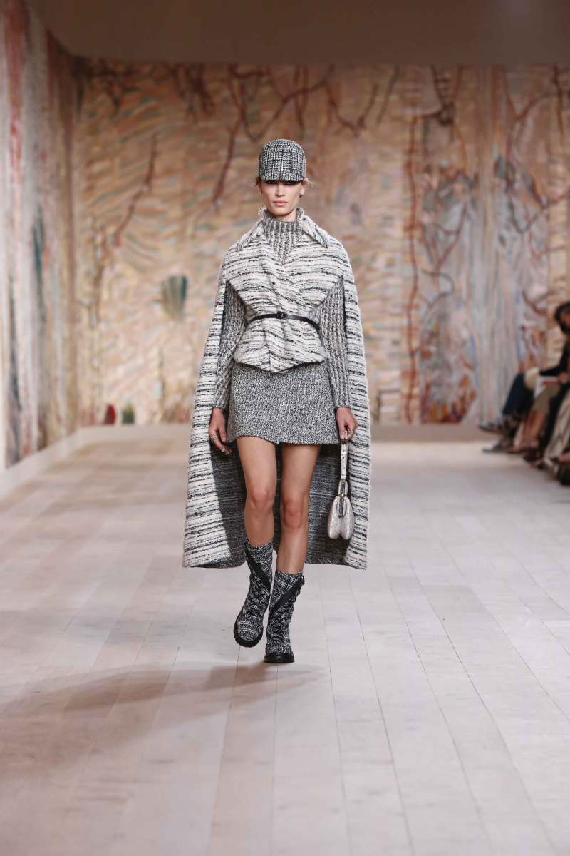Protagonista è sicuramente il ricamo particolare in tweed bouclé, che ricopre vestiti, cappotti, tailleur, gilet e capelli da cavallerizza. Persino gli stivali, rigorosamente alti, sono trapuntati in lana e da un gioco stravagante di lacci e cerniere. Dai cappotti lunghi e dalle stampe barocche, fatte di patchwork di più motivi insieme, si passa al semplice e pulito cappotto da giorno, in grigio con cintura in vita e ricami eleganti e lavorati. Il classico cammello non abbandona mai la scena, neanche sulle passerelle della Haute Couture, immancabile pezzo nell’armadio di ogni donna.