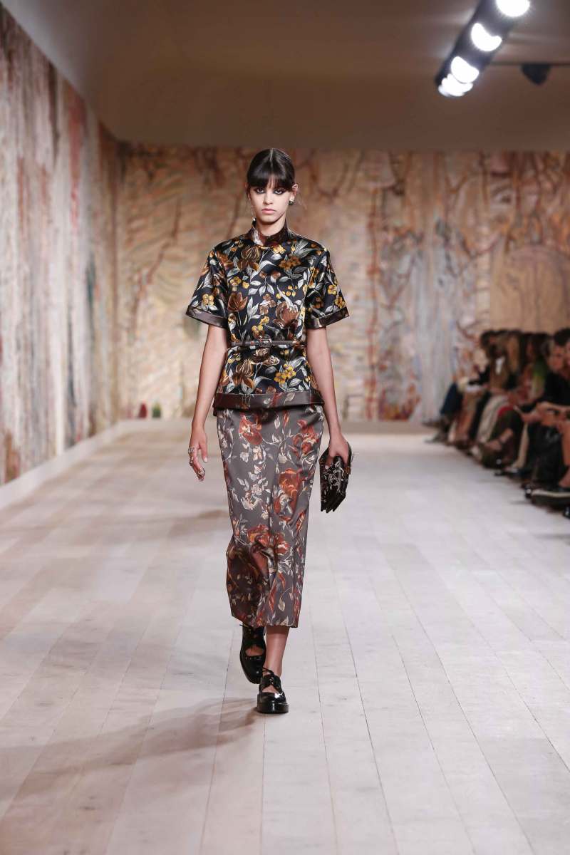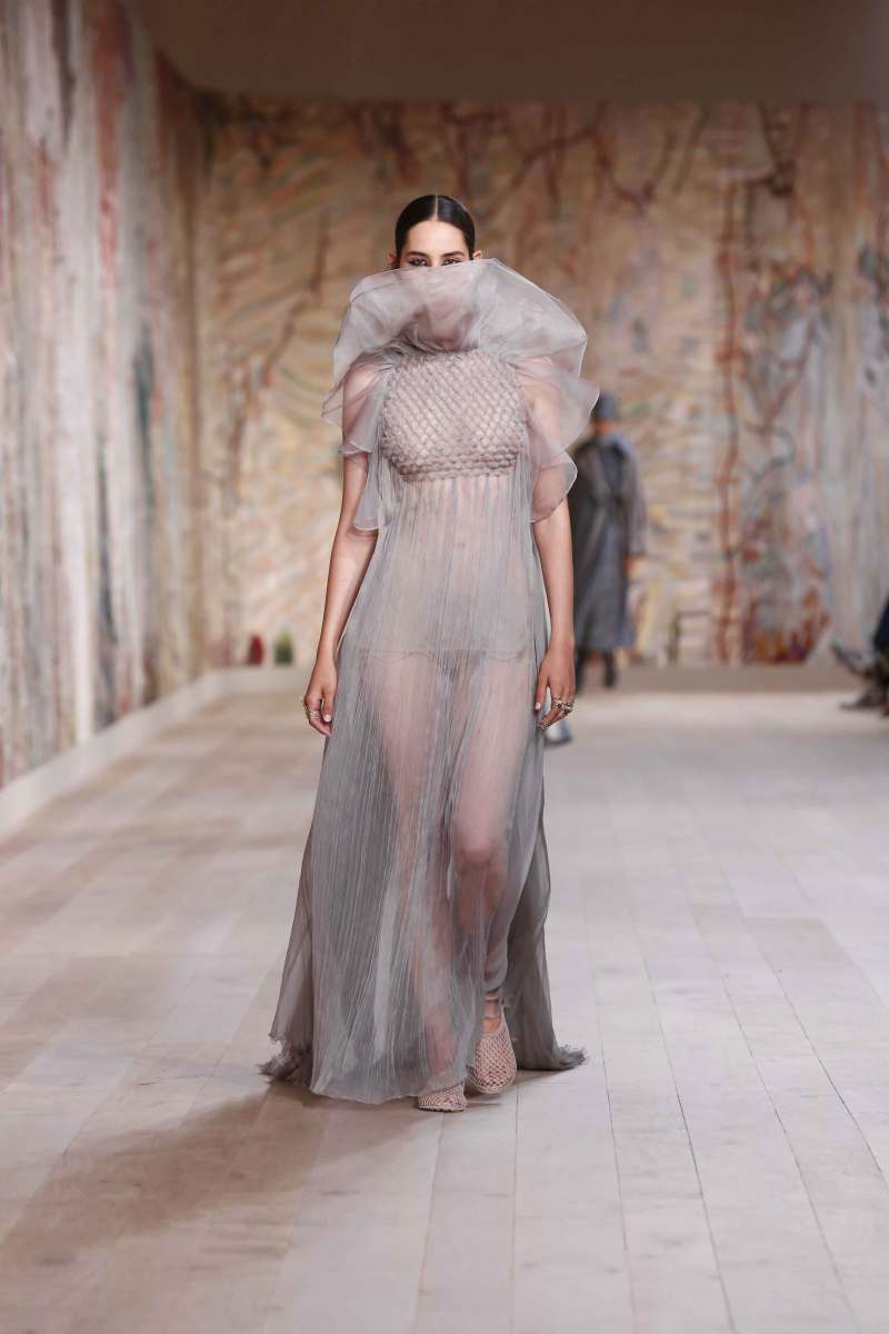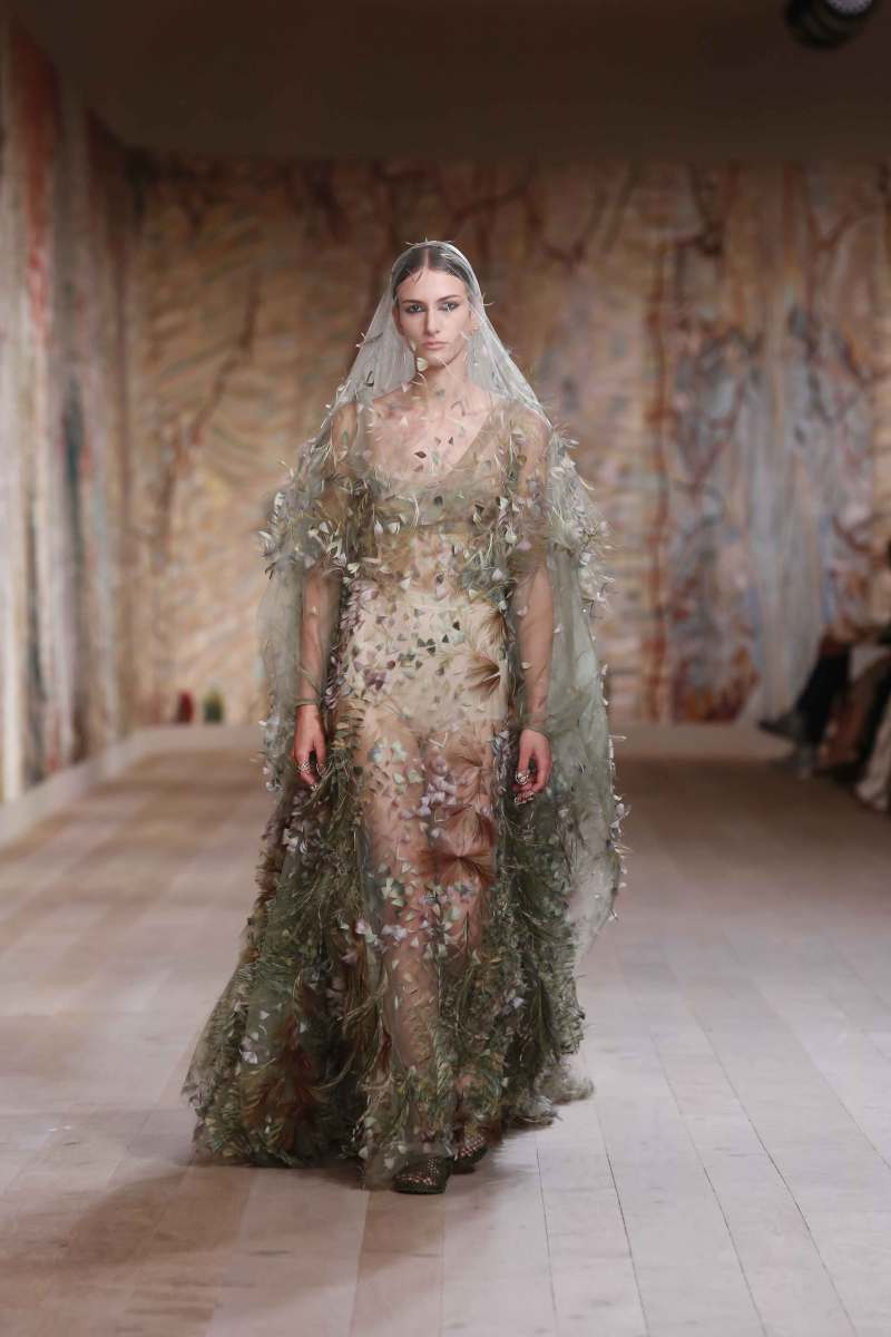 Il giardino del museo di Rodin ospita gli spettatori, questa volta fisicamente presenti, al défilé Haute Couture attesissimo della Maison Dior. Le pareti della sala sono state ricamate per l’occasione dall’artista Eva Jospin che, con un filo di seta, ha riportato i soggetti indiani presenti nei dipinti di una stanza di Palazzo Colonna a Roma. Ed è proprio dalla manualità, dalle mani esperte del sarto che parte la la filosofia di Maria Grazia Chiuri.