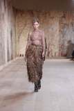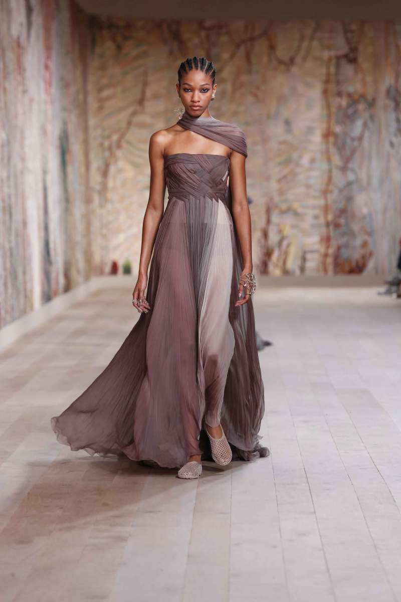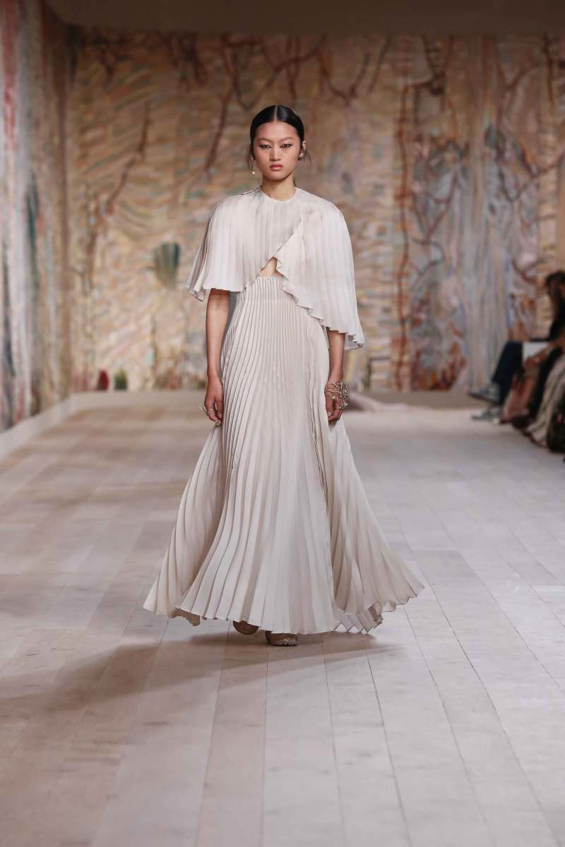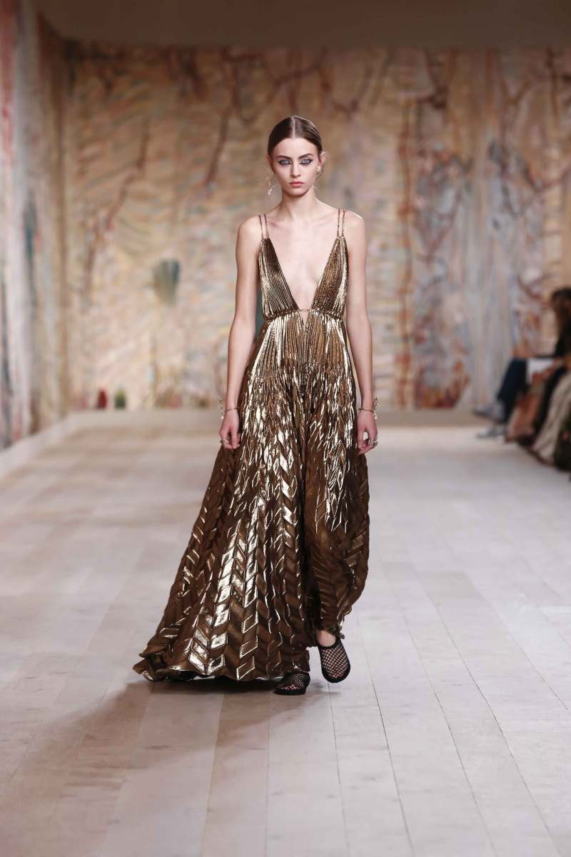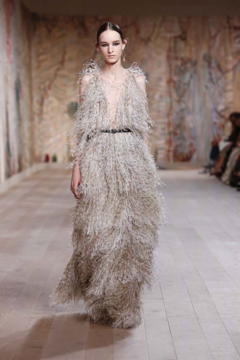La donna della sera Dior è una Cleopatra dal kajal marcato e il corpo accarezzato da lunghi abiti plissettati. Piume e frange ricoprono top e longuette da sera, mentre un lungo abito da sposa, con tanto di velo, si libera in un gioco di petali e trasparenze.