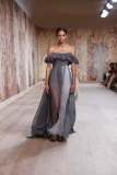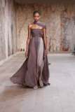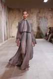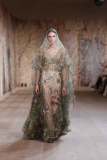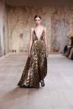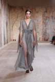 La sera fa delle trasparenze il punto forte per valorizzare le sinuosità delle forme femminili senza scadere nella volgarità. Il lato eccentrico sta nell’abito da ninfa che prende le forme di un fiore di loto, sbocciando con i propri petali sul viso, lasciando intravedere solo lo sguardo magnetico. Abiti lunghissimi con scolli elaborati e innovativi, tonalità della terra, autunnali, da dea del deserto.