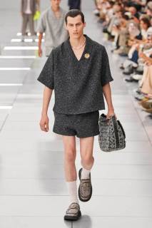 I pantaloni Capri ondeggiano fluidi sopra a mocassini e cadono elegantemente sulla figura maschile sotto maxi giacche e camicie. L’elemento a scacchiera viene riportato nelle trame dei maglioni e delle giacche: un effetto tweed che crea un motivo geometrico che sovrappone quadrati a cerchi diagonali creando un vero e proprio intreccio decorativo.