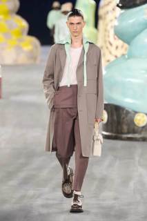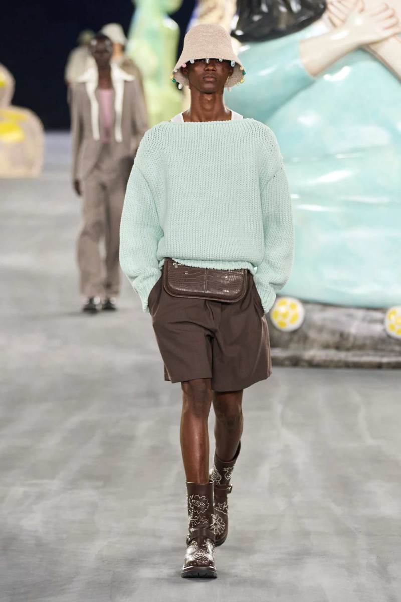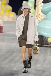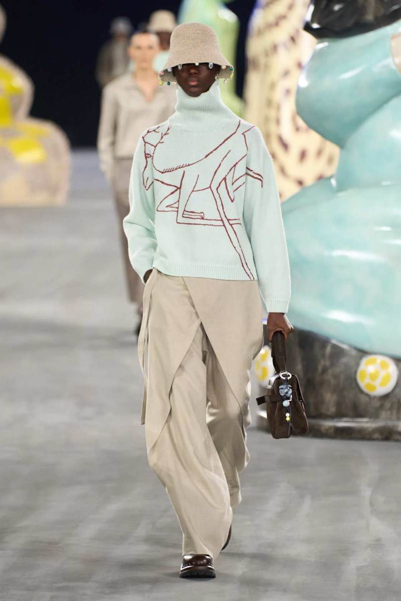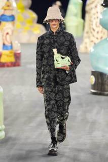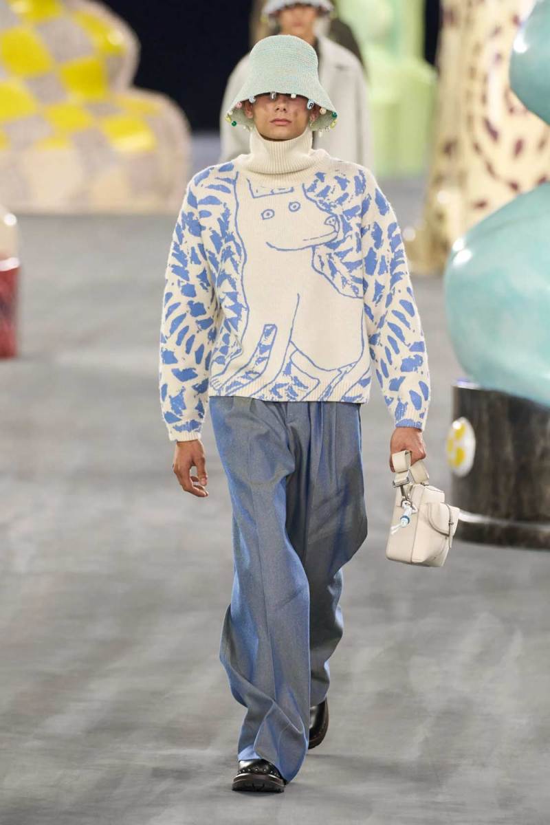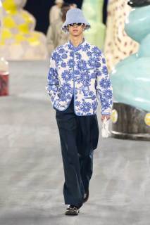 La collezione include collarette ricamate in azzurro su pelle lucida, camicie con stampe floreali blu su bianco, gilet in lana ricamati. Le forme del workwear si fondono con elementi couture: spiccano giacche, pantaloni, zoccoli con suola in legno che diventano stivali decorati con borchie a forma di perline. Non mancano, infine, riferimenti al mondo dell’arte grazie al contributo dell’artista Hylton Nel.