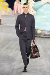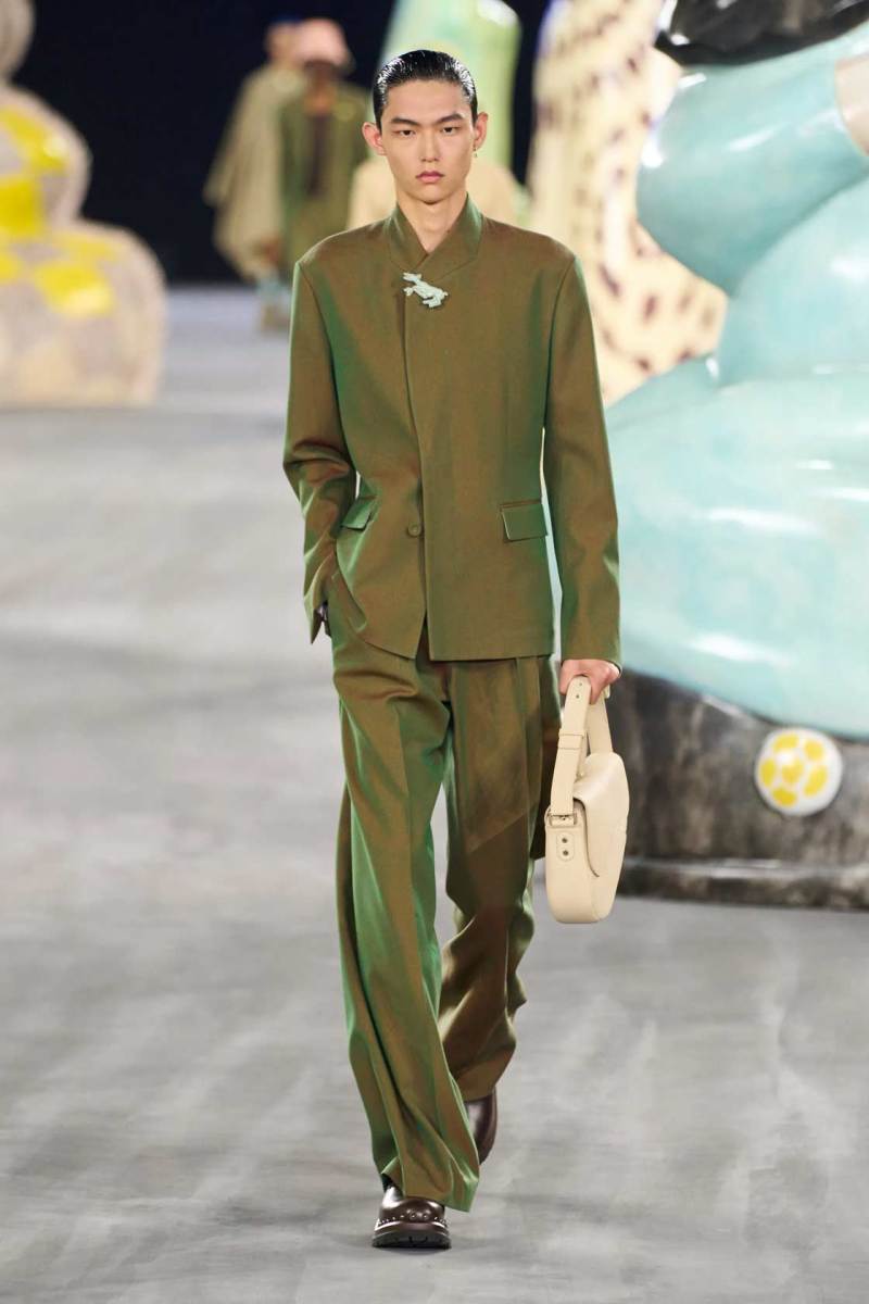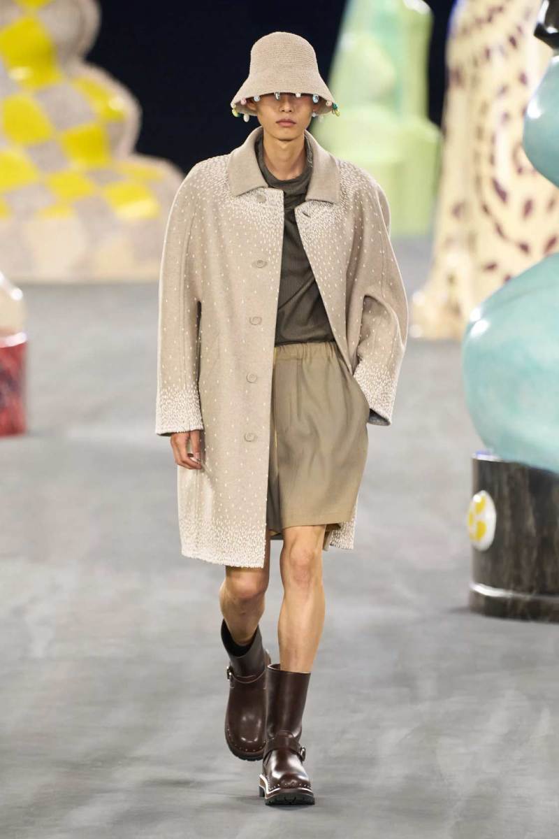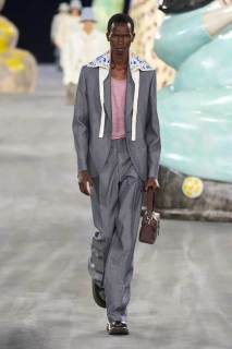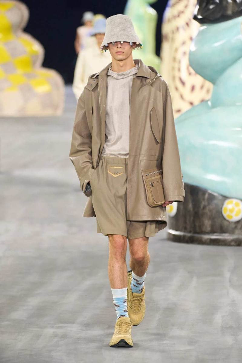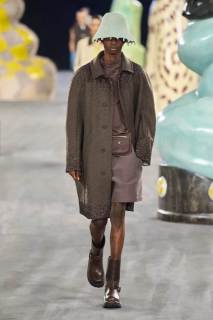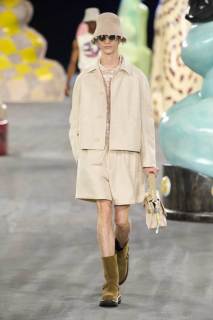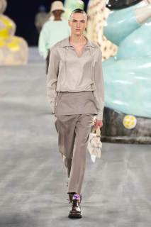 La collezione include collarette ricamate in azzurro su pelle lucida, camicie con stampe floreali blu su bianco, gilet in lana ricamati. Le forme del workwear si fondono con elementi couture: spiccano giacche, pantaloni, zoccoli con suola in legno che diventano stivali decorati con borchie a forma di perline. Non mancano, infine, riferimenti al mondo dell’arte grazie al contributo dell’artista Hylton Nel.