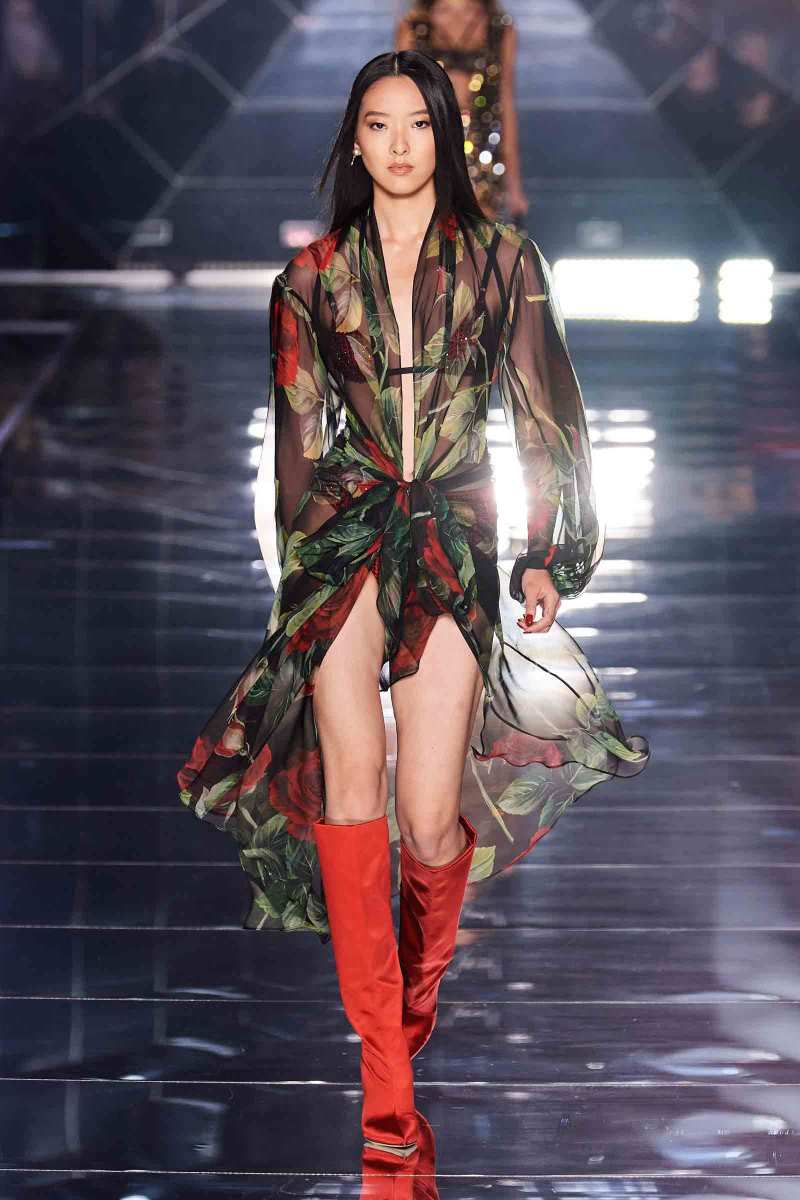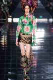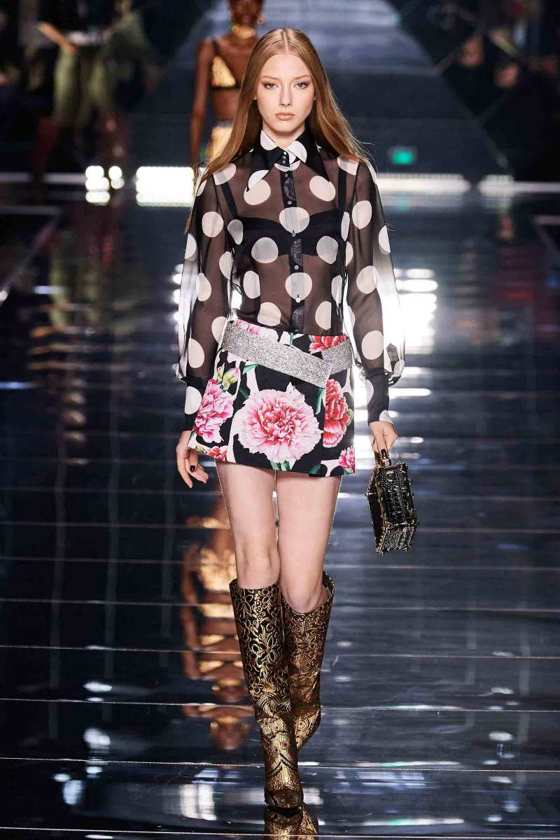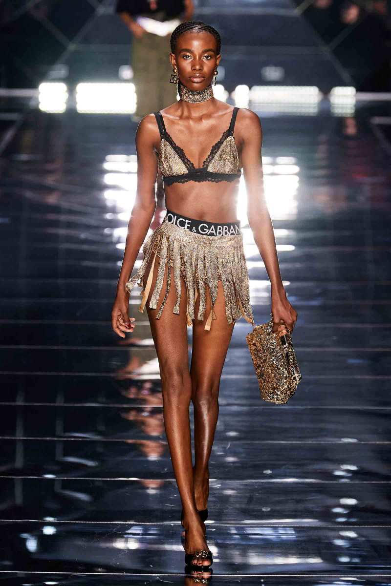 Immancabili nel guardaroba Dolce & Gabbana sono gli abiti con le grandi stampe floreali e quelli in pizzo, rigorosamente nero e avvolgente. Le gonne lunghe con frange color oro o argento evocano in modo sofisticato gli anni ‘20. Leggerissimi tessuti maculati sono utilizzati per ampie camicie, capispalla e abiti raffinati. Originali e audaci sono gli stivali, decorati con frange e strass multicolore, che diventano il necessario accessorio da abbinare all’abito corto.