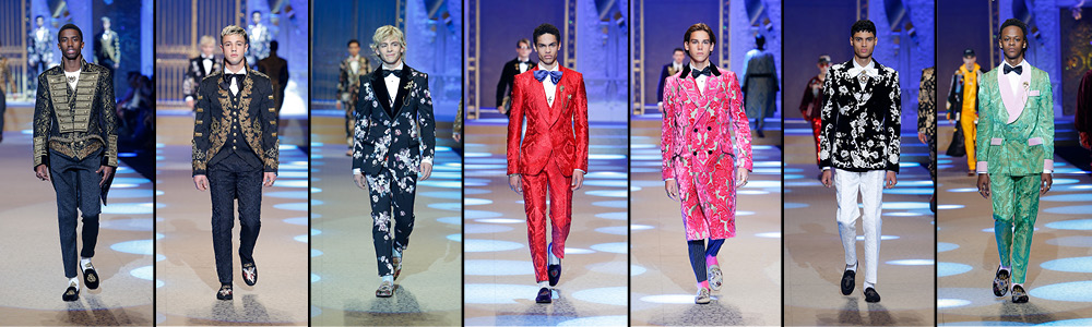 Giacche, doppio petto, petto a lancia o smoking; il tutto è arricchito da applicazioni, strass, stampe floreali, damascati e da un seguito di angeli che decorano un uomo che allegoricamente potrebbe definirsi paradisiaco, puro e serafico.