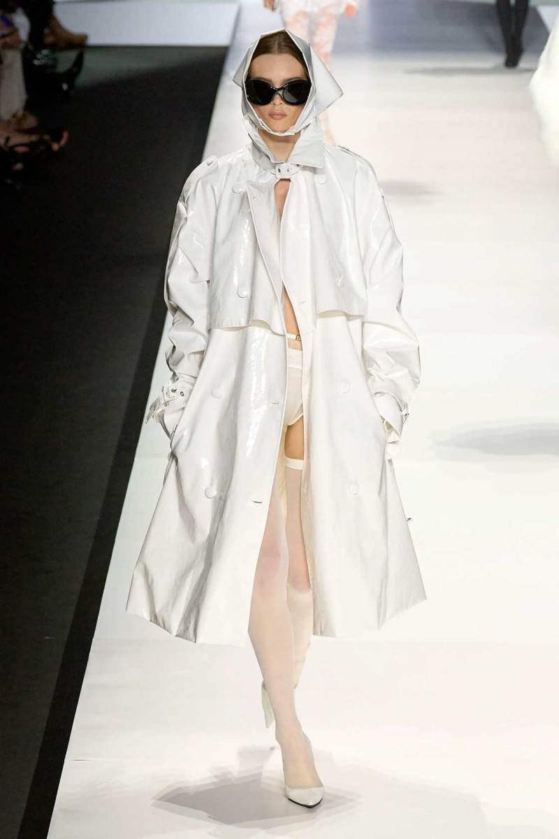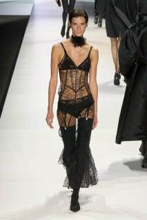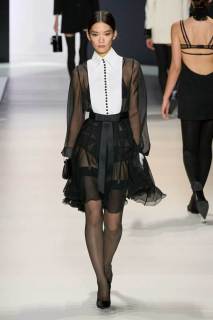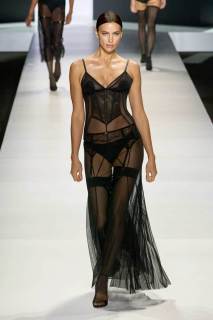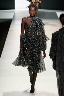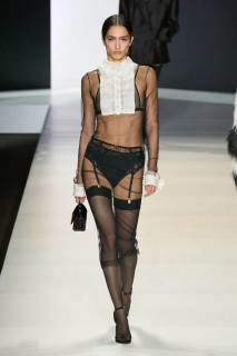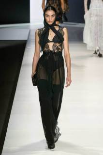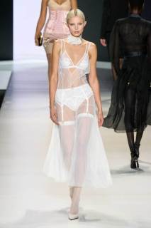 I pois tornano protagonisti a decorare schiffon di seta sui top e sui lunghi abiti svolazzanti vedo non vedo che avvolgono le curve della donna, impreziosita da maxi fiocchi. Un’eleganza dal sapore anni ’60, rivisitata in chiave moderna, che dice sì a giochi di trasparenze, reggiseni a vista, slip, culotte e bustier.