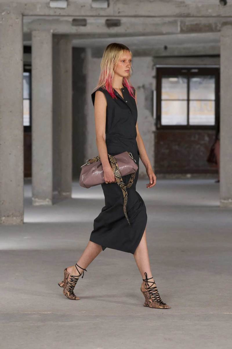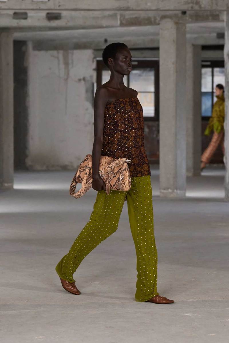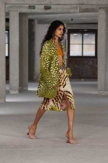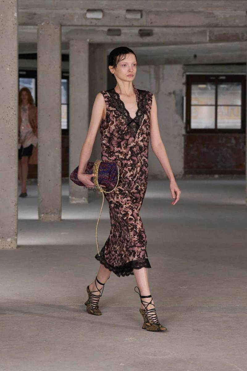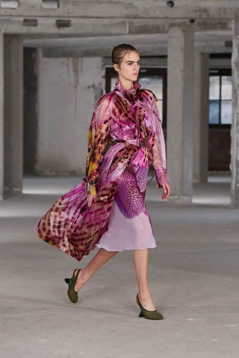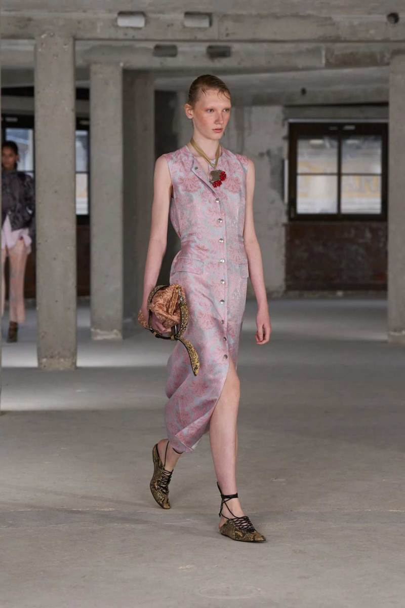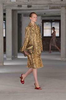 È evidente: si percepisce la mancanza del suo tocco, che rendeva il tutto più complesso nella lettura. La fanno da padrone i completi corti in satin color-block e tantissimo, sia in abiti che in gonne, la stampa ispirata al fiore dell’Orchidea, probabilmente un omaggio alla cultura orientale. Un altro leitmotiv è la stampa pitone, che apre la sfilata in un trench e si ripropone in diverse borse e accessori. I gioielli sono chunky, molto in linea con il trend attuale, e le scarpe sono lucide con forme ricurve oppure slingback tempestate di cristalli. In attesa del futuro Re di Dries Van Noten, siamo soddisfatti di questo lavoro.