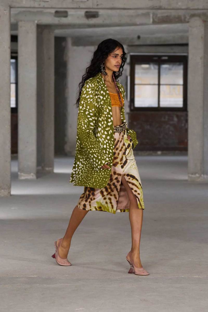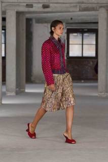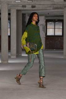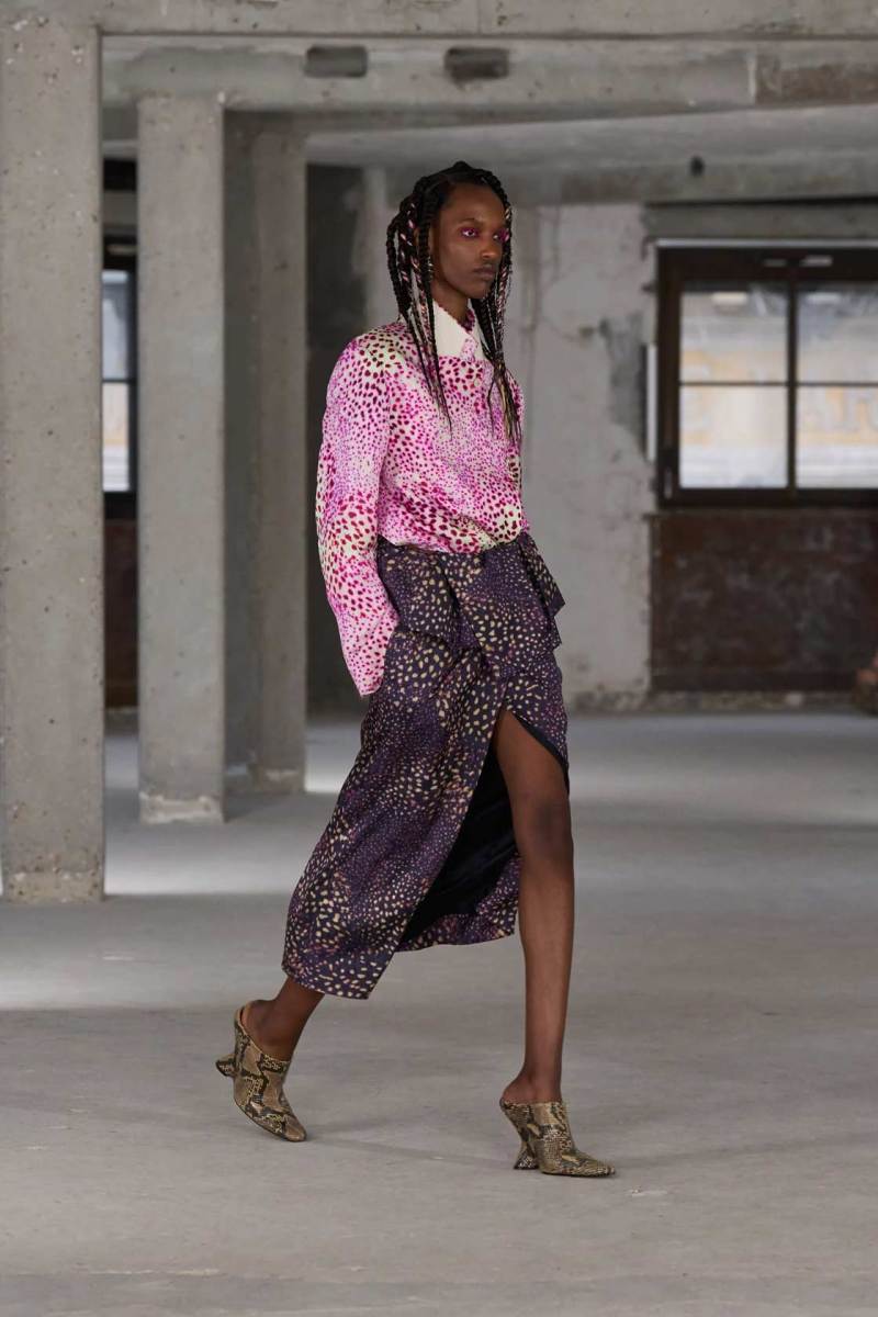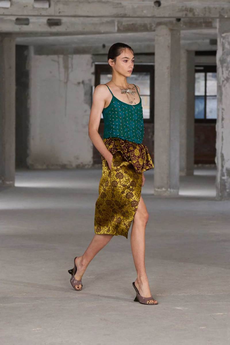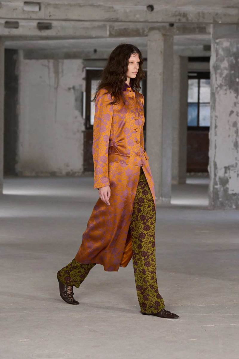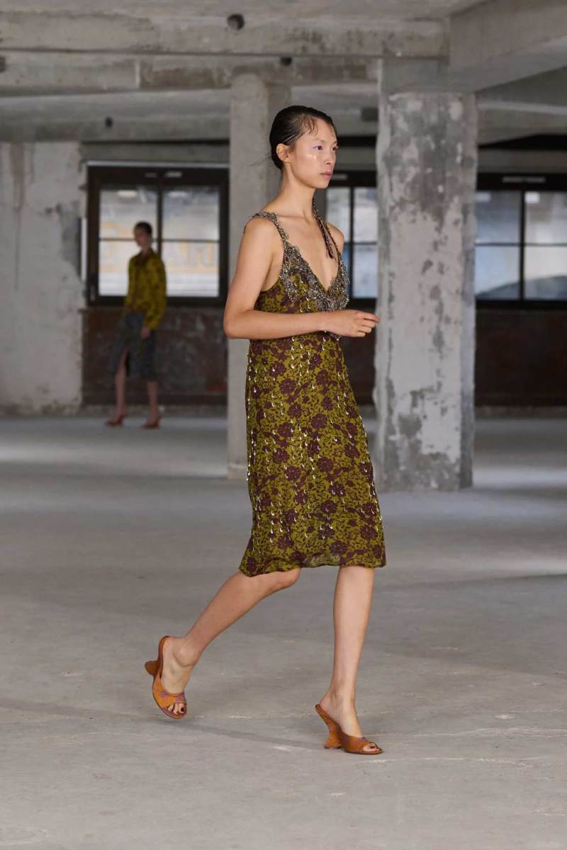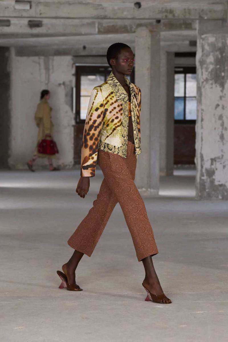 È evidente: si percepisce la mancanza del suo tocco, che rendeva il tutto più complesso nella lettura. La fanno da padrone i completi corti in satin color-block e tantissimo, sia in abiti che in gonne, la stampa ispirata al fiore dell’Orchidea, probabilmente un omaggio alla cultura orientale. Un altro leitmotiv è la stampa pitone, che apre la sfilata in un trench e si ripropone in diverse borse e accessori. I gioielli sono chunky, molto in linea con il trend attuale, e le scarpe sono lucide con forme ricurve oppure slingback tempestate di cristalli. In attesa del futuro Re di Dries Van Noten, siamo soddisfatti di questo lavoro.