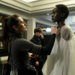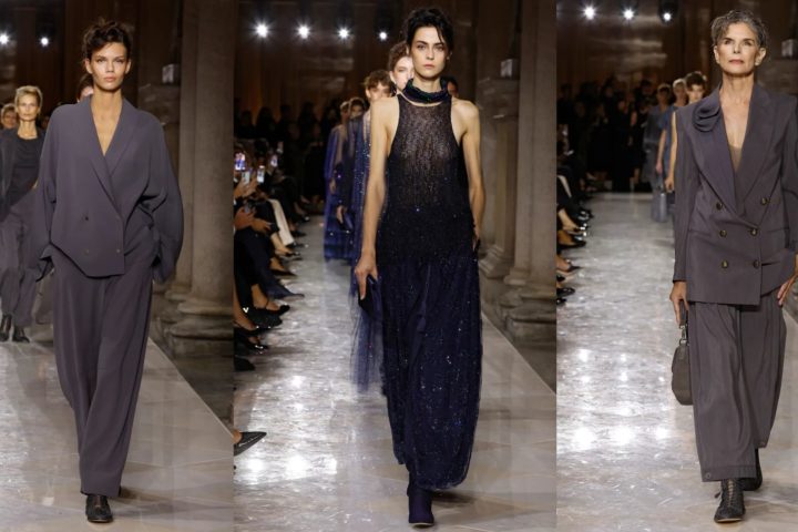 Re Giorgio pensa alla donna che ama il vestire androgino, al maschile, ma che non rinuncia alla sottigliezza, alla leggerezza del vestire femminile. Apprezza il classico come senso della misura e cerca l’eccentrico per il gusto della modernità. Aprono lo show i tailleur pantalone in tessuti sottili ma non aderenti, così mannish nel loro Principe di Galles. Non manca nemmeno la pochette nel taschino che però è appuntata come una spilla, e sboccia in un romantico fiore. Sopra: bluse iperfemminili in una fantasy print dai colori intensi: arancio, fucsia, rosso tibetano. In un gioco continuo di opposizioni di organza tecnica, i bermuda con la piega stirata a lama, sbucano da gonne e abiti dal design preciso ma con l’orlo danzante. Non mancano gioielli-design, realizzati in materiali che ricorrono anche negli accessori, come le piccole borse, e sottolineano la forte originalità degli accostamenti. Girocollo di bachelite con il nodo di camoscio, accostato alle lunghe catene di Swarovski. Pellicce ecologiche e tessuti elastici danno alle forme una consistenza e una corposità diversa. Velluto e organza riflettono la luce con nuova intensità. Ai piedi scarpe appuntite, rigorosamente basse – ricamate o zebrate o splendenti – Rockabilly style, che riflettono un atteggiamento divertito e divertente, da chiccosissima bad girl.
