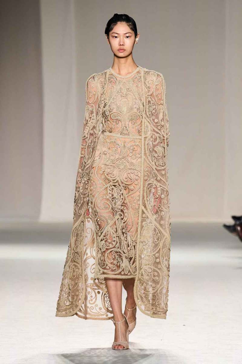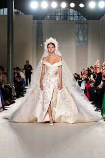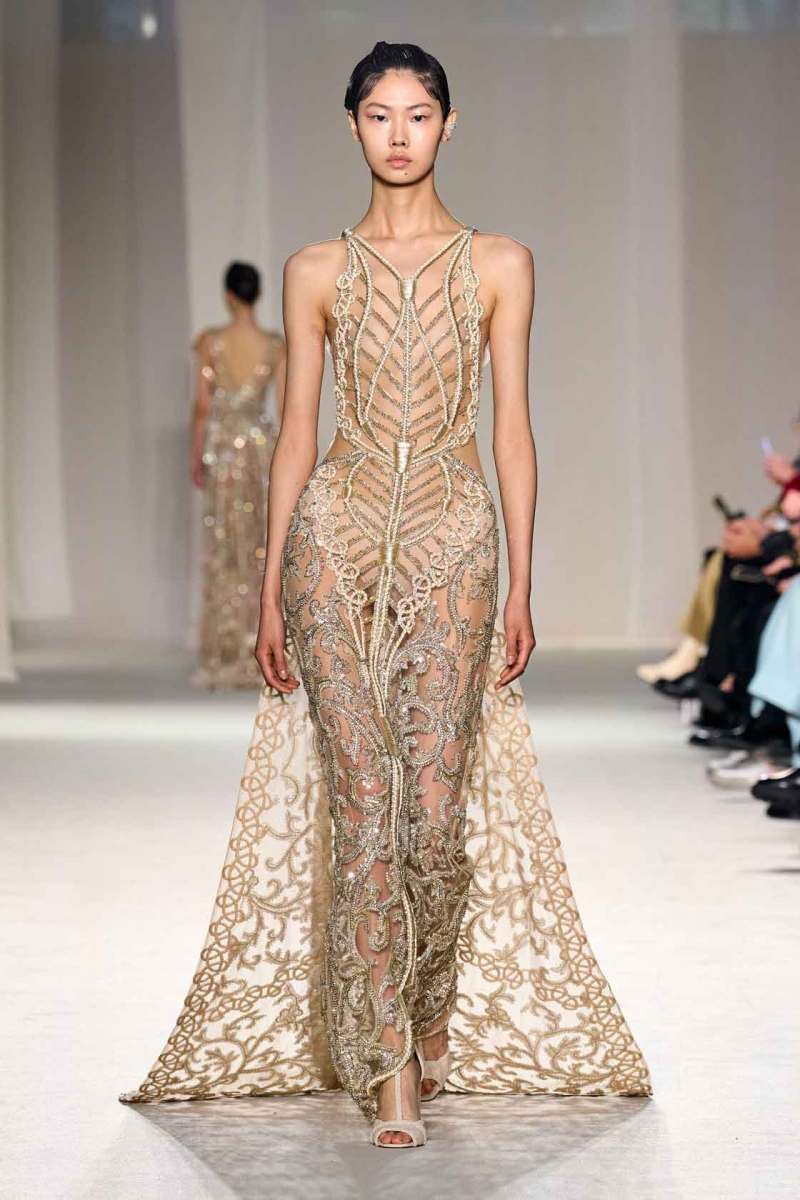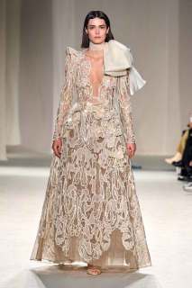 Ogni pezzo della collezione presenta un proprio intricato e stupefacente schema di ricami, passamanerie e applicazioni di ogni tipo: l’obiettivo è quello di indurre nello spettatore la sensazione di essere, almeno per un attimo, fuggiti dall’ordinaria monotonia grazie a una magica illusione. Ispirati dall’immaginario thai, i corsetti con scollo a cuore sono un elemento forte della collezione, sormontati da cappotti da opera in seta preziosa. Lunghe gonne accompagnano i capi nella massima espressione dell’eleganza. La palette di riferimento di Elie Saab è sicuramente quella dei colori crema e pastello, ricoperti da migliaia di pietre e cristalli bilanciati con ricami drappeggiati e delicati tulle e organza.