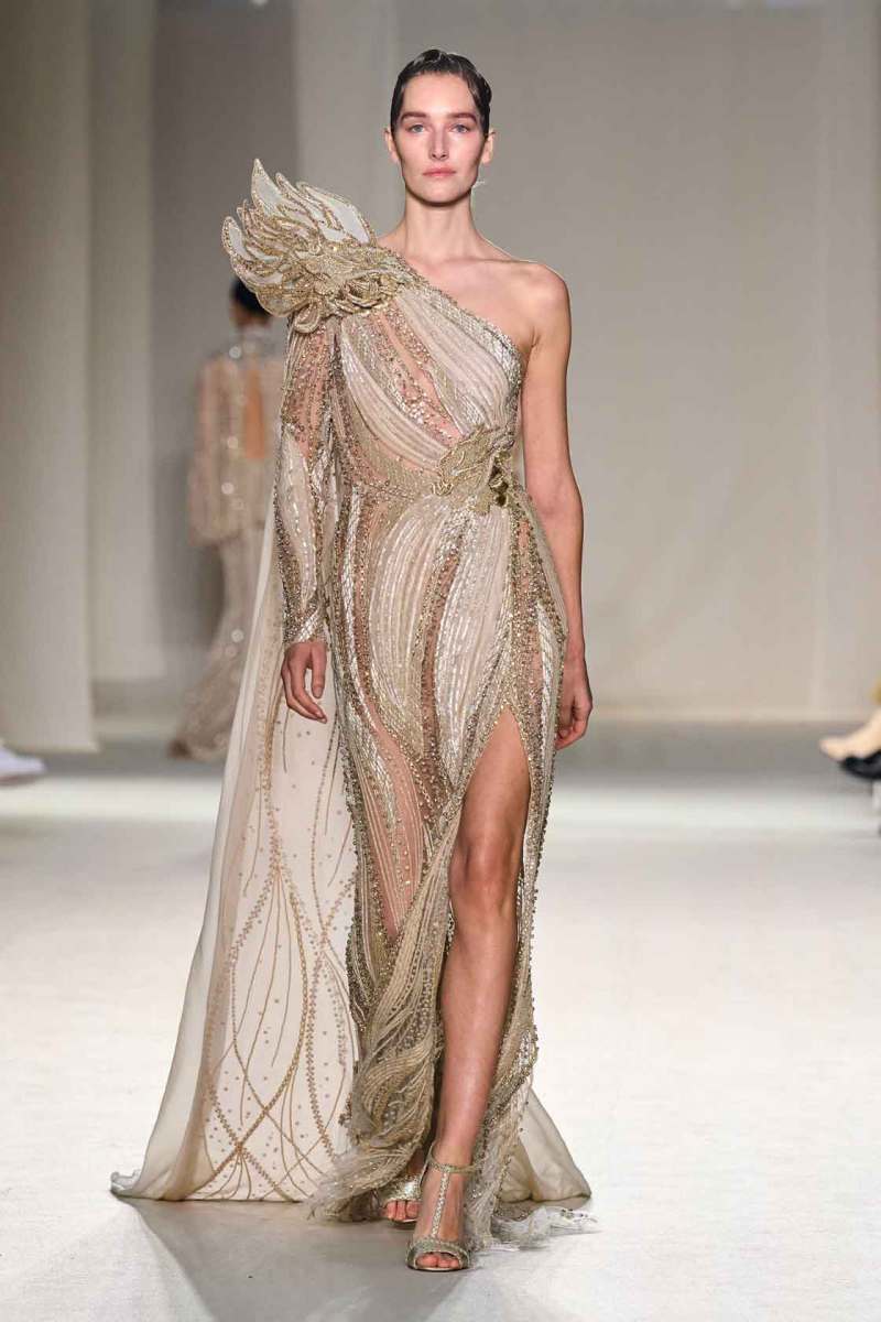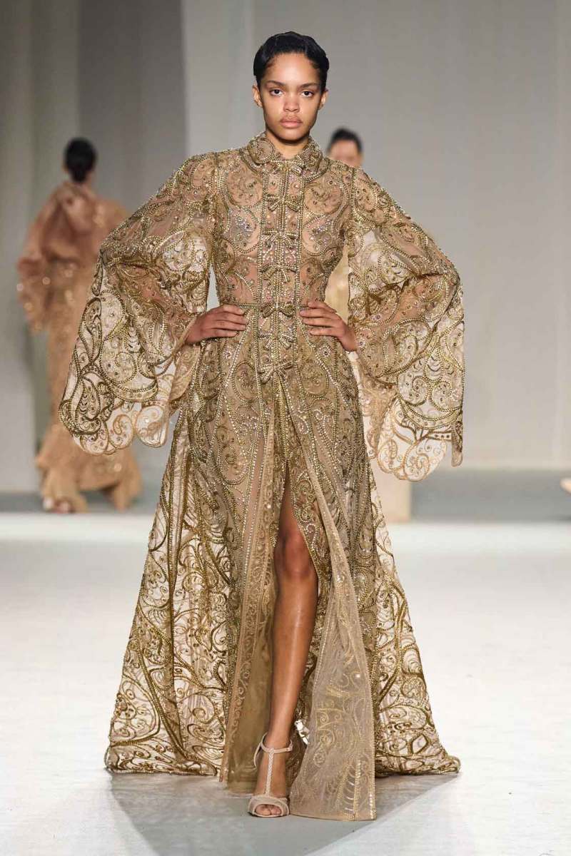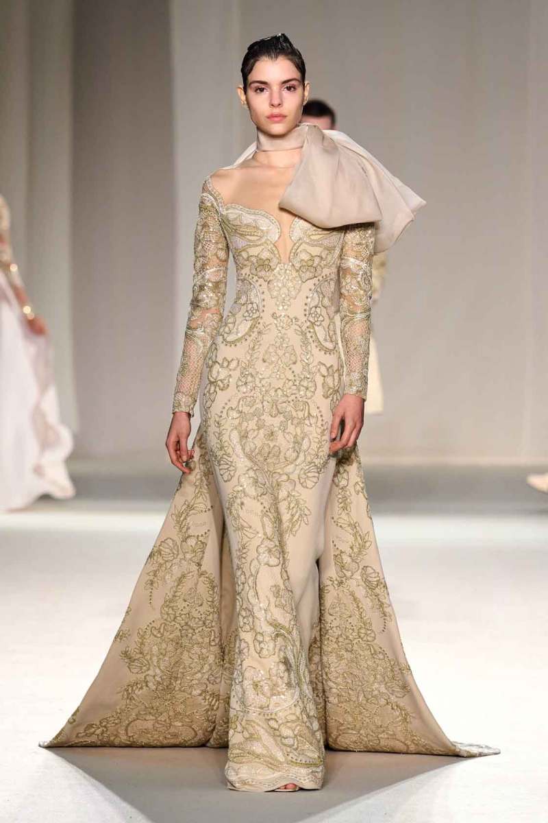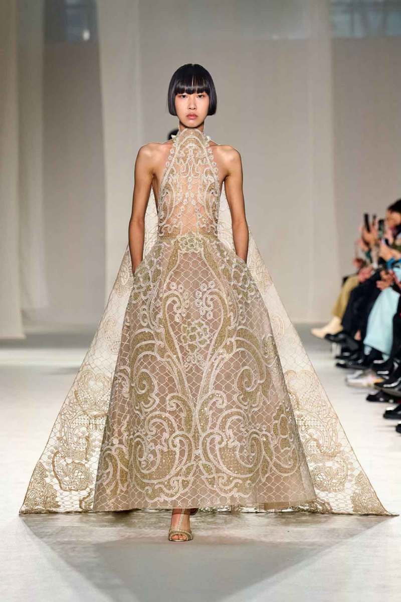 Elie Saab presenta la sua collezione Couture Primavera/Estate 2023 tra le mura del famoso centro culturale “Le Carreau Du Temple” di Parigi. I look splendenti hanno occupato la passerella in un susseguirsi di abiti elaborati: pura bellezza e magia si fondono in un’espressione di rara opulenza. “Golden Dawn” – alba d’oro, il titolo della collezione – è un termine perfetto per definire le sfumature di colori che Elie Saab ha scelto per i suoi capi: luminosi, preziosi, ispirati ad una terra – la Thailandia – nel suo panorama effettivo – quello della terra del sole – ma anche culturale, con la sua maestosa sfarzosità.