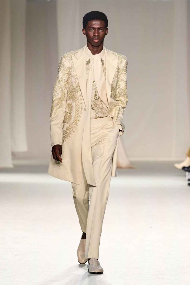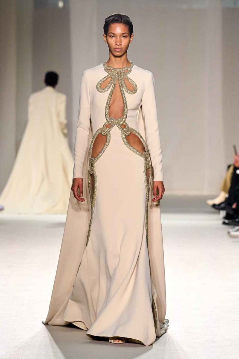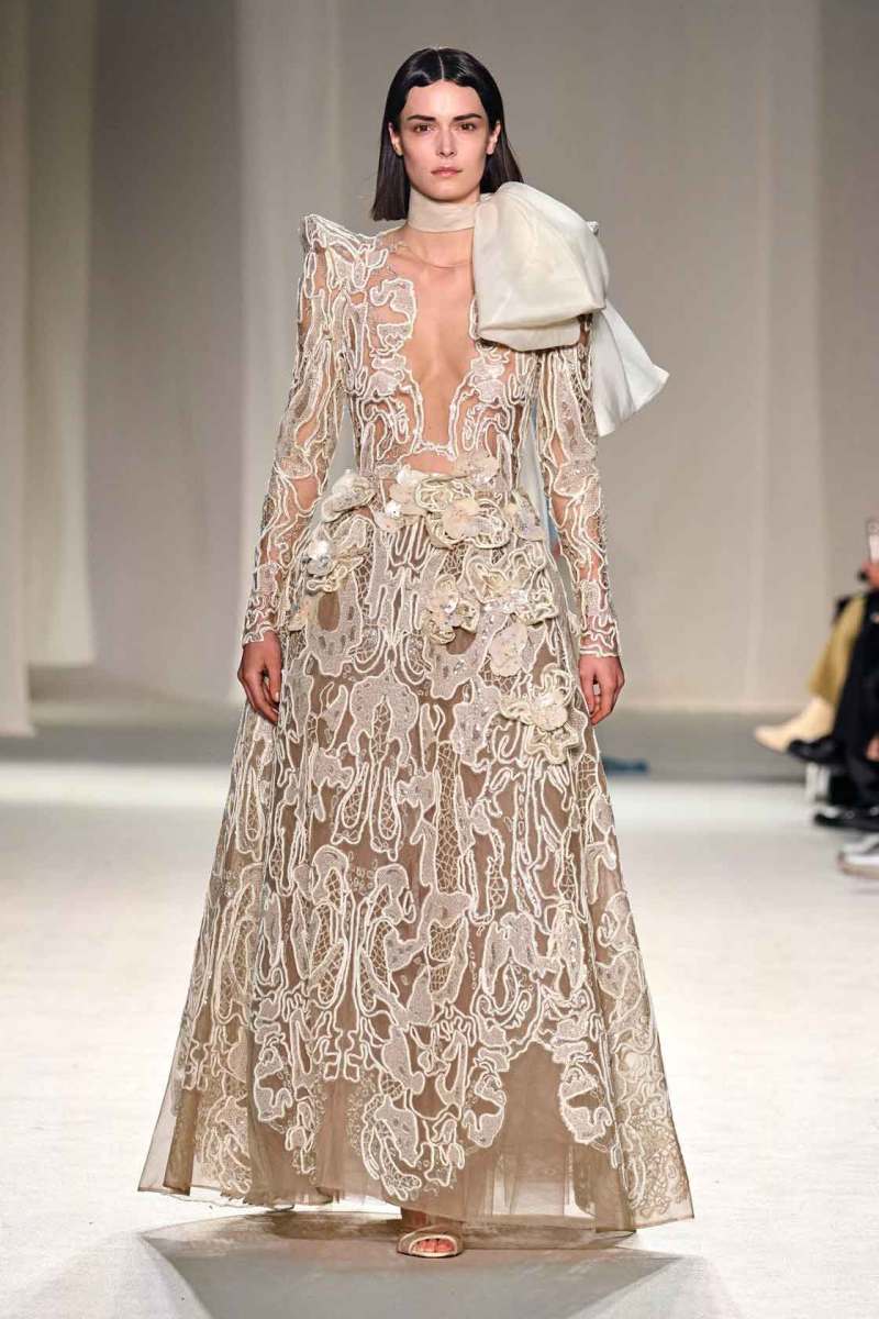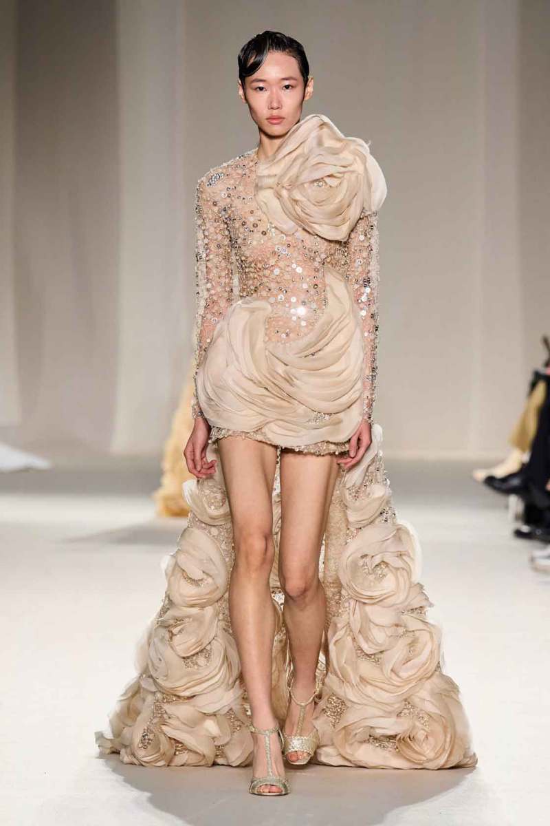 Elie Saab presenta la sua collezione Couture Primavera/Estate 2023 tra le mura del famoso centro culturale “Le Carreau Du Temple” di Parigi. I look splendenti hanno occupato la passerella in un susseguirsi di abiti elaborati: pura bellezza e magia si fondono in un’espressione di rara opulenza. “Golden Dawn” – alba d’oro, il titolo della collezione – è un termine perfetto per definire le sfumature di colori che Elie Saab ha scelto per i suoi capi: luminosi, preziosi, ispirati ad una terra – la Thailandia – nel suo panorama effettivo – quello della terra del sole – ma anche culturale, con la sua maestosa sfarzosità.