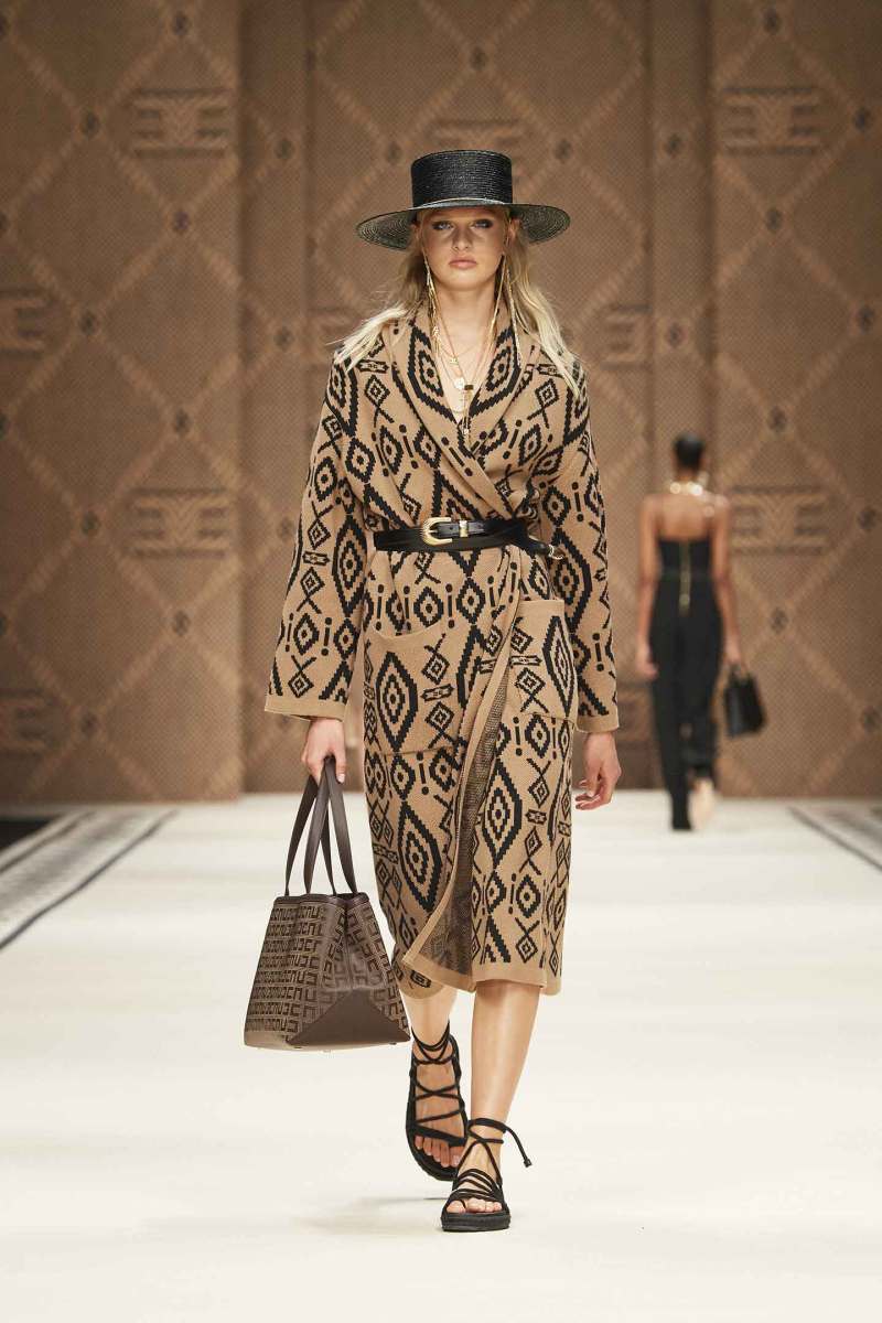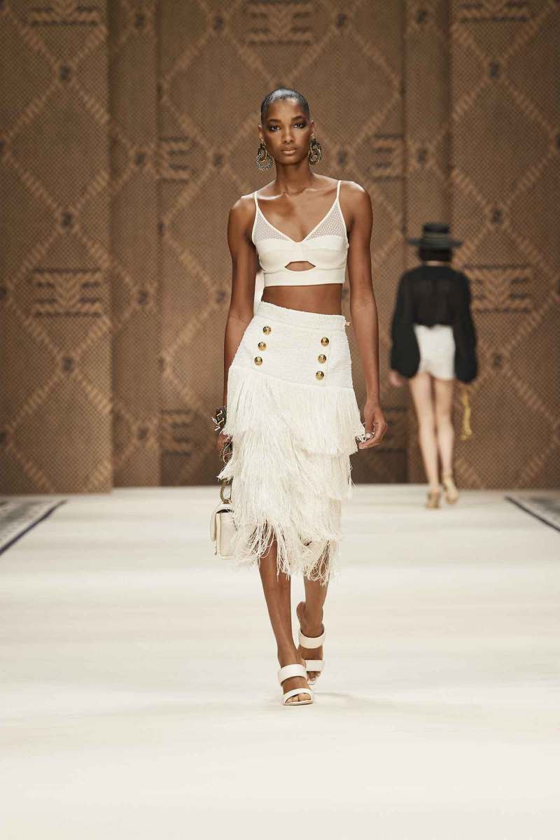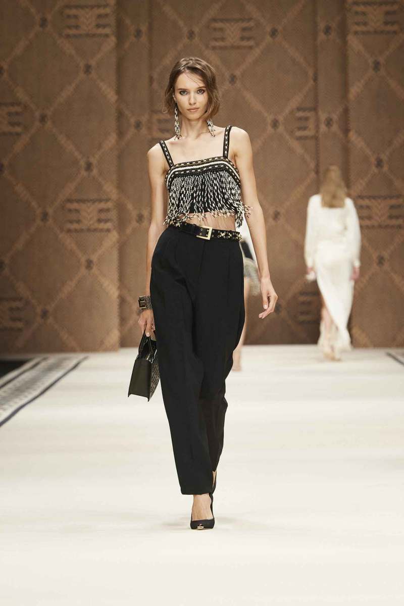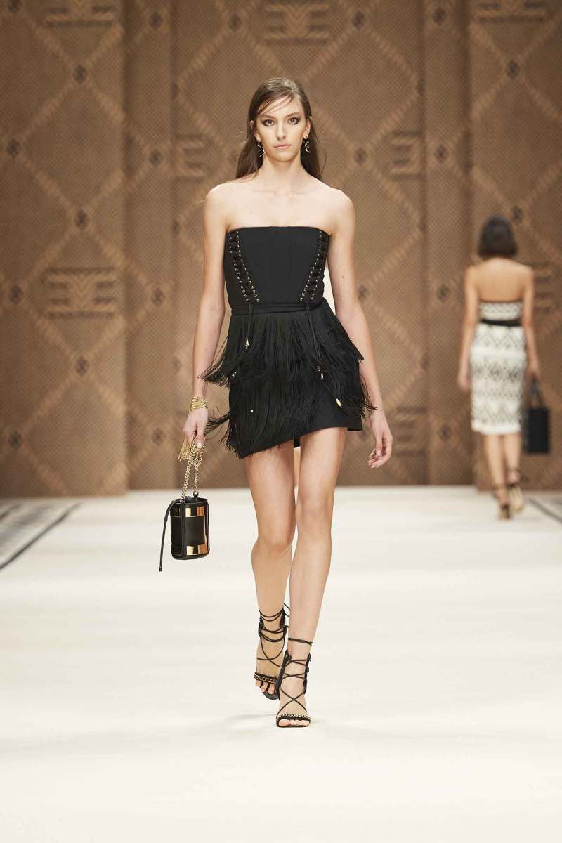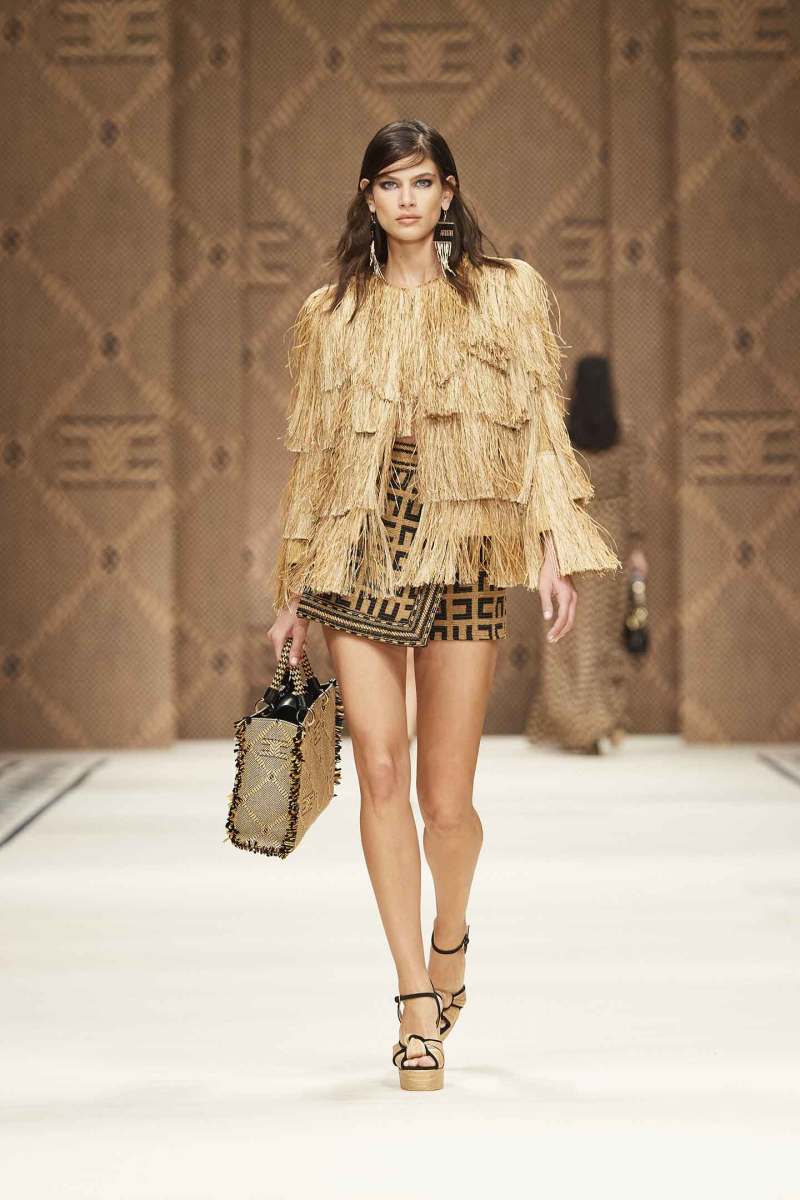 L’elemento delle frange, da sempre DNA di Elisabetta Franchi, è stato arricchito in questa nuova collezione da minuscole perle di legno. I colori della SS23 hanno virato da tonalità cioccolato al nero di seppia, alla liquirizia e al color burro. La rafia è stata grande protagonista e ha esaltato le silhouette di un abito, di una gonna e poi di un caban.
