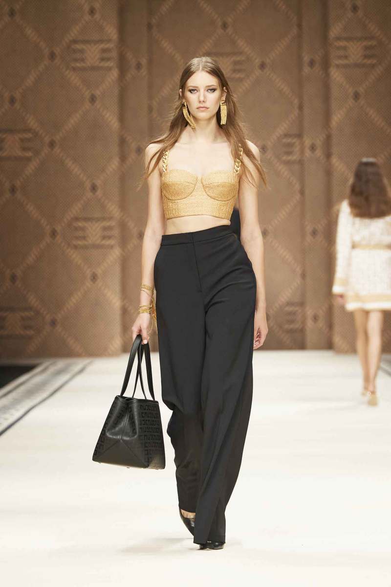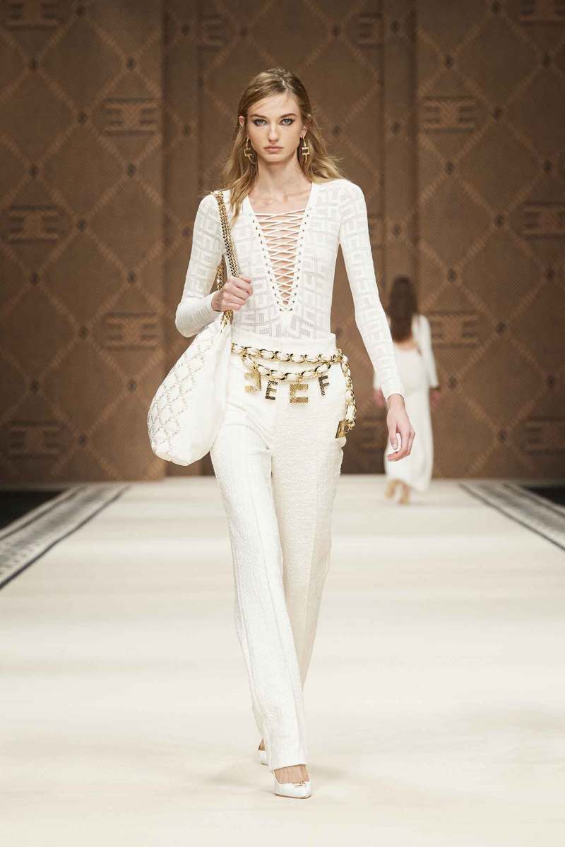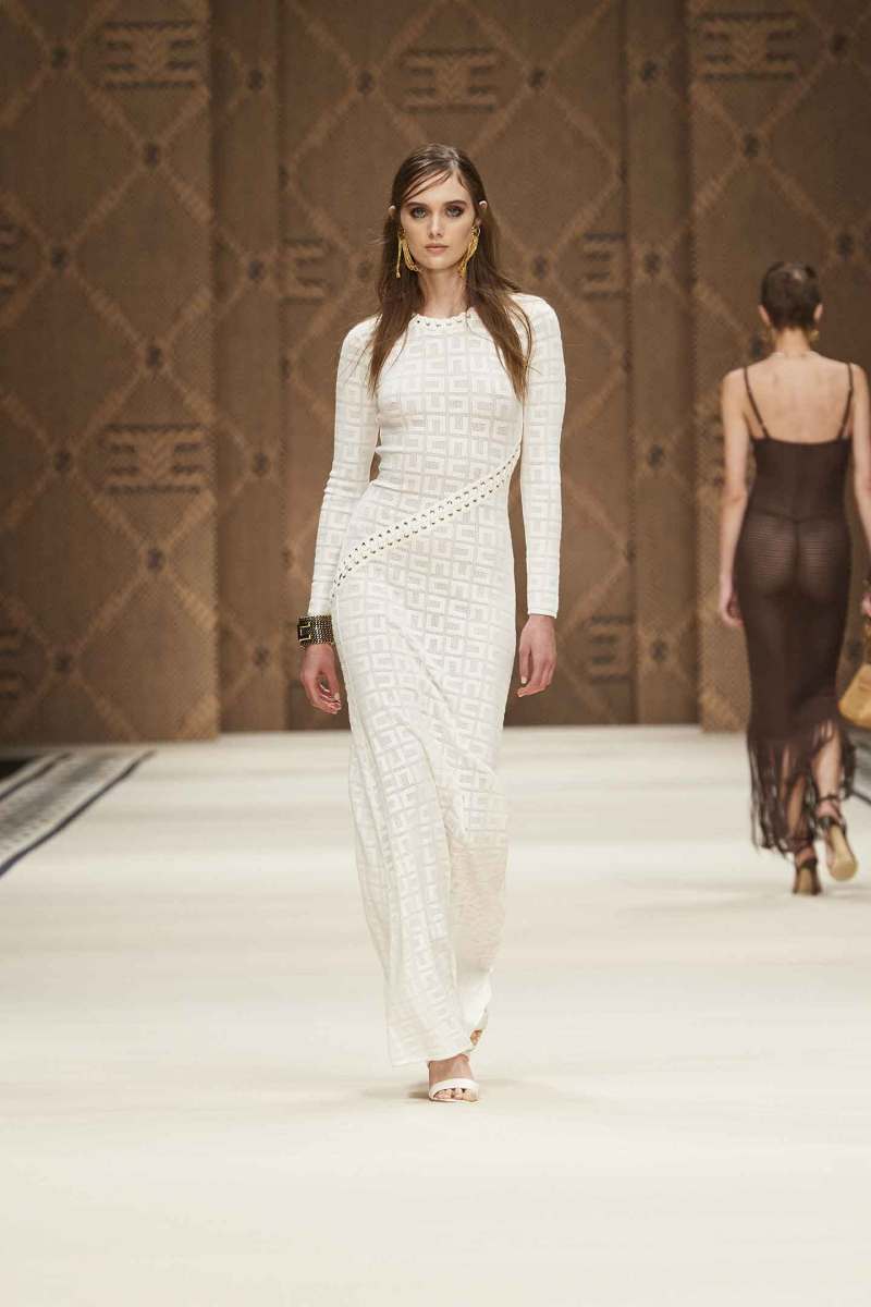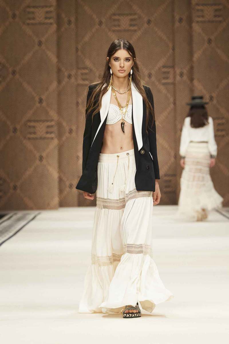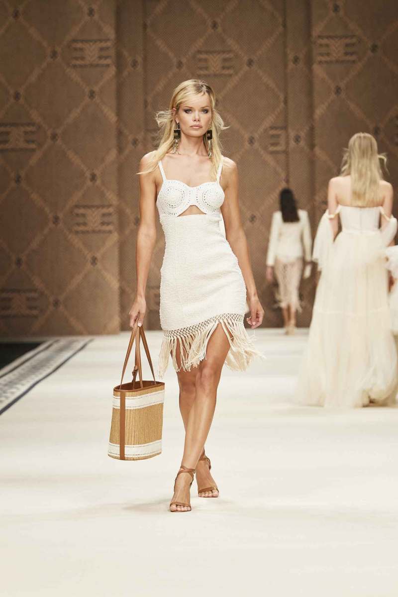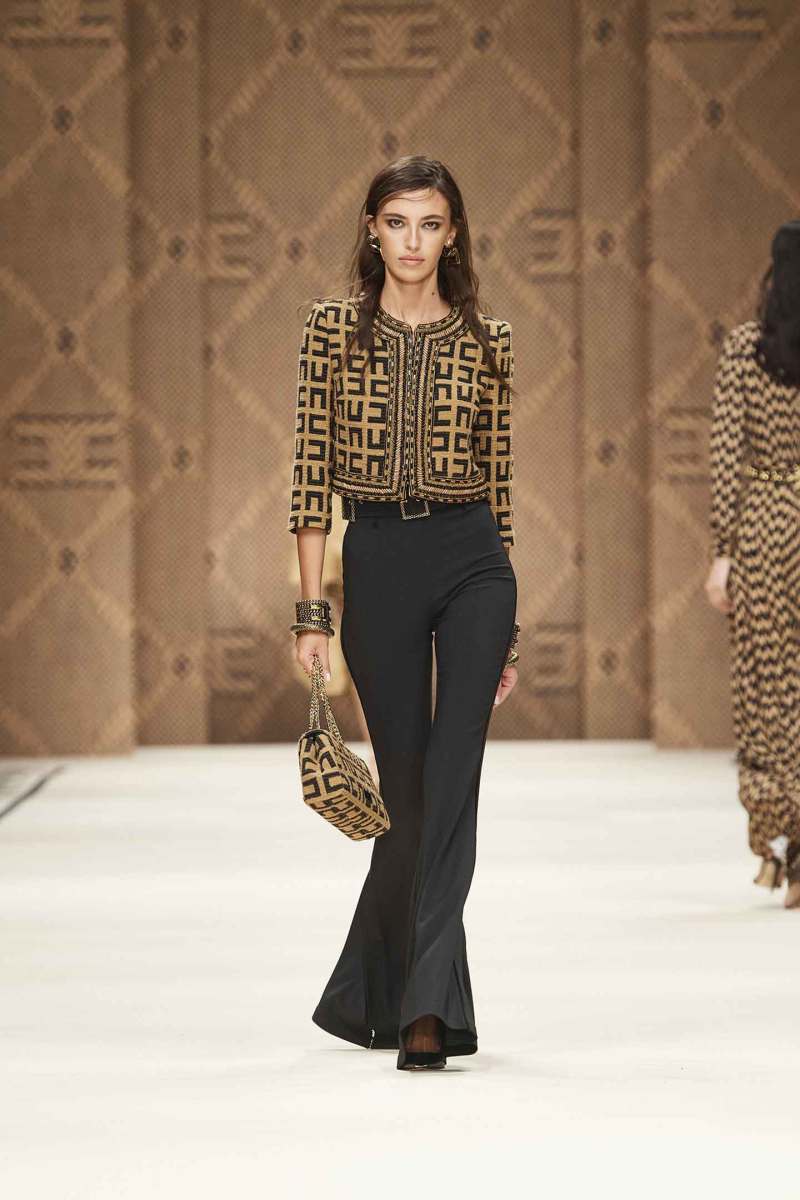 L’elemento delle frange, da sempre DNA di Elisabetta Franchi, è stato arricchito in questa nuova collezione da minuscole perle di legno. I colori della SS23 hanno virato da tonalità cioccolato al nero di seppia, alla liquirizia e al color burro. La rafia è stata grande protagonista e ha esaltato le silhouette di un abito, di una gonna e poi di un caban.