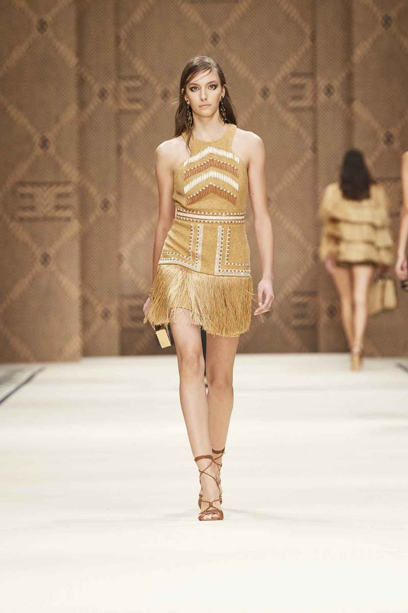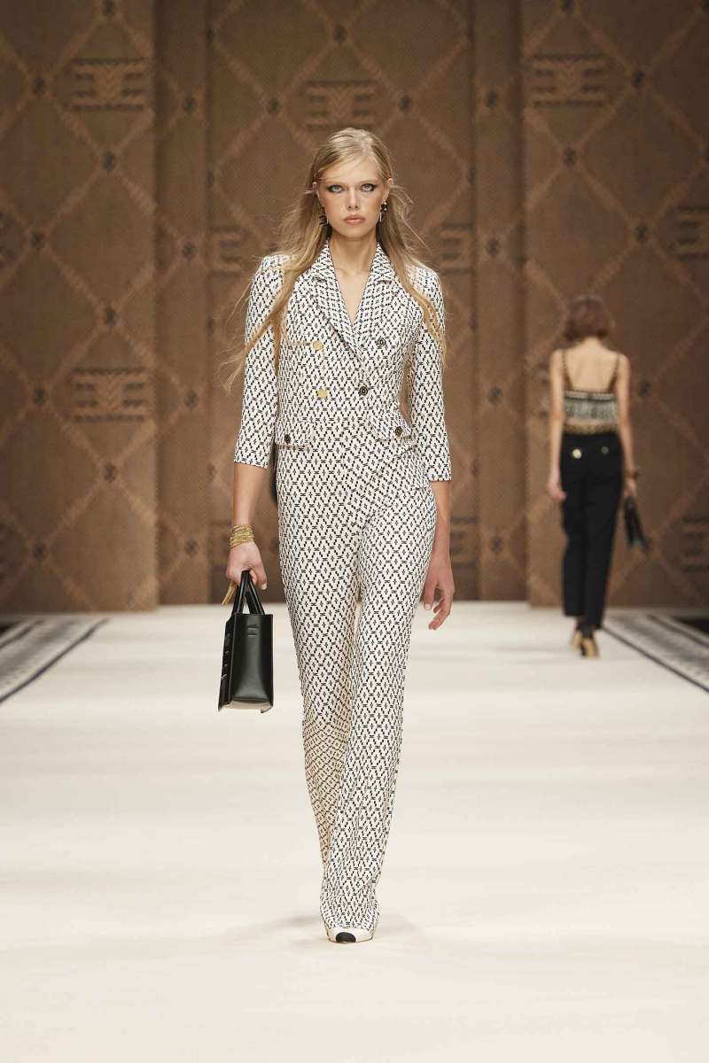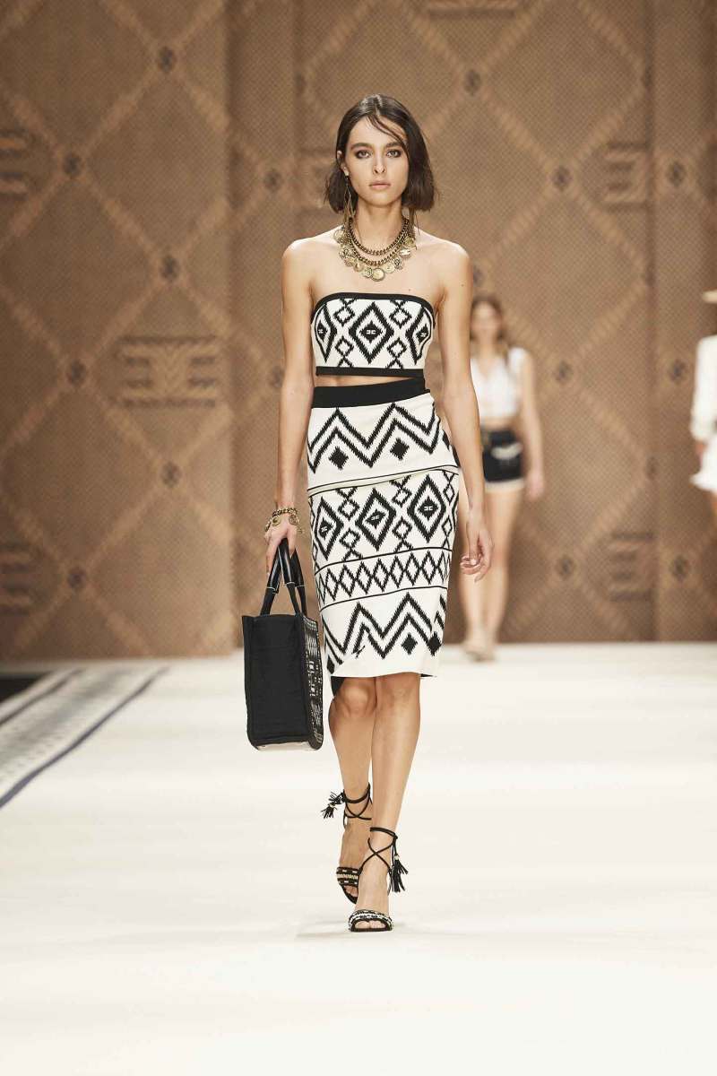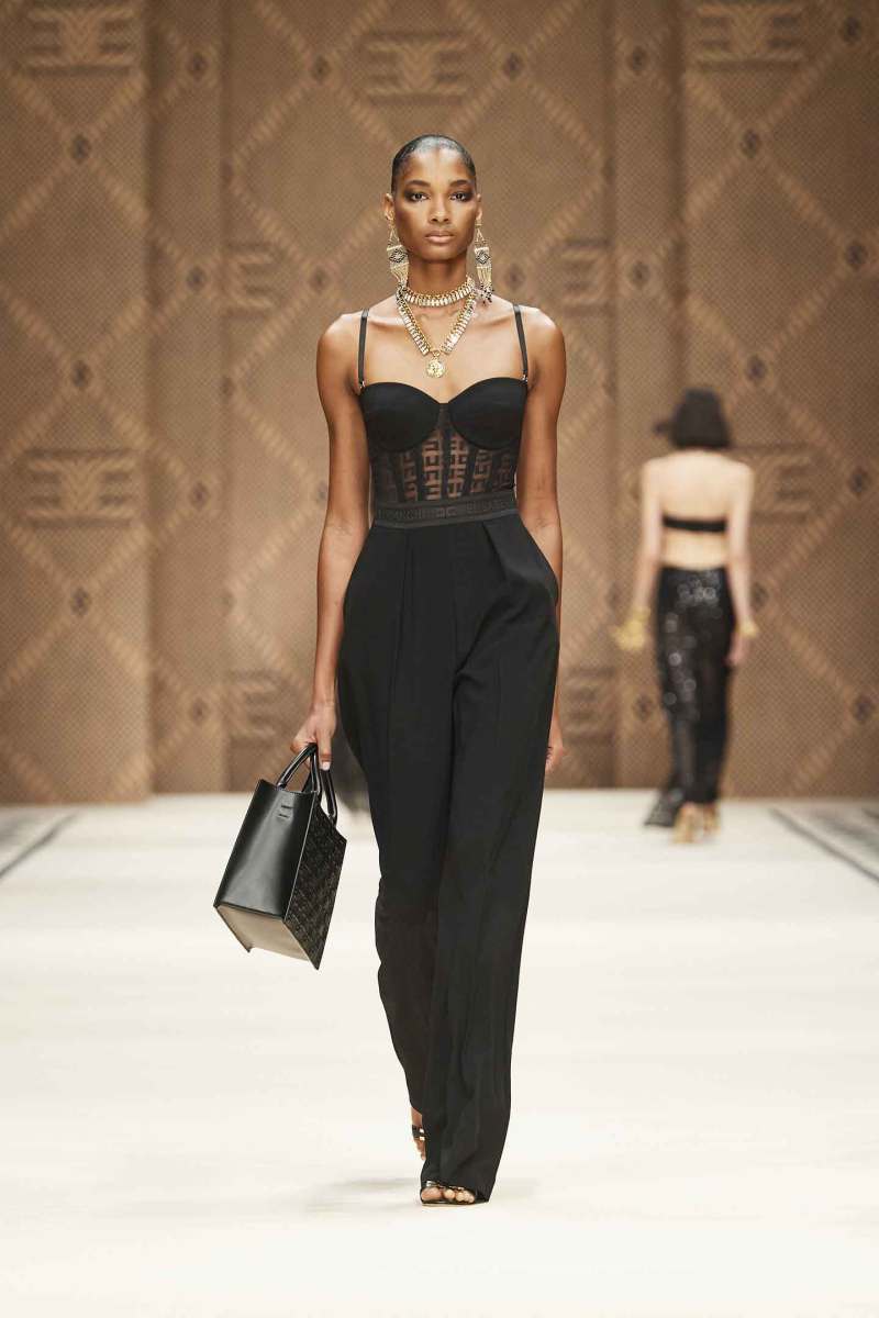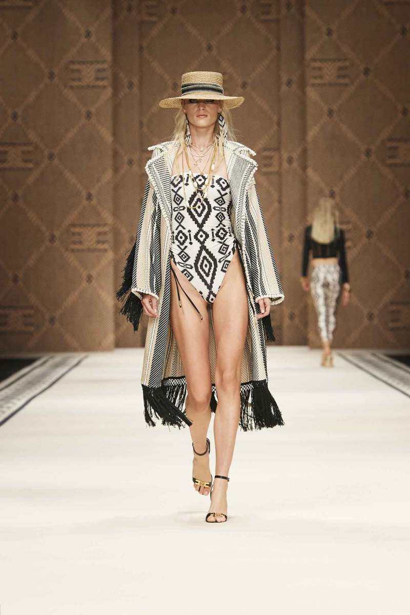 L’elemento delle frange, da sempre DNA di Elisabetta Franchi, è stato arricchito in questa nuova collezione da minuscole perle di legno. I colori della SS23 hanno virato da tonalità cioccolato al nero di seppia, alla liquirizia e al color burro. La rafia è stata grande protagonista e ha esaltato le silhouette di un abito, di una gonna e poi di un caban.