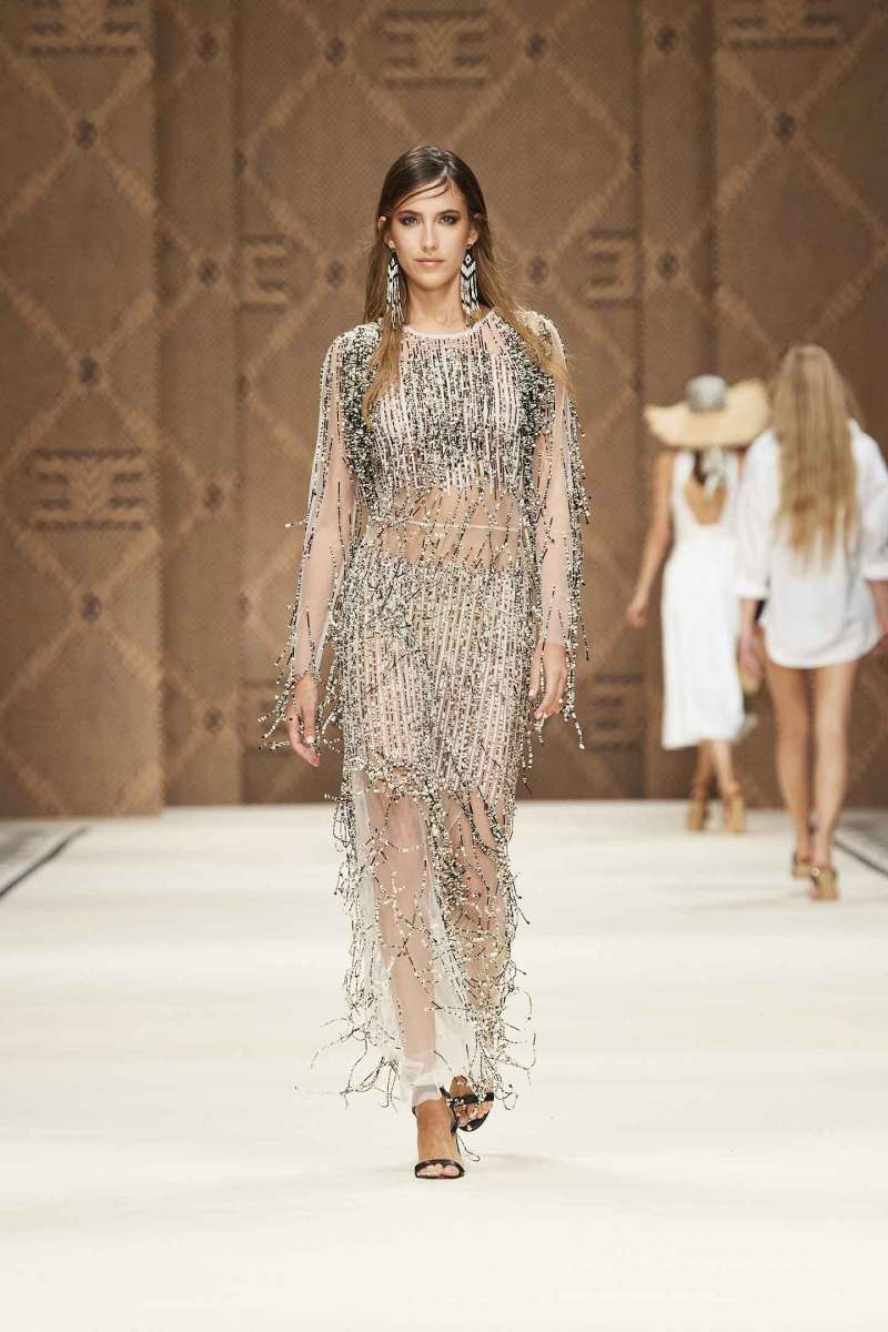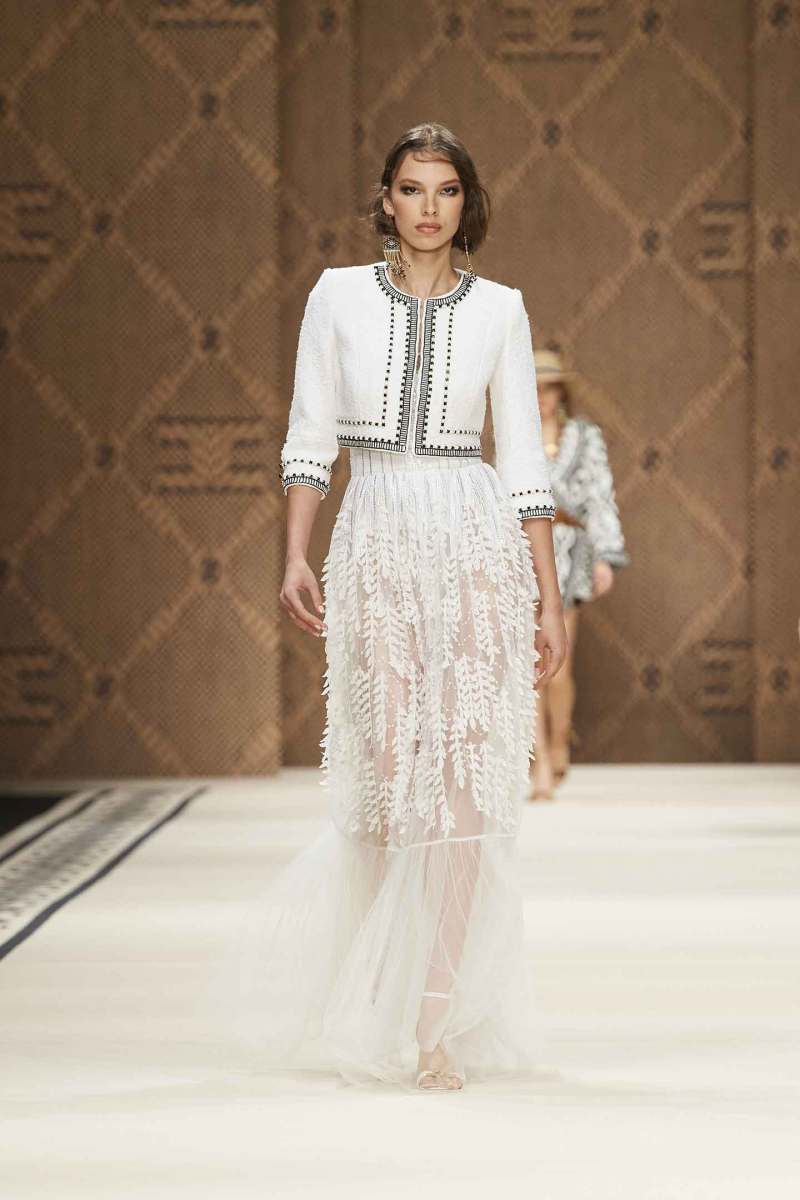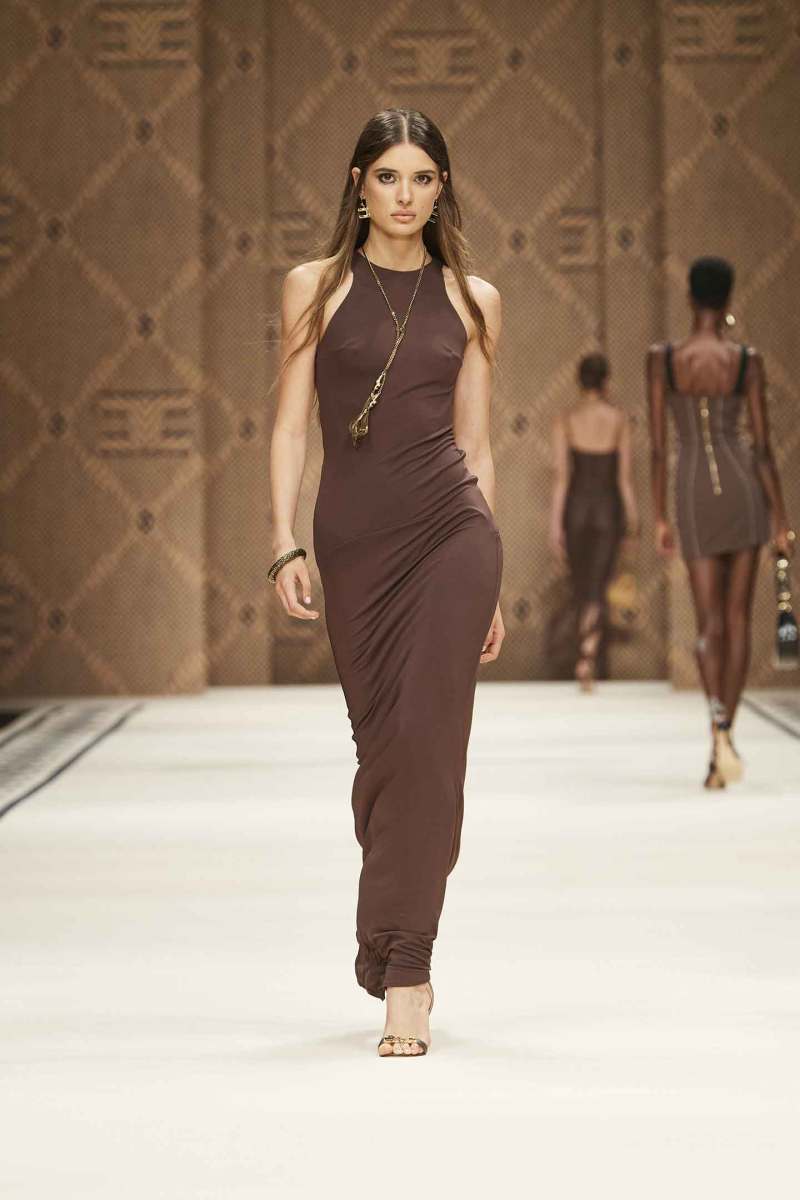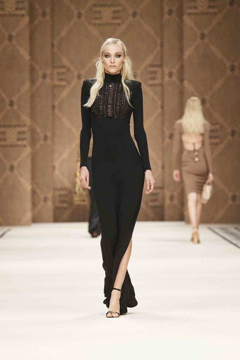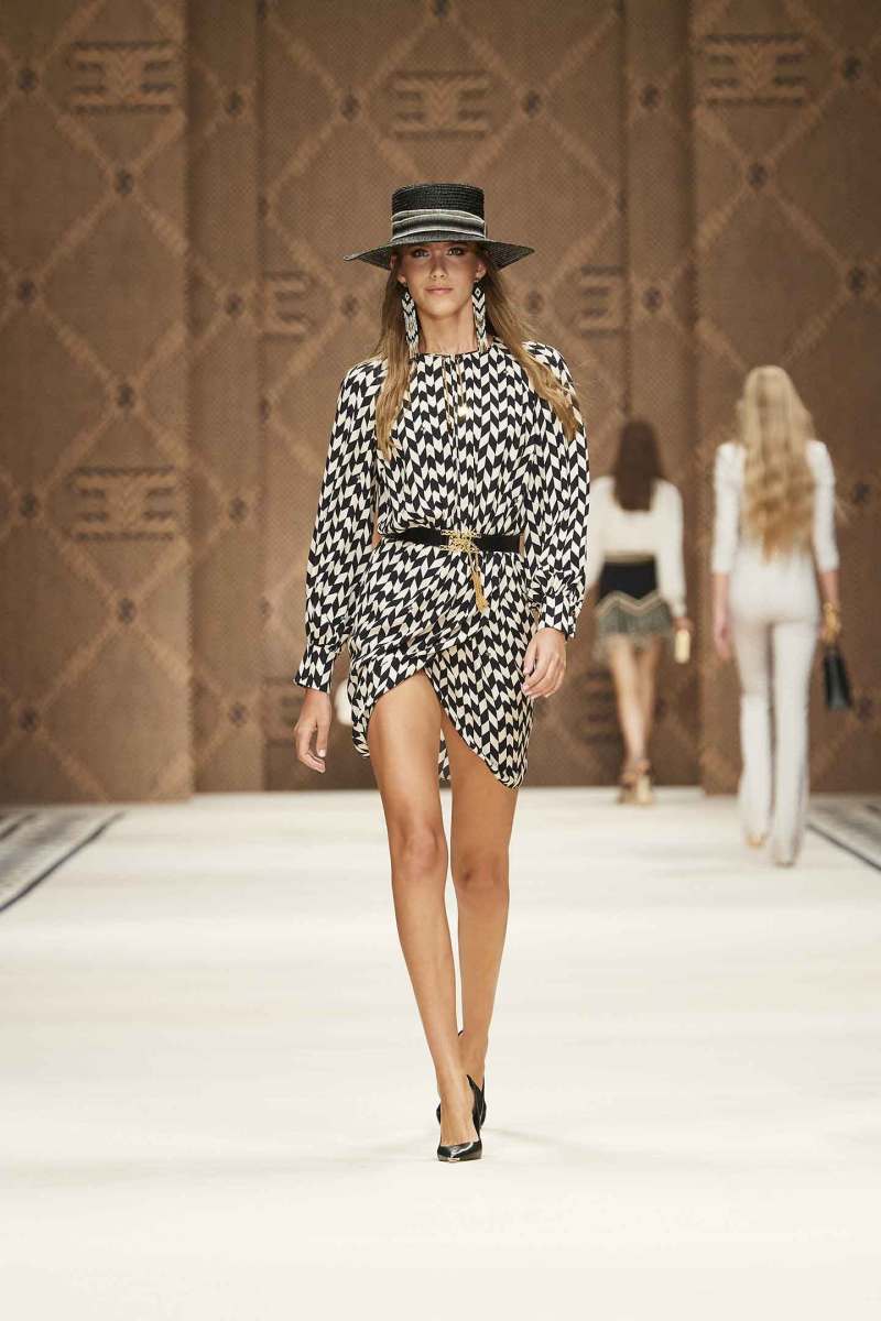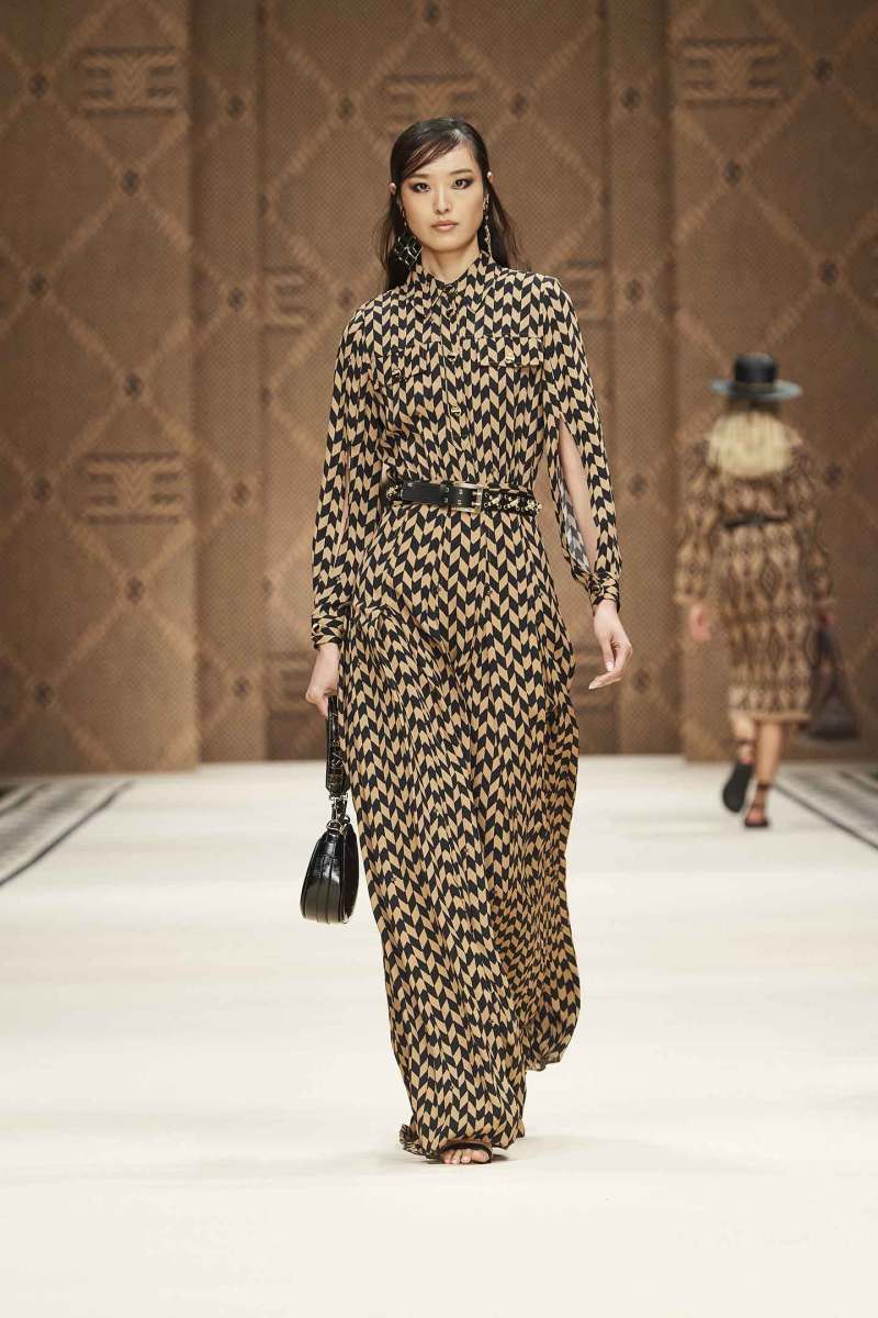 L’elemento delle frange, da sempre DNA di Elisabetta Franchi, è stato arricchito in questa nuova collezione da minuscole perle di legno. I colori della SS23 hanno virato da tonalità cioccolato al nero di seppia, alla liquirizia e al color burro. La rafia è stata grande protagonista e ha esaltato le silhouette di un abito, di una gonna e poi di un caban.