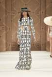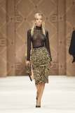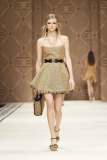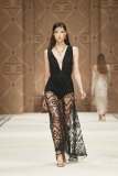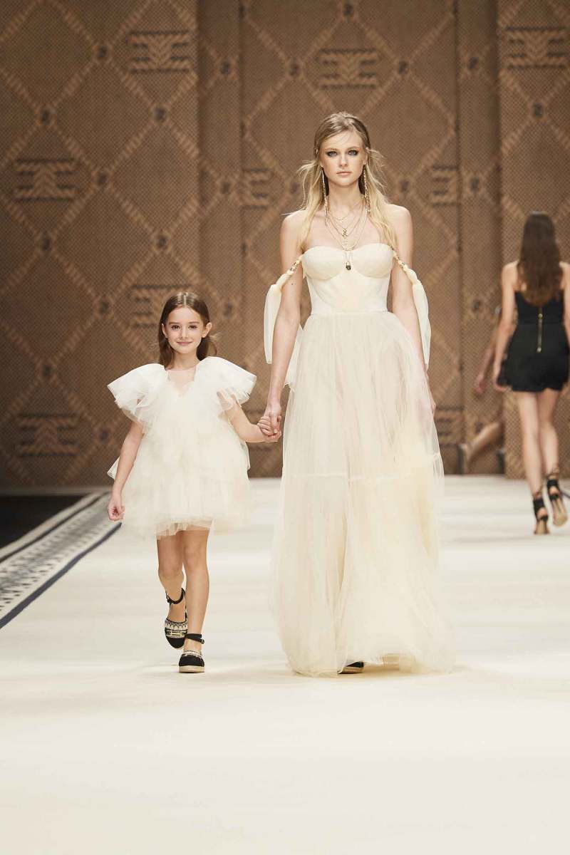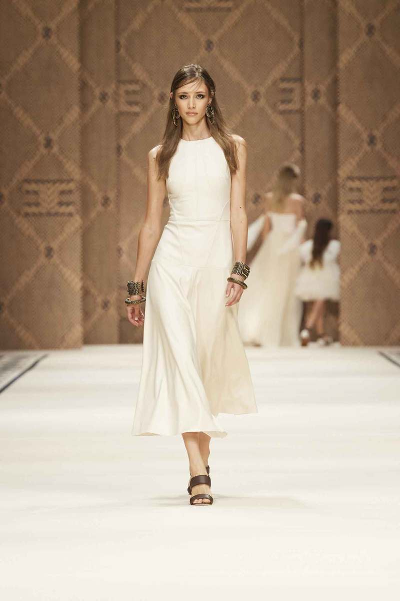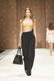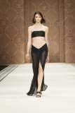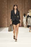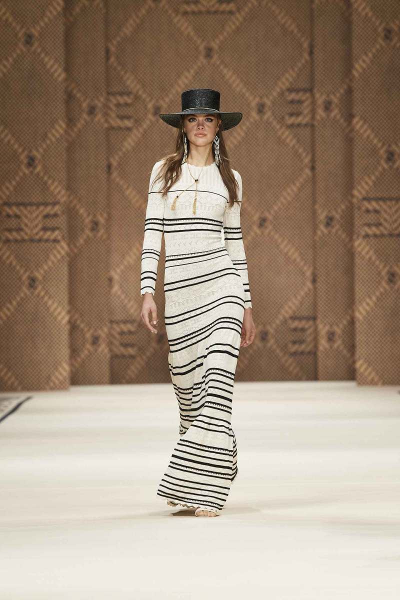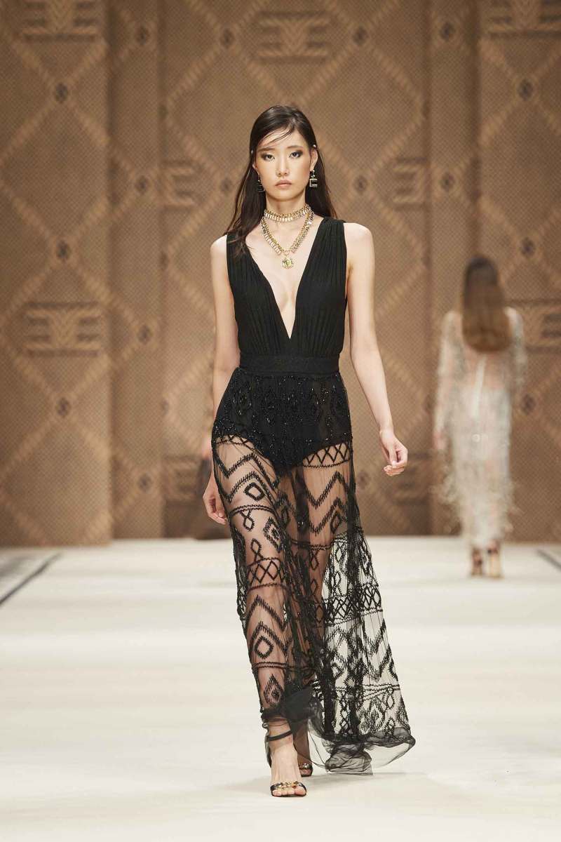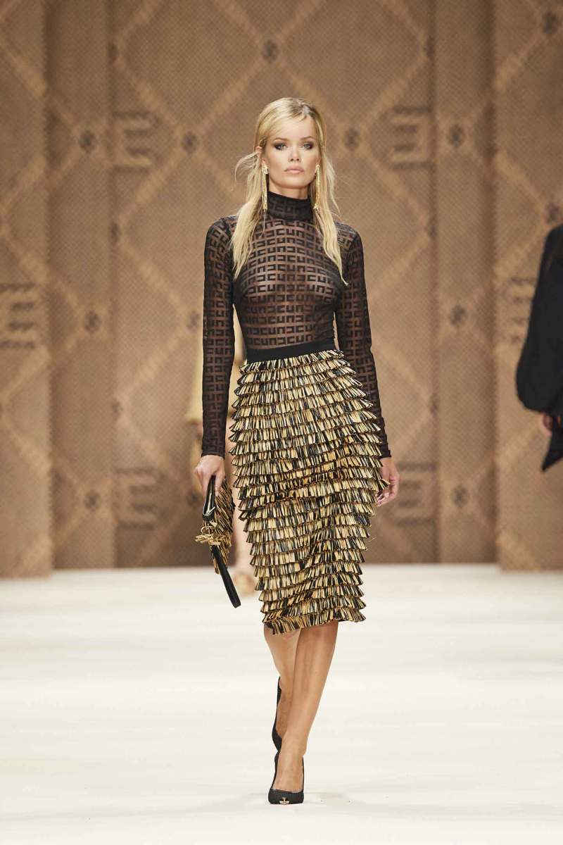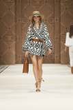 L’elemento delle frange, da sempre DNA di Elisabetta Franchi, è stato arricchito in questa nuova collezione da minuscole perle di legno. I colori della SS23 hanno virato da tonalità cioccolato al nero di seppia, alla liquirizia e al color burro. La rafia è stata grande protagonista e ha esaltato le silhouette di un abito, di una gonna e poi di un caban.