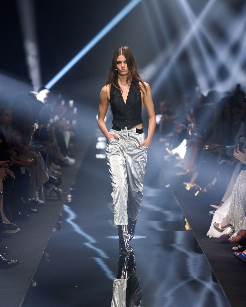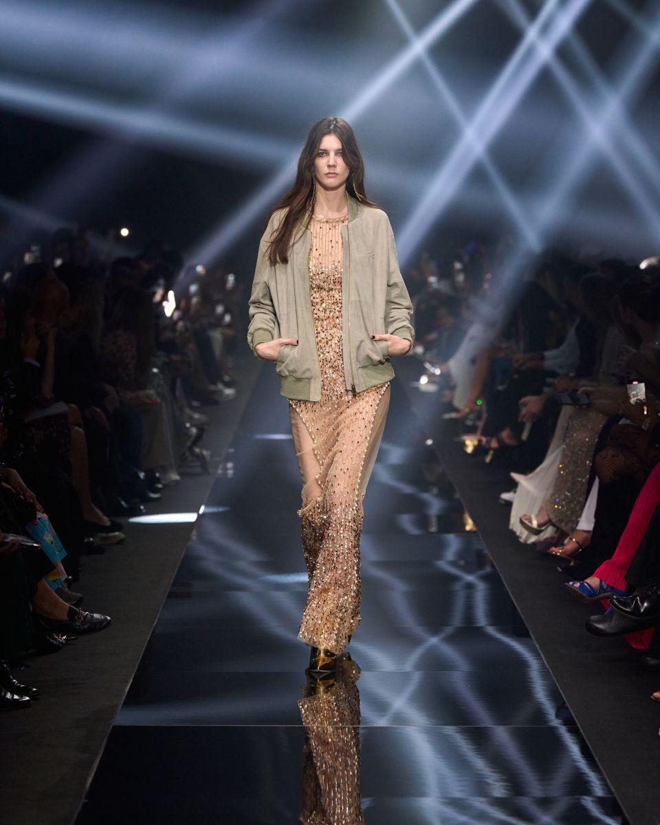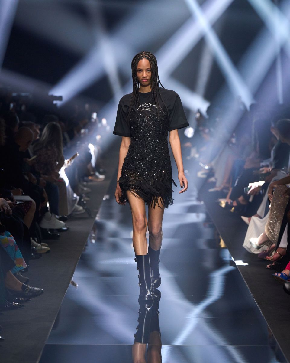 Una passerella che si trasforma in un concerto, quella di Elisabetta Franchi. Volumi che si contrappongono, capi dalle silhouette pulite, contrasti di proporzioni tra oversize e superfit. I micro short e i minidress si alternano a capi grintosi dall’animo rock e agli stivali biker.