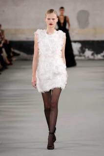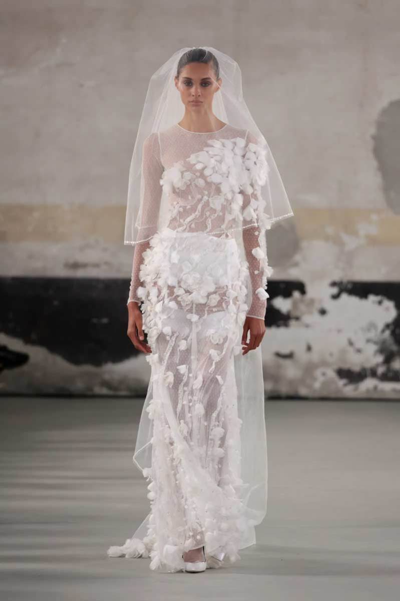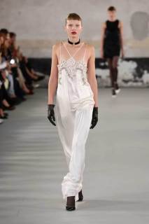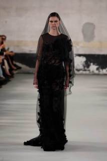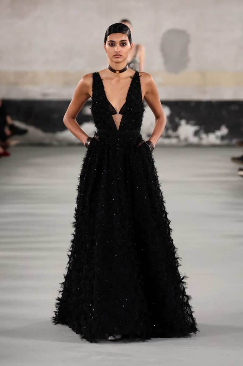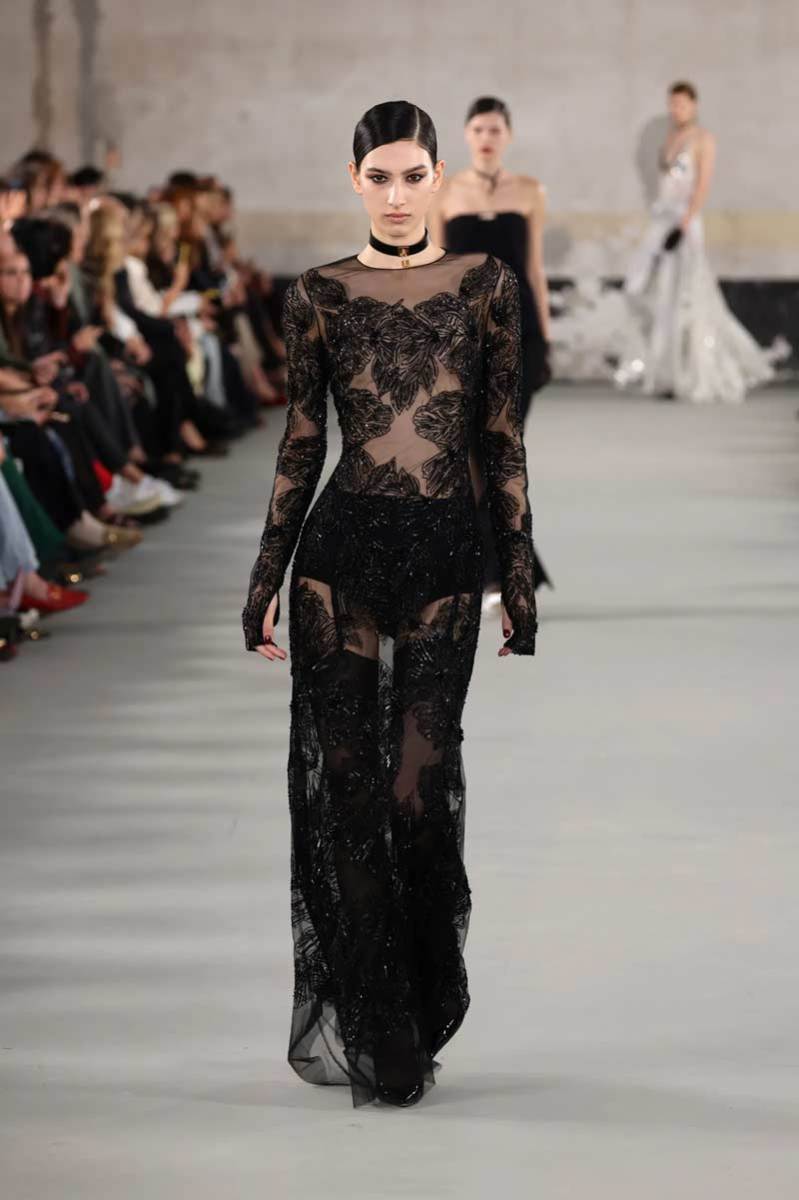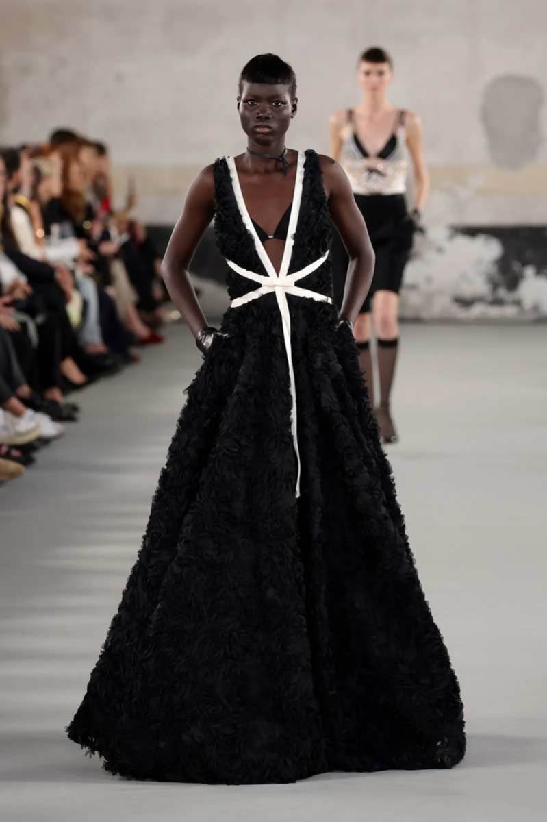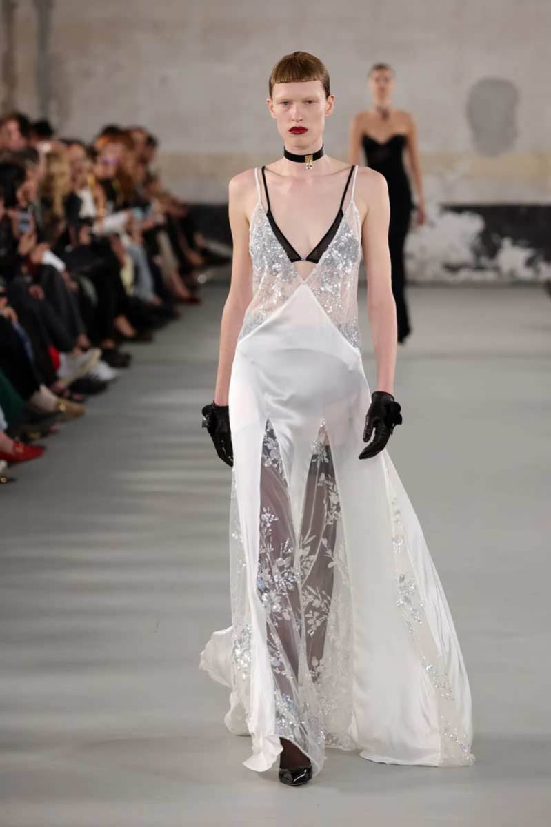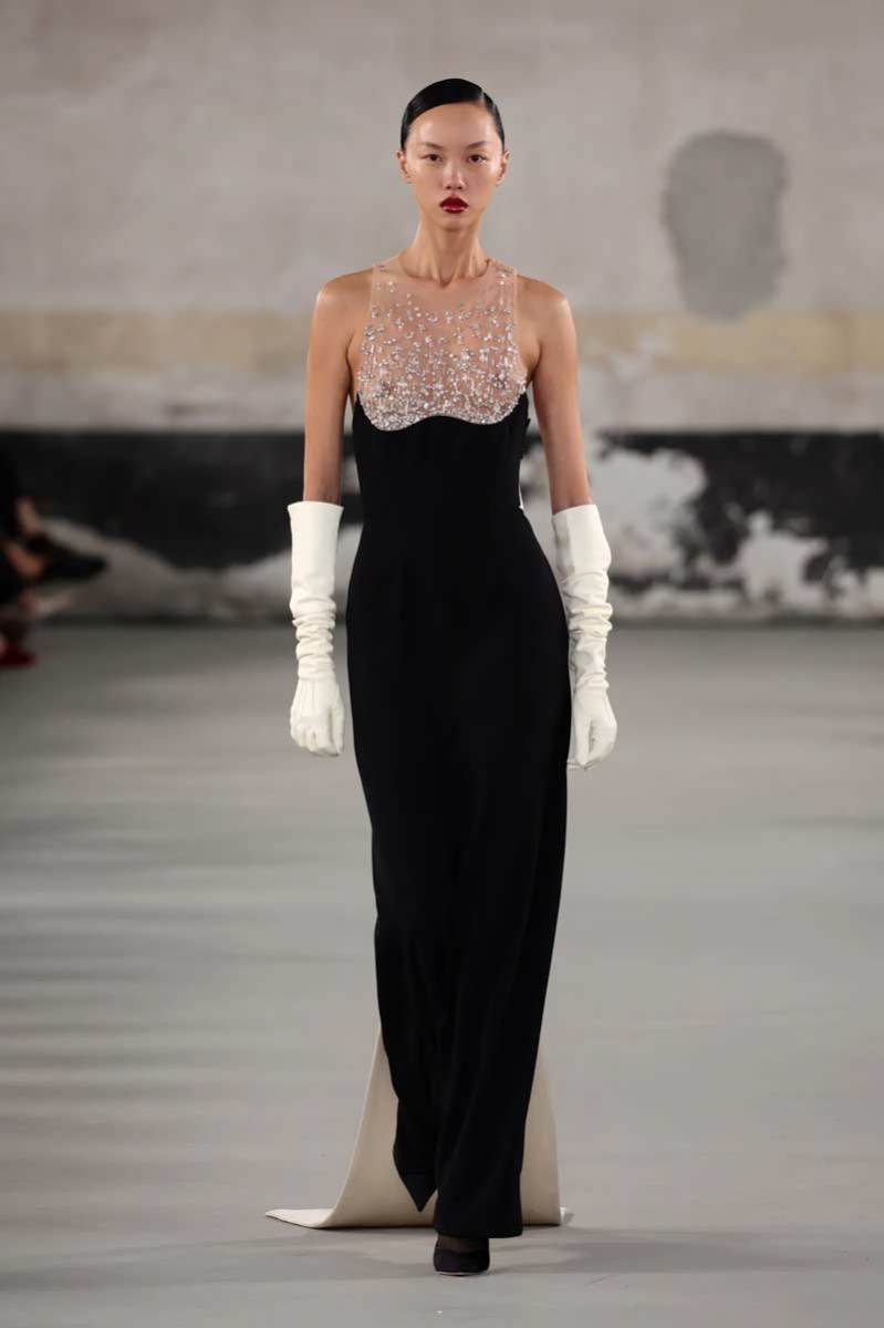 La giacca è la protagonista indiscussa di questa stagione, reinterpretata in chiave contemporanea e abbinata a pantaloni dal taglio maschile o a vestiti femminili, arricchiti da dettagli di corsetteria e lingerie. Il dualismo della collezione è evidente: tessuti strutturati si fondono con materiali delicati come tulle e organza di seta, in un gioco di trasparenze che esalta le forme femminili.