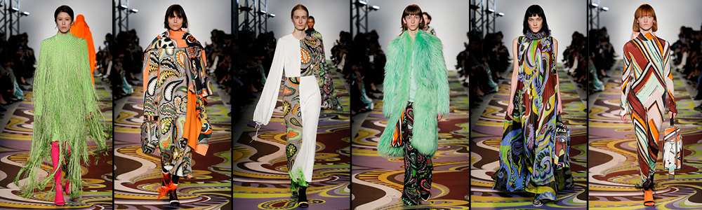 Non potevano mancare le iconiche stampe Pucci che appaiono su lunghi abiti, declinate su panno, velluto, o ricamate fino a sembrare quasi 3D. Quella che ha portato in passerella Giorgetti per la stagione F/W 2017-18 è una collezione dai toni accesi e forti; è un’atmosfera carica di tonalità ritempranti.