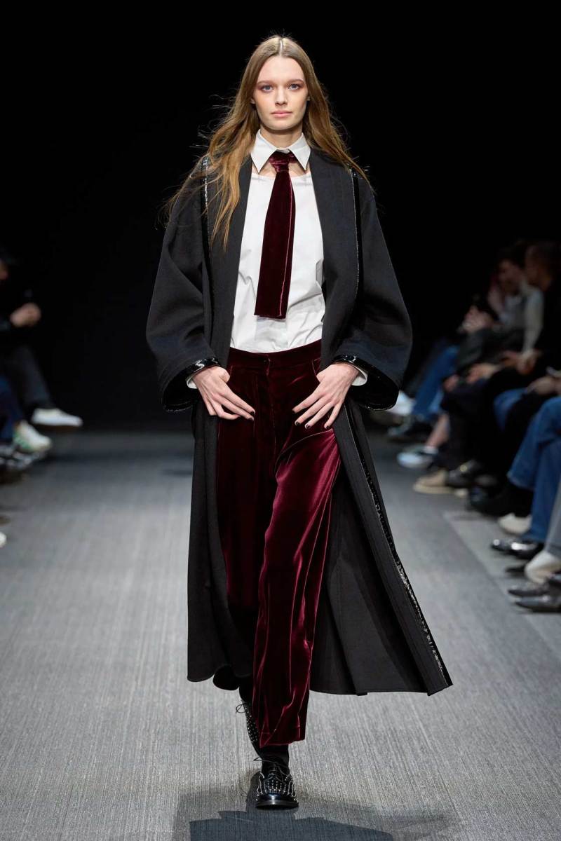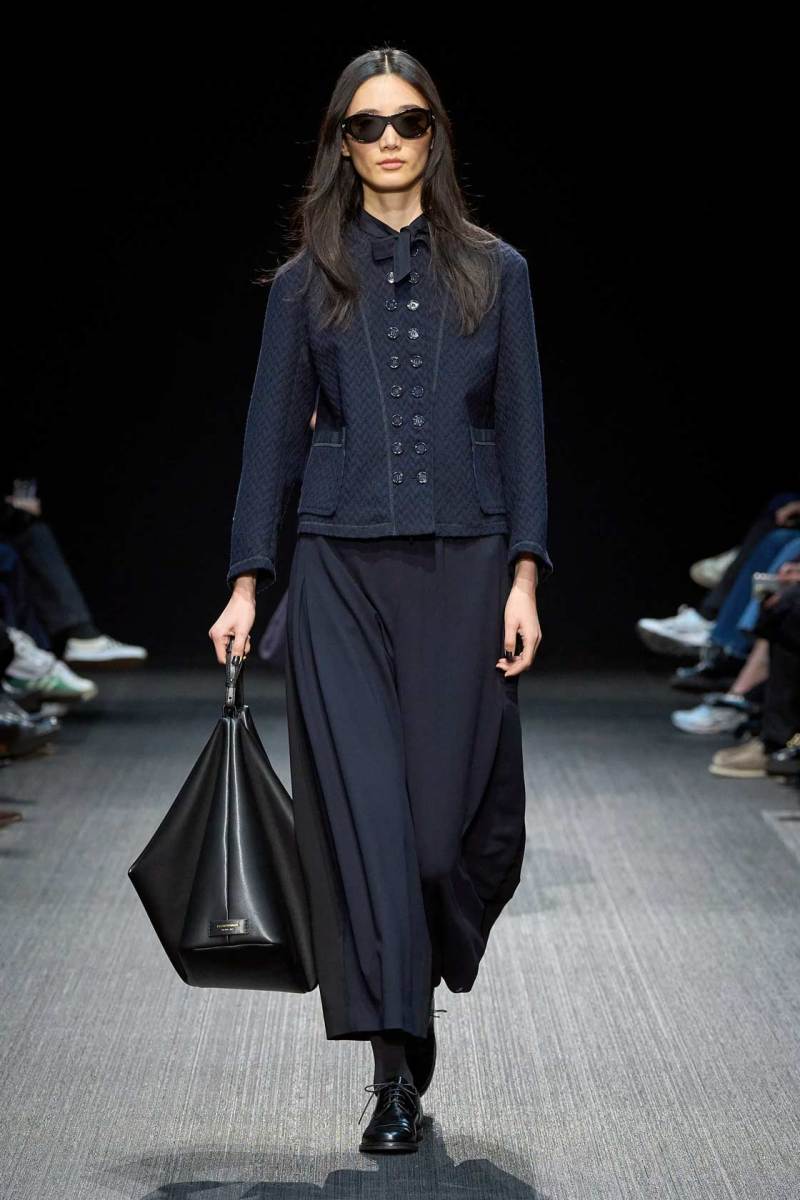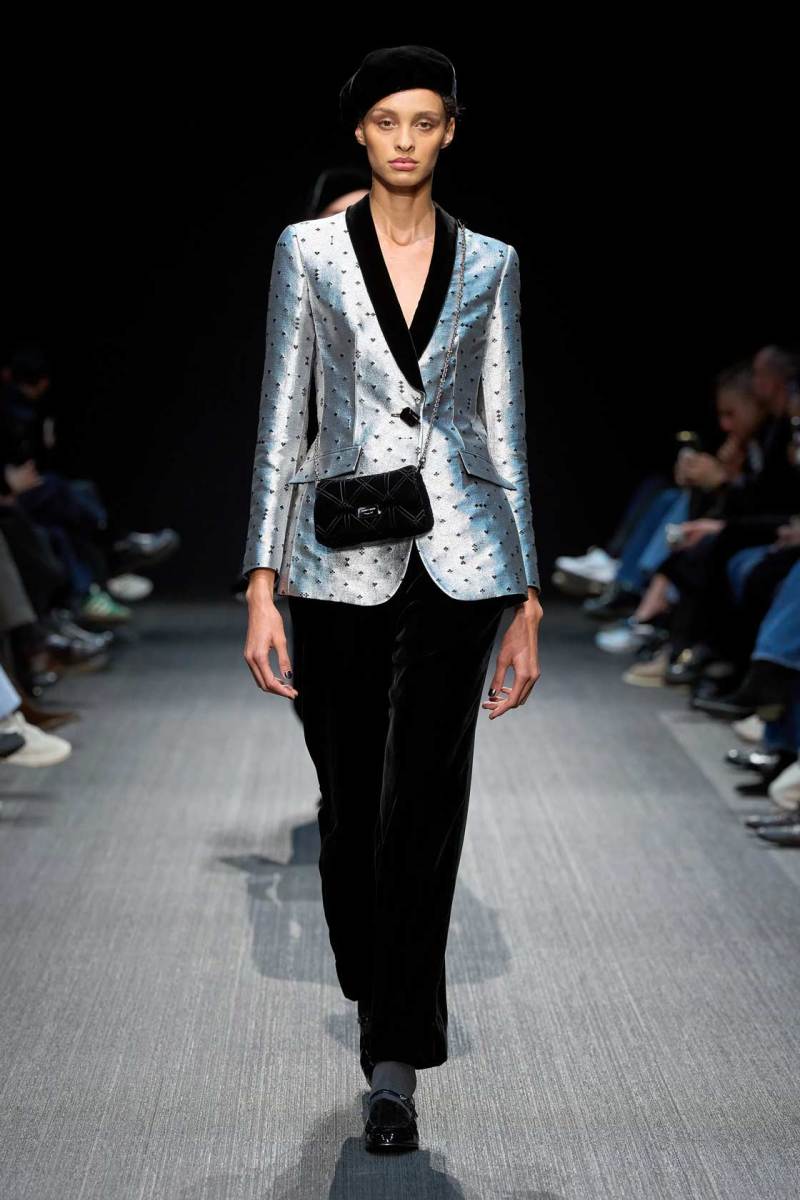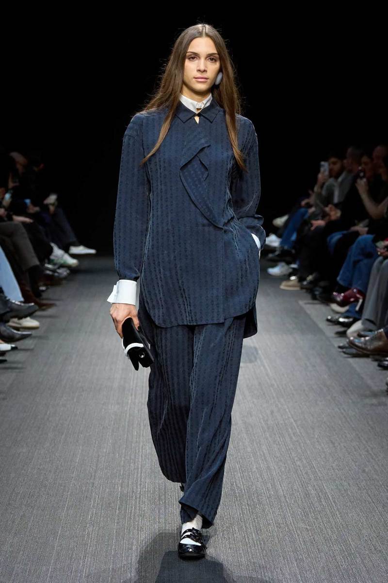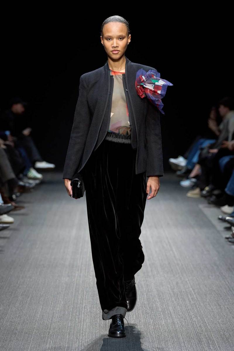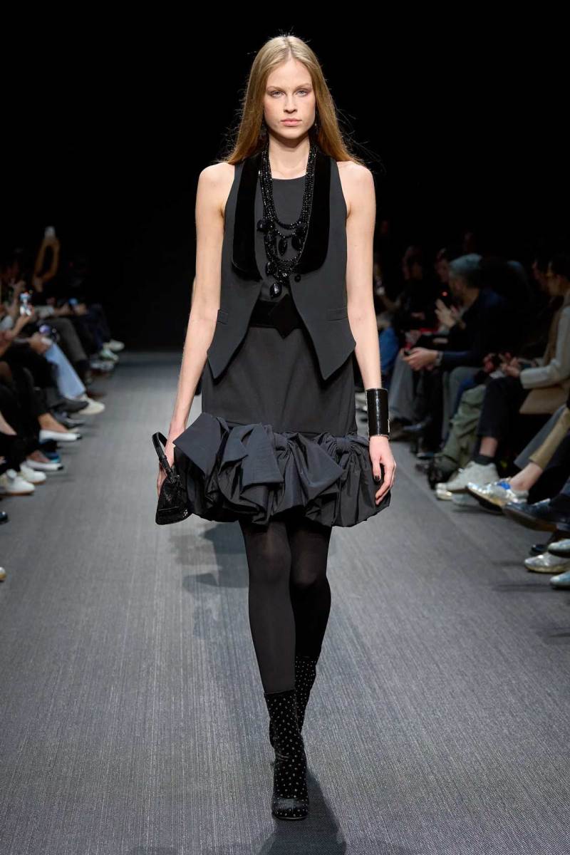 Armani continua a sfumare i confini tra tailoring maschile e sensualità femminile. Le modelle calcano la passerella con pantaloni ampi, cravatte in velluto e giacche strutturate, mentre abiti a trapezio con balze e fiocchi aggiungono un tocco di leggerezza. L’obiettivo è chiaro: superare le convenzioni, rendendo l’eleganza un territorio inclusivo e in continua evoluzione.