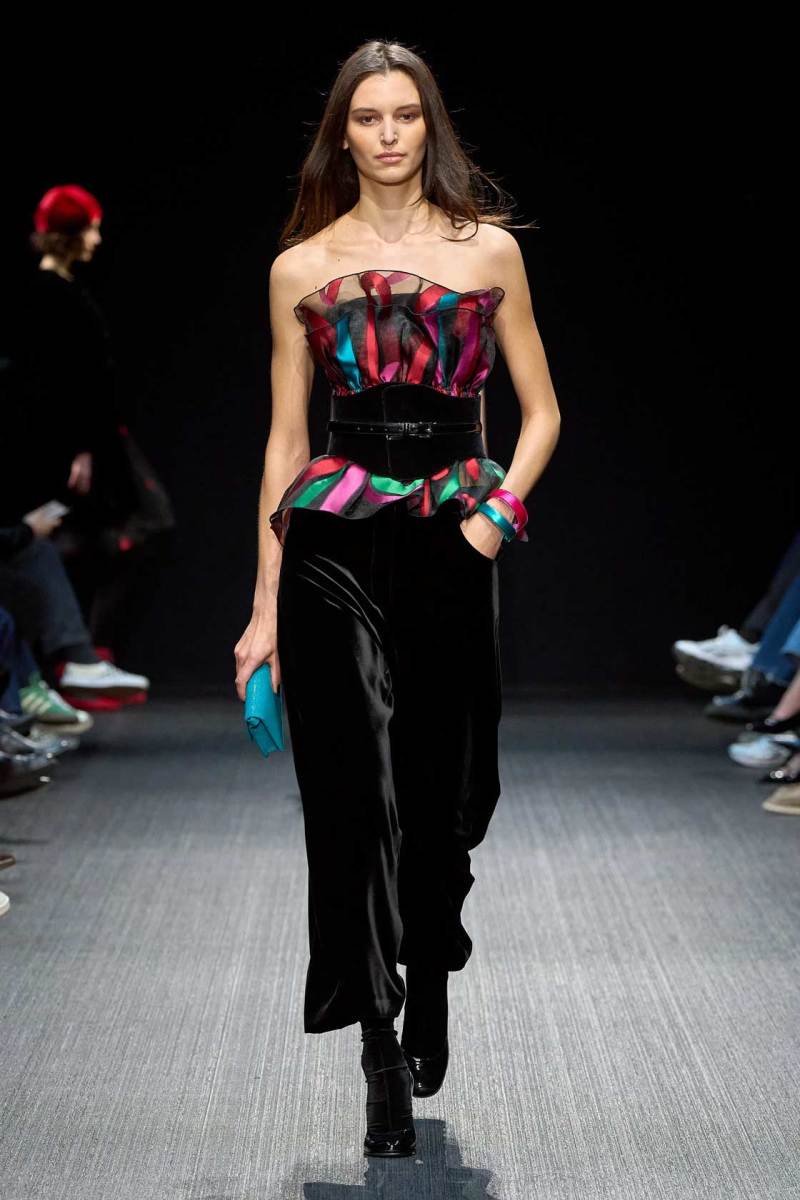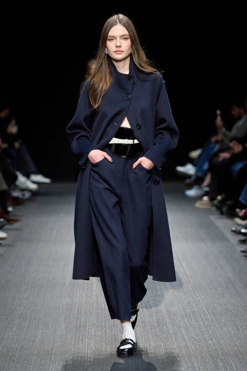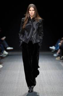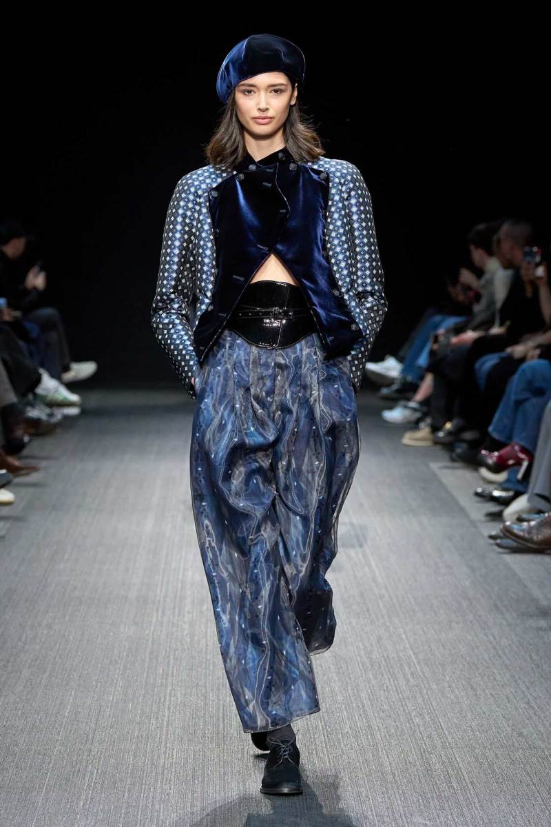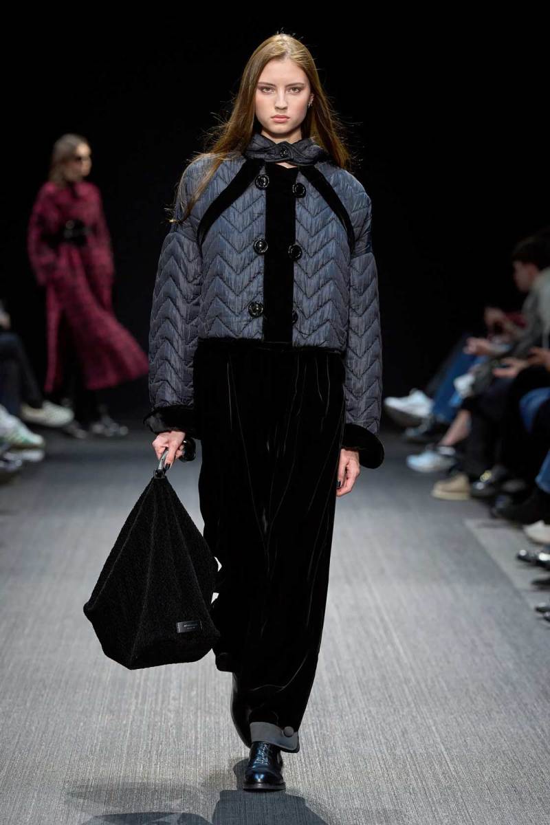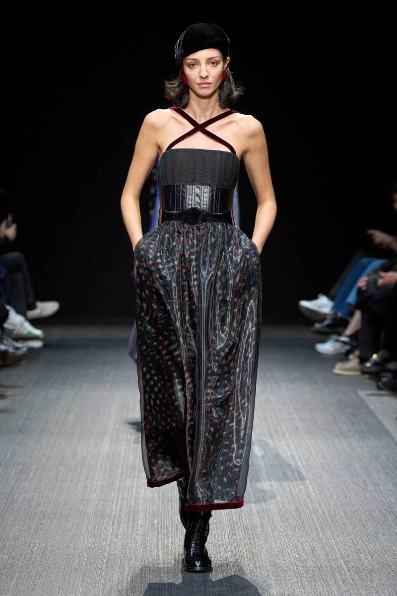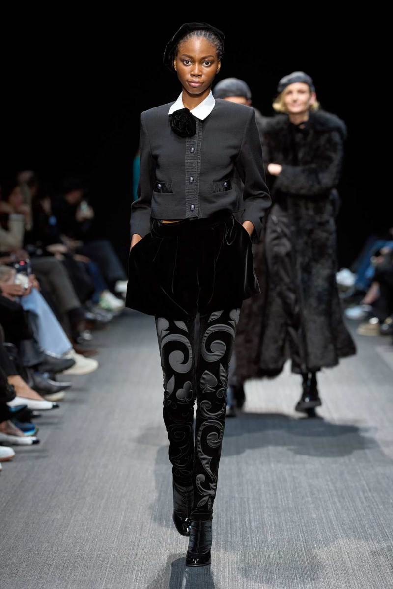Armani continua a sfumare i confini tra tailoring maschile e sensualità femminile. Le modelle calcano la passerella con pantaloni ampi, cravatte in velluto e giacche strutturate, mentre abiti a trapezio con balze e fiocchi aggiungono un tocco di leggerezza. L’obiettivo è chiaro: superare le convenzioni, rendendo l’eleganza un territorio inclusivo e in continua evoluzione.