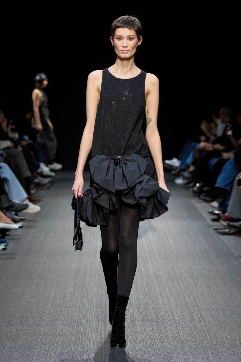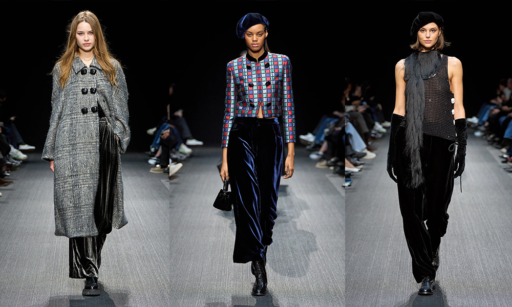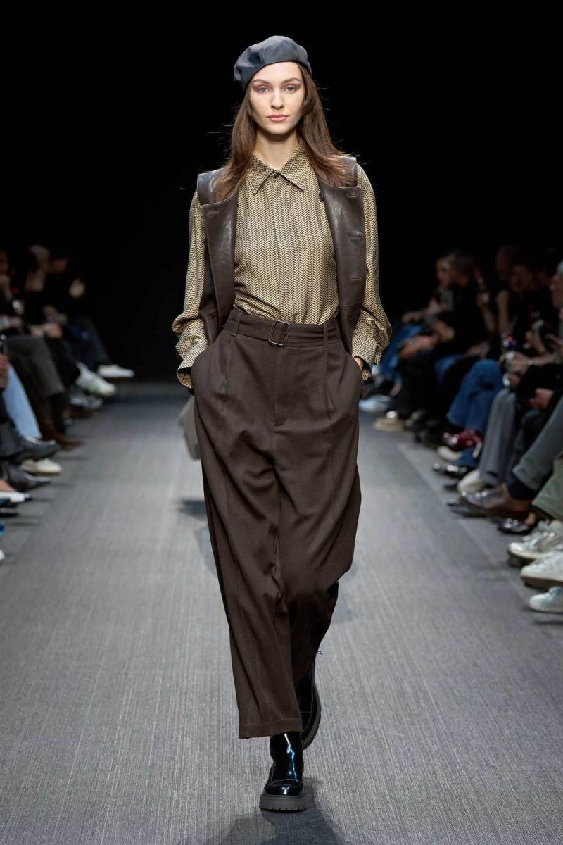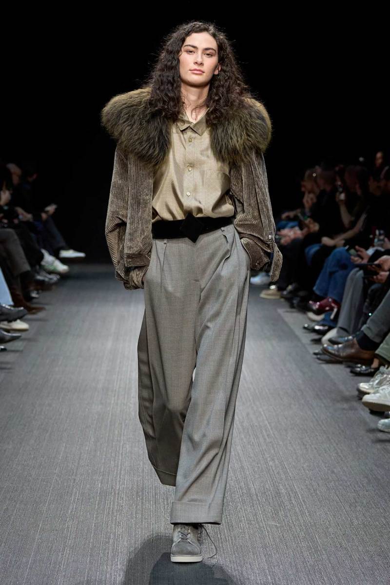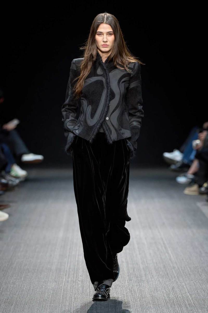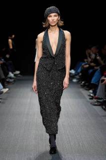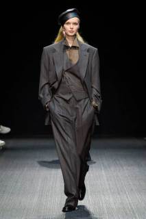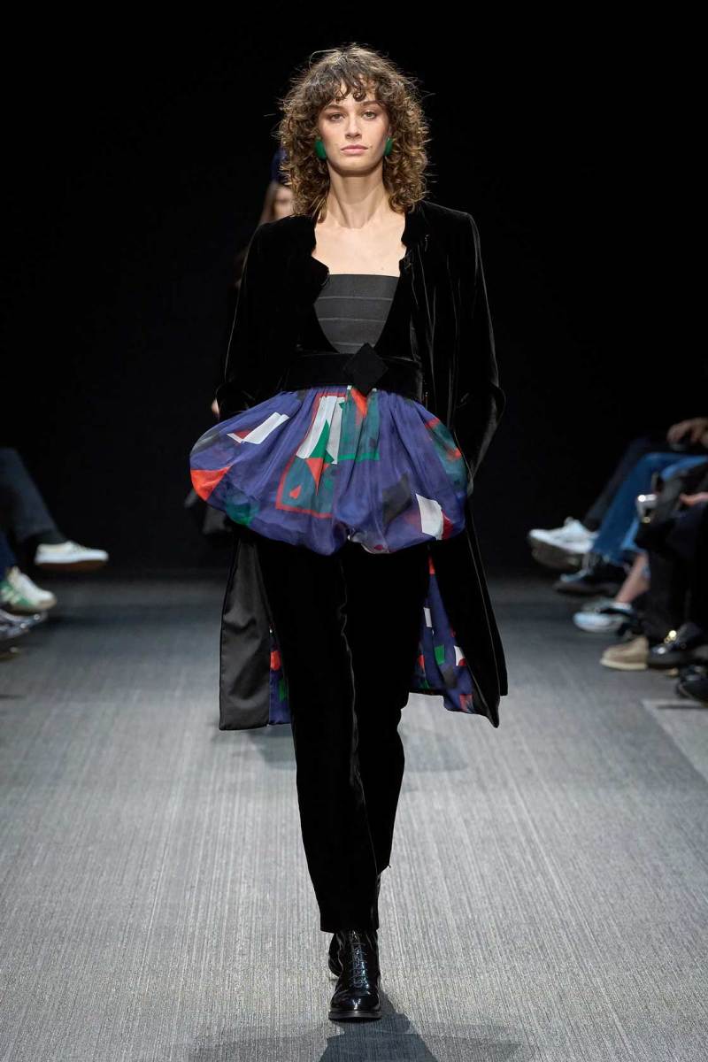 Armani continua a sfumare i confini tra tailoring maschile e sensualità femminile. Le modelle calcano la passerella con pantaloni ampi, cravatte in velluto e giacche strutturate, mentre abiti a trapezio con balze e fiocchi aggiungono un tocco di leggerezza. L’obiettivo è chiaro: superare le convenzioni, rendendo l’eleganza un territorio inclusivo e in continua evoluzione.