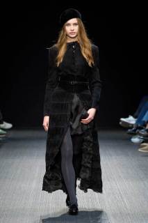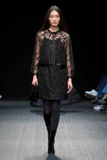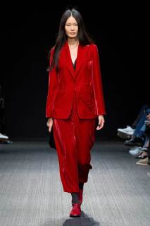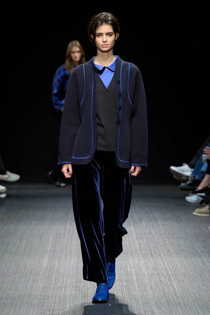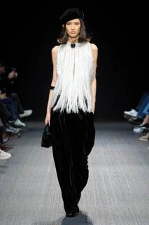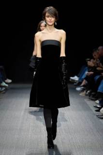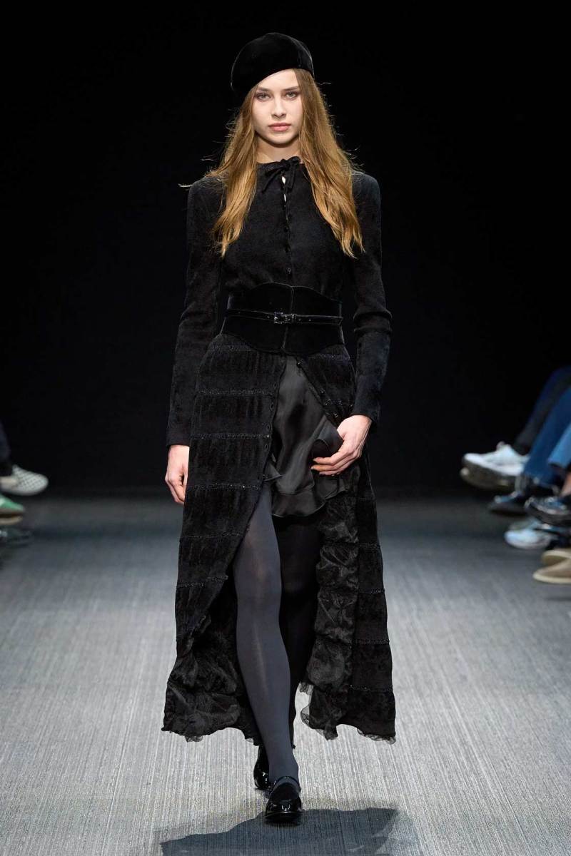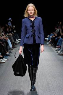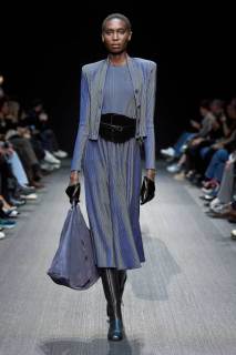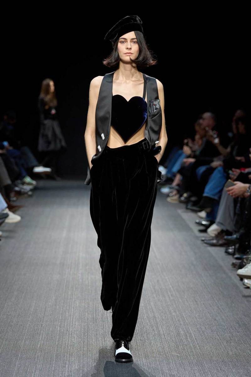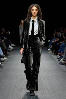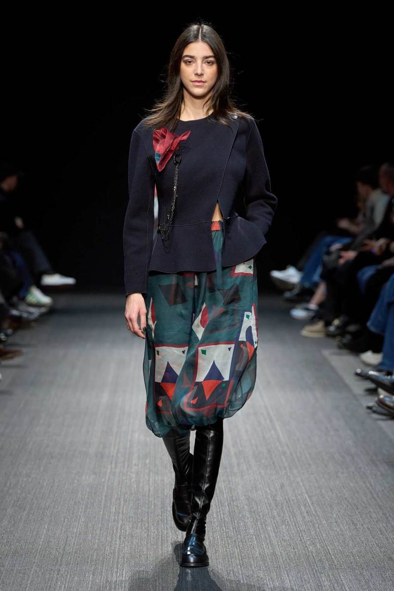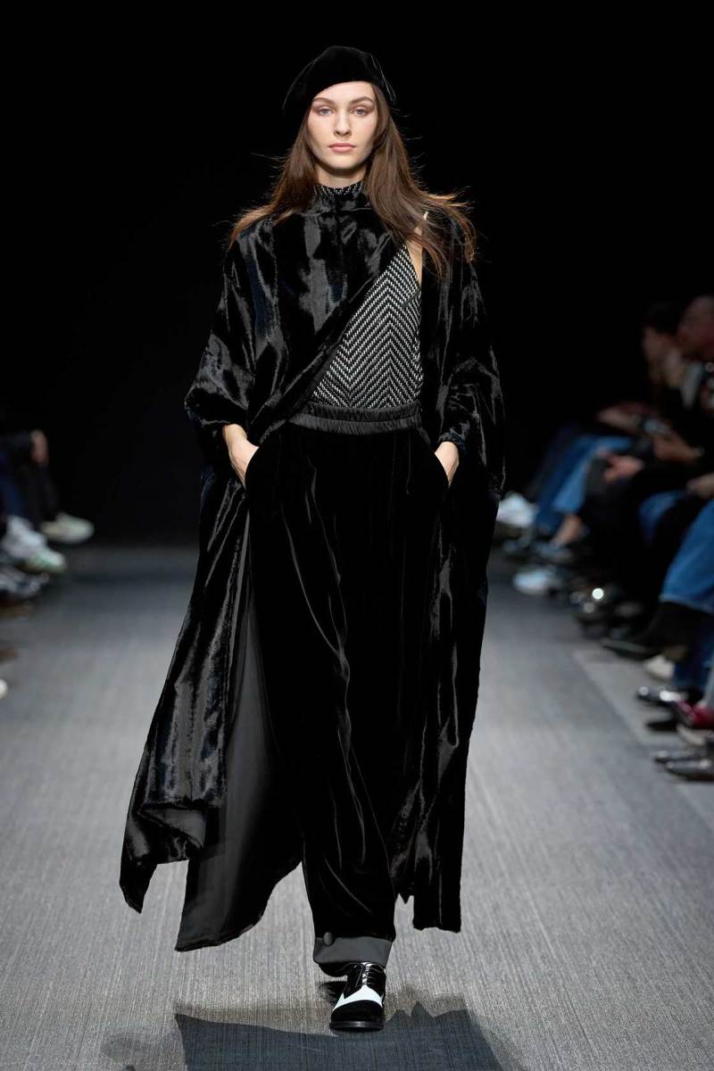 Armani continua a sfumare i confini tra tailoring maschile e sensualità femminile. Le modelle calcano la passerella con pantaloni ampi, cravatte in velluto e giacche strutturate, mentre abiti a trapezio con balze e fiocchi aggiungono un tocco di leggerezza. L’obiettivo è chiaro: superare le convenzioni, rendendo l’eleganza un territorio inclusivo e in continua evoluzione.