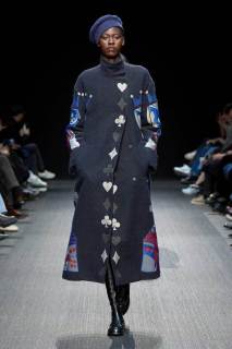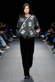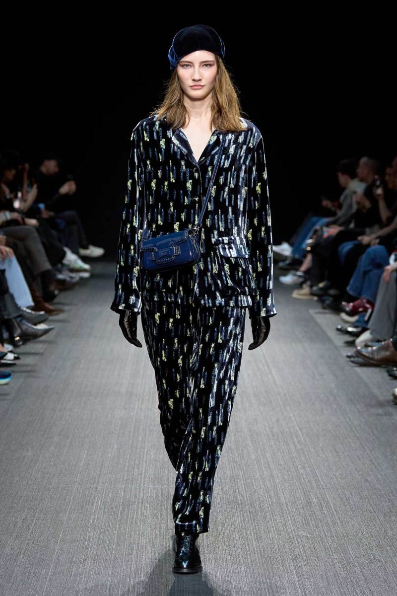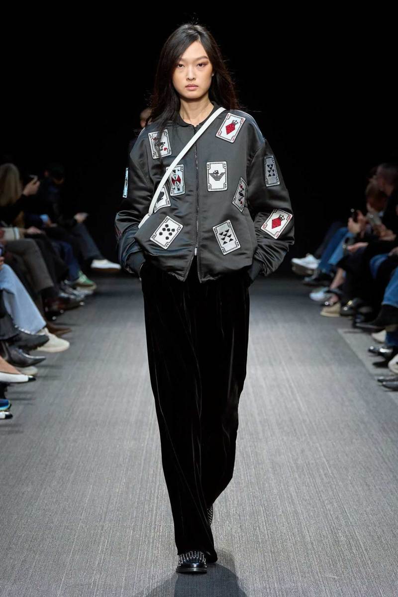 Le carte da gioco sono il leitmotiv della sfilata: assi di cuori e picche diventano intarsi, stampe e dettagli che emergono su giacche in velluto, cinture e tessuti pregiati. Ma Armani va oltre il semplice tema e gioca con le illusioni: colletti e polsini si trasformano in collane e bracciali, mocassini si allungano fino a diventare stivali, mentre i bottoni si reinventano in chiusure dal design scultoreo.