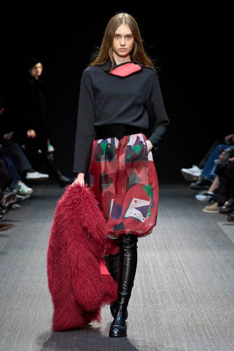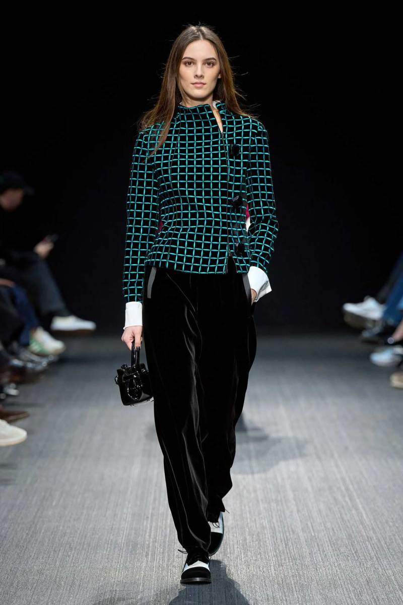 Il tutto si muove tra tagli sartoriali impeccabili e una palette sofisticata che accosta neutri sabbiosi, blu polverosi, rossi vibranti e verdi intensi, per poi chiudere con un classico bianco e nero grafico. La moda diventa una partita in cui nulla è scontato, e ogni look è un colpo di scena.