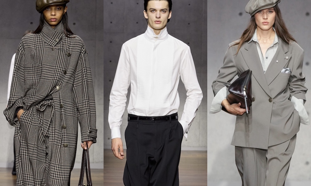 La collezione si distingue per un dialogo armonico tra classico e contemporaneo. Silhouette tradizionali, come blazer strutturati, camicie bianche e trench sartoriali, convivono con linee più fluide e tessuti leggeri, creando un guardaroba versatile e inclusivo. La palette cromatica, dominata da tonalità neutre e grigi sofisticati, sottolinea la volontà di trasmettere un’estetica di raffinata intellettualità, in cui maschile e femminile si incontrano senza perdere la loro identità.