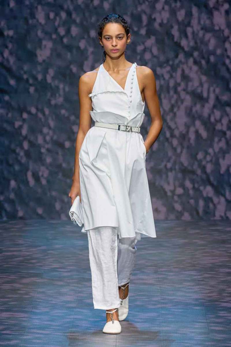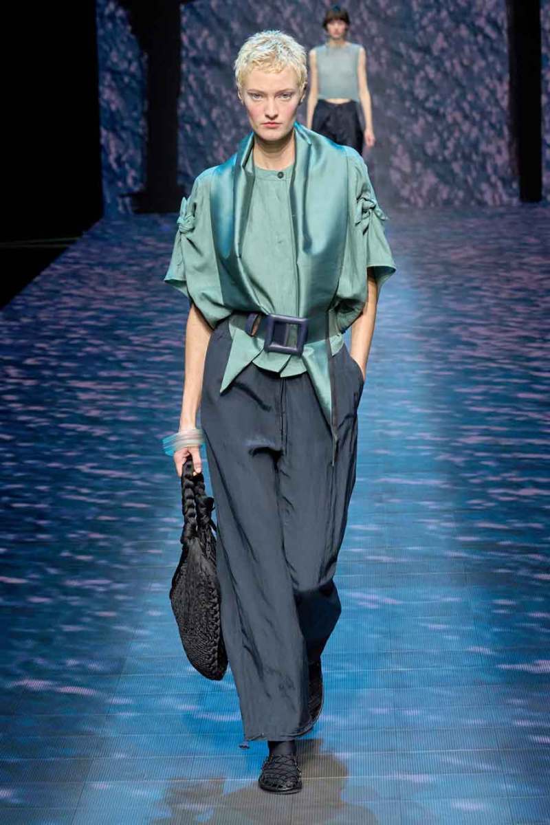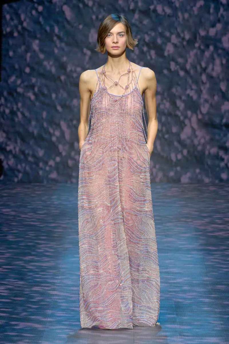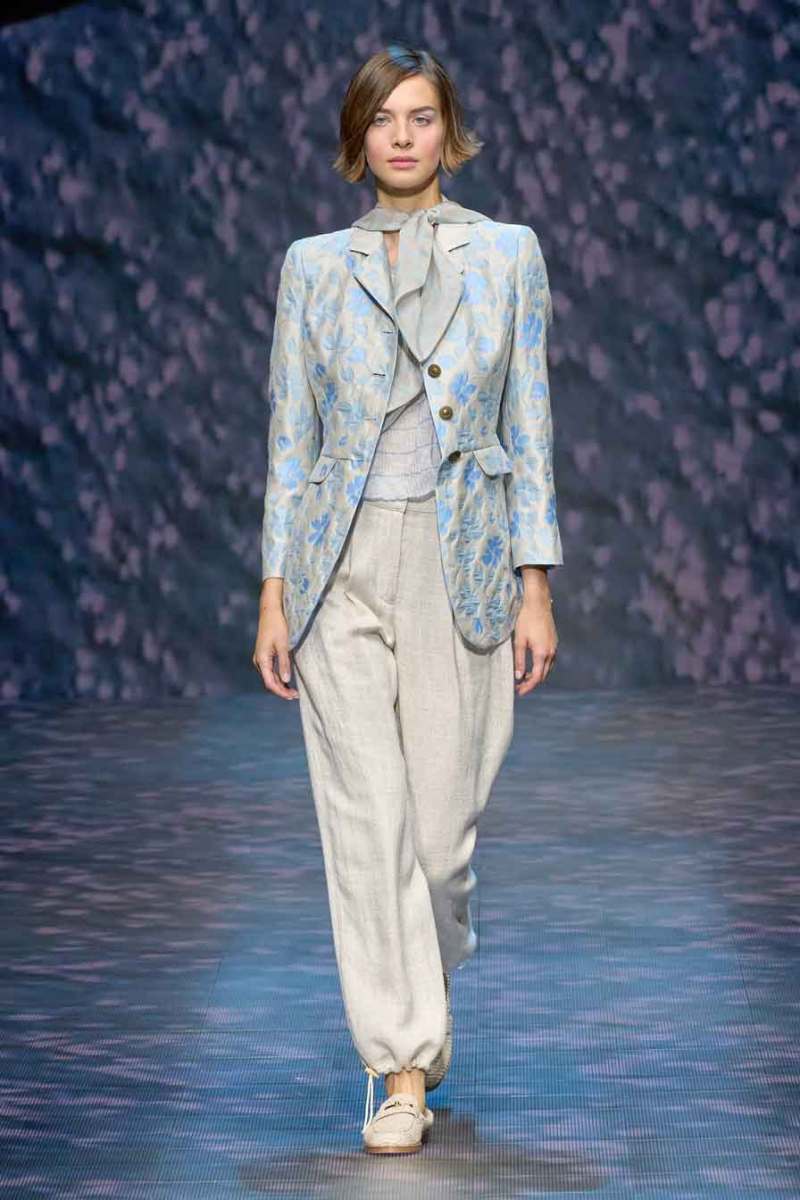 Le modelle sfilano avvolte da capi leggeri e fluttuanti. La palette di colori riprende i toni del bianco, il sabbia e i colori pastello. I tessuti sono morbidi e impalpabili, freschi e leggeri. Top impreziositi da cristalli e canotte con ricami scintillanti sono abbinati a pantaloni setosi e lunghe gonne. Blazer leggeri e morbide camicie sono accostati a pantaloni arabeggianti e gonne pareo, creando un irresistibile mix di stile cittadino e stile vacanziero. Gli abiti lunghi con applicazioni floreali sembrano ondeggiare delicatamente lasciando intravedere la silhouette in modo delicato. Naturalmente, tra gli outfit della donna che veste Emporio Armani non può mancare la giacca, classica o a spolverino, che viene abbinata a comodi pantaloni.
